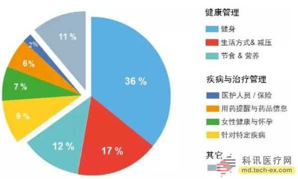 医护人员对于应用程序也表现出了极大的兴趣和热情,有超过一半的医生向病人建议使用移动医疗应用程序。据统计,专业医疗人士开具处方的Apps,85%是健康与疾病管理,15%是健康信息与医疗服务。涉及的领域很广,减肥、饮食健康与健身占比最高,为30%;戒烟、心理健康疾病占9%,其余都在1%-2%。