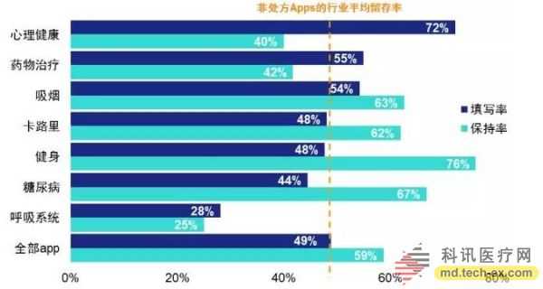 患者方面,也更愿意使用由医疗专业人士推荐的App。从典型的30天保留率来看,无论在心理健康疾病、糖尿病管理、呼吸病管理、药物治疗、戒烟、卡路里监控和减肥、健身和医疗健康相关的移动医疗应用程序,在由专业医疗人士开具处方移动医疗应用程序的使用,购买欲保留率都很高,高于平均值10个百分点。App“处方”平均装载率和App平均留存率如下图所示。