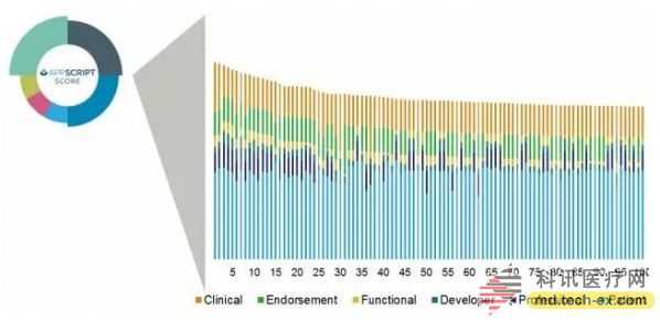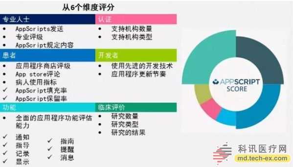 各个评级或认证平台都具有独特的评价体系和评分方法,对现有的App进行评价。如IMS的App Script解决方案,它是一个IMS第三方开发和推广的专利工具,医疗保健专业人士可用它为病人开具应用程序“处方”,并派生出一个有六个维度加权评分的App Script得分。App Script分数为所有利益相关方提供了一个全面的方法来评估移动医疗App的“处方”情况与使用情况。
