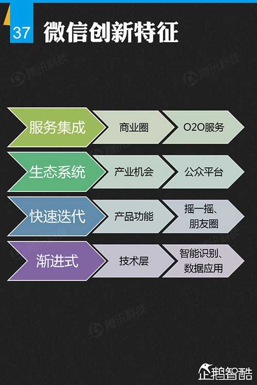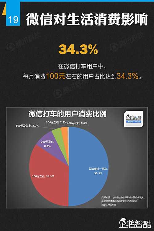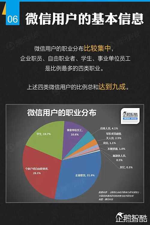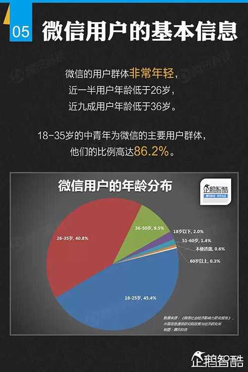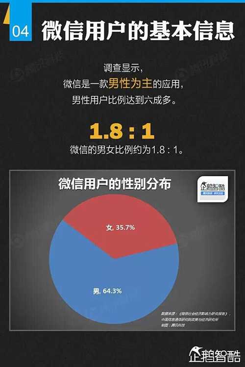 10月23日,微信官方发布了《微信生活》大数据报告,里面披露了很多微信产品大数据信息。如微信9月平均日登陆用户达到5亿7千万;微信在一线城市渗透率达到93%;微信每天活跃高峰从去年的22:30提前到今年的22:00,在此次微信生活报告发布之前,为了满足对微信用户基本特征、使用行为的了解,以及对微信在信息消费、社会服务等方面做调查研究的需要,企鹅智酷曾发布了40页的《首份微信影响力报告》PPT。