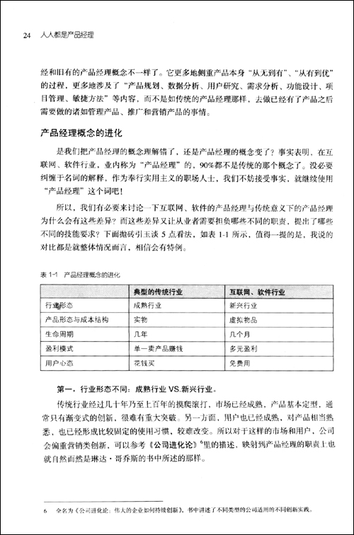写在正文之前 为什么会有这本书? 本书的产品定位 本书的风格与特色 本书的目录与内容 我与本书的局限性第1章 写给-1到3岁的产品经理 1.1 为什么要做产品经理 1.2 我们到底是不是产品经理 1.3 我真的想做,怎么入行 1.4 一个产品经理的-1到3岁第2章 一个需求的奋斗史 2.1 从用户中来到用户中去 2.1.1 用户是需求之源 2.1.2 你真的了解用户么? 2.2 需求采集的大生产运动 2.2.1 定性地说:用户访谈 2.2.2 定量地说:调查问卷 2.2.3 定性地做:可用性测试 2.2.4 定量地做:数据分析 2.2.5 需求采集人人有责 2.3 听用户的但不要照着做 2.3.1 明确我们存在的价值 2.3.2 给需求做一次DNA检测 2.4 活下来的永远是少数 2.4.1 永远忘不掉的那场战争 2.4.2 别灰心,少做就是多做 2.5 心急吃不了热豆腐 第3章 项目的坎坷一生 3.1 从产品到项目 3.2 一切从KickOff开始 3.3 关键的青春期,又见需求 3.3.1 真的要写很多文档 3.3.2 需求活在项目中 3.4 成长,一步一个脚印 3.5 山寨级项目管理 3.5.1 文档只是手段 3.5.2 流程也是手段 3.5.3 敏捷更是手段 3.6 物竞天择适者生存 3.6.1 亲历过的特色项目 3.6.2 一路坎坷,你我同行 第4章 我的产品,我的团队 4.1 大产品,大设计,大团队 4.1.1 产品之大 4.1.2 设计之大 4.1.3 团队之大 4.2 游走子商业与技术之间 4.2.1 心思缜密的规划师 4.2.2 激情四射的设计师 4.2.3 “阴险狡诈”的运营师 4.3 商业团队,冲锋陷阵 4.3.1 好产品还需市场化 4.3.2 我们还能做什么 4.4 技术团队,坚强后盾 4.5 容易被遗忘的角落 4.6 大家好才是真的好 4.6.1 所谓团队文化 4.6.2 虚无的无授权领导 第5章 别让灵魂跟不上脚步 5.1 触及产品的灵魂 5.2 可行性分析三步曲 5.2.1 我们在哪儿 5.2.2 我们去哪儿 5.2.3 我们怎么去 5.3 做吧,准备出发! 5.3.1 敢问路在何方 5.3.2 低头走路,抬头看天 5.4 KPI,KPI,KPI! 5.5 本书的源头活水 第6章 产品经理的自我修养 6.1 爱生活,才会爱产品 6.2 有理想,就不会变咸鱼 6.3 会思考,活到老学到老 6.4 能沟通,在什么山头唱什么歌 6.5 产品经理主义 附录:它山之石可以攻玉 别人眼中的产品经理 各种有用的信息