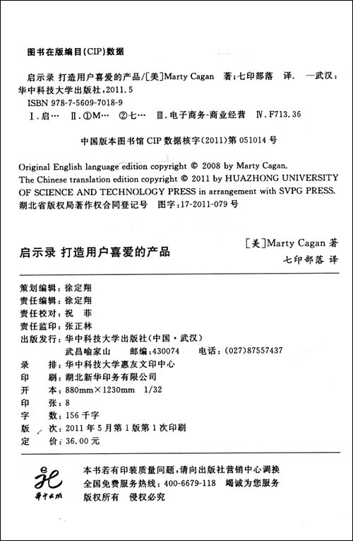 在国内的IT行业里,大家习惯把翻译外文资源的工作称为汉化。本书的 “汉化”工作是在互联网上开展的。 十五位译者都是从网上征集来的。感谢《人人都是产品经理》的作者苏 杰和《结网》的作者王坚,他俩分别在自己的微博上发布了征集译者的消息 。苏杰还特地在个人博客上详细地介绍了原著的特色和作者Marty Cagan。 在短短两周时间内就有四十多位网友申请参与翻译。 我们在网络办公平台上共享英文原稿,协作翻译,还搭建了网上论坛, 及时沟通、交流,便于大家解决翻译问题,统一专业术语的译法。翻译分工 采取自愿原则,大家自行选择感兴趣的章节翻译,然后交叉审校,相互提建 议。初步译完后,又邀请网友试读,以完善译稿。集中式的信息共享平台和 信息发布平台大大提高了沟通效率。每个人的工作都详细记录在书后的翻译 审校试读名单里。 苏杰还在微博上发起公开投票,挑选书名。网友对“启示录”三个字青 睐有加。这个译法是译者孙洋提出来的。“启示录”原是《新约圣经》最后 一章的标题,它描写的是耶稣向门徒约翰现身,展示人类未来的故事。孙洋 还建议为翻译团队取名七印部落。七印是“启示录”中耶稣预言的七件大事 。我们选这个名字,取其使命感和神秘感之意。翻译团队的使命是尽力将作 者的想法传达给读者。神秘感是指团队隐身于互联网中,大家素未谋面,却 通力合作。 该书翻译完成后,我们获得作者的许可,继续在网上征集志愿者翻译他 的博客文章。这是一项公益活动,文章会陆续发布在网上,部分文章还会刊 登在《程序员》杂志上。如果你也感兴趣,请联系: amelie.h.lin@gmail.com,欢迎加入我们。 以下是部分译者、试读者的翻译感言,排序不分先后。如果有些感言读 起来像广告,还请体谅我们急切推荐这本书的心情。 林云源:通过阅读这本书,我认为产品经理首先应该学习管理产品团队 ,其次才是发掘产品创意和开发产品。在中国“山寨产品”横行之际,作者 多年的工作经验尤其值得中国同行学习。 韦文凯:我翻译得很慢,一边翻译,一边思考如何把书里的内容运用到 实际工作中。希望你也慢慢读,慢慢品味。我保证书里的思想和方法会让你 受益匪浅。 孙洋:从某种程度上讲,开发产品就像编织一场精彩的梦境,问题是你 能发现用户内心深处那个旋转的陀螺吗? 苏杰:这本书能够以这种创新的方式翻译完成,要感谢互联网,当然, 还要感谢七印部落。我把这本书看成自己参与创作的产品,它的诞生让我收 获巨大,感触良多。 唐丰能:虽然互联网产品出现的时间不长,但是竞争相当激烈,单凭好 创意已经不足以保证产品成功了。行业对产品经理的要求越来越高,我们急 需一套行之有效的管理产品的方法。这本书让我茅塞顿开,相信你读后会有 同样的感受。 单雪雯:想彻底看懂一本英文书,最好的办法莫过于翻译一遍。很高兴 参加翻译,第一时间学习作者管理产品的经验。 黄捷文:翻译是一种深入的学习,它加深了我对书中产品概念和工作流 程的理解。大伙的审校建议和讨论让我获益良多。书中有不少战略层面的观 点,虽然还没来得及在实际工作中运用,但也深化了我的思考。很多章节值 得反复阅读。 七印部落 2011年3月20日