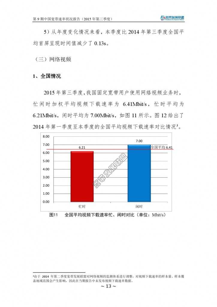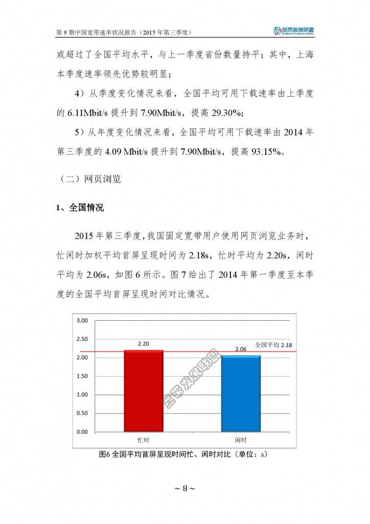 对2015年第3季度国内固定宽带用户访问互联网时的用户上网体验情况进行了报告。数据显示:2015年第3季度,中国固定宽带互联网网络平均网络下载速率达到7.90 Mbit/s,用户进行网页浏览的平均首屏呈现时间为2.18s,平均视频下载速率为6.41Mbit/s,全国基础电信企业签约用户的平均固定宽带接入速率符合度为113.09%。