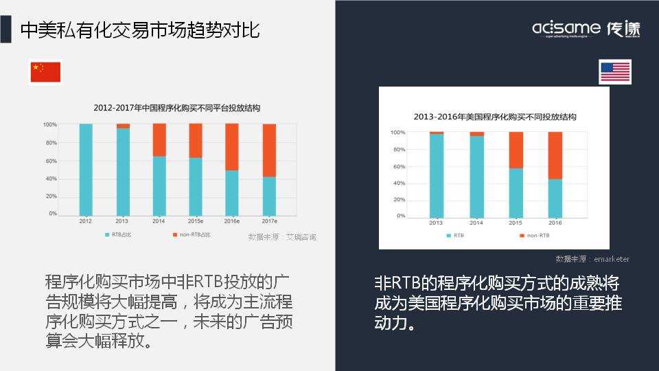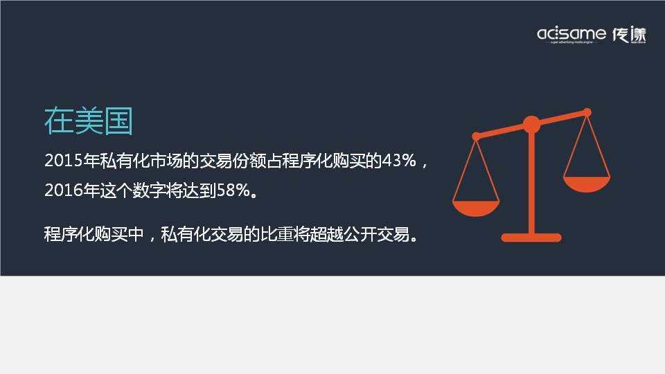 随着PMP私有交易市场的出现,越来越多的品牌广告主更加看重它所带来的优质资源,这也令私有市场在近几年的涨势大幅提升。通过中美私有化交易市场的对比,王跃提到,美国2015年私有化市场的交易份额占程序化购买的43%,2016年这个数字将达到58%。程序化购买中,私有化交易的比重将超越公开交易,非RTB程序化购买方式的成熟将成为美国程序化购买市场的重要推动力。而这也将成为中国程序化购买市场的未来主力军。