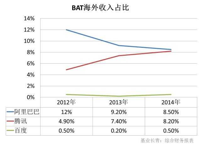 按理说BAT具有先天的国际化血统,国际化资本、国际化团队、开放的全球化互联网商业模式,应该能够帮助企业快速实现海外拓展。经过十年的努力,BAT近年的海外业务成绩单如下: