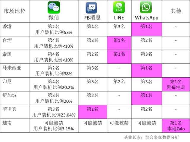 发展中市场是腾讯当前的主要目标市场:但拉美由Whatsapp一统天下,超过90%;腾讯当前主要优势市场在港台地区和东南亚,其市场格局如下: