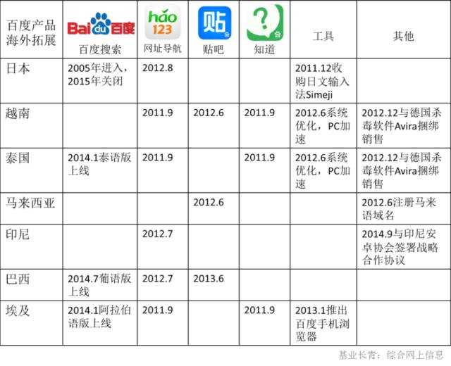 第二阶段:市场上“农村包围城市”,技术上苦练内功。2011年开始,百度从新兴国家入手,重新开启国际化之旅。海外策略采取“大网撒、重点抓”的产品拓展方式,在越南、泰国、印尼、马来西亚、巴西等国家,利用hao123、贴吧、知道、杀毒、浏览器等一系列工具类应用先行,为推出搜索引擎建立基础。百度海外布局初具规模: