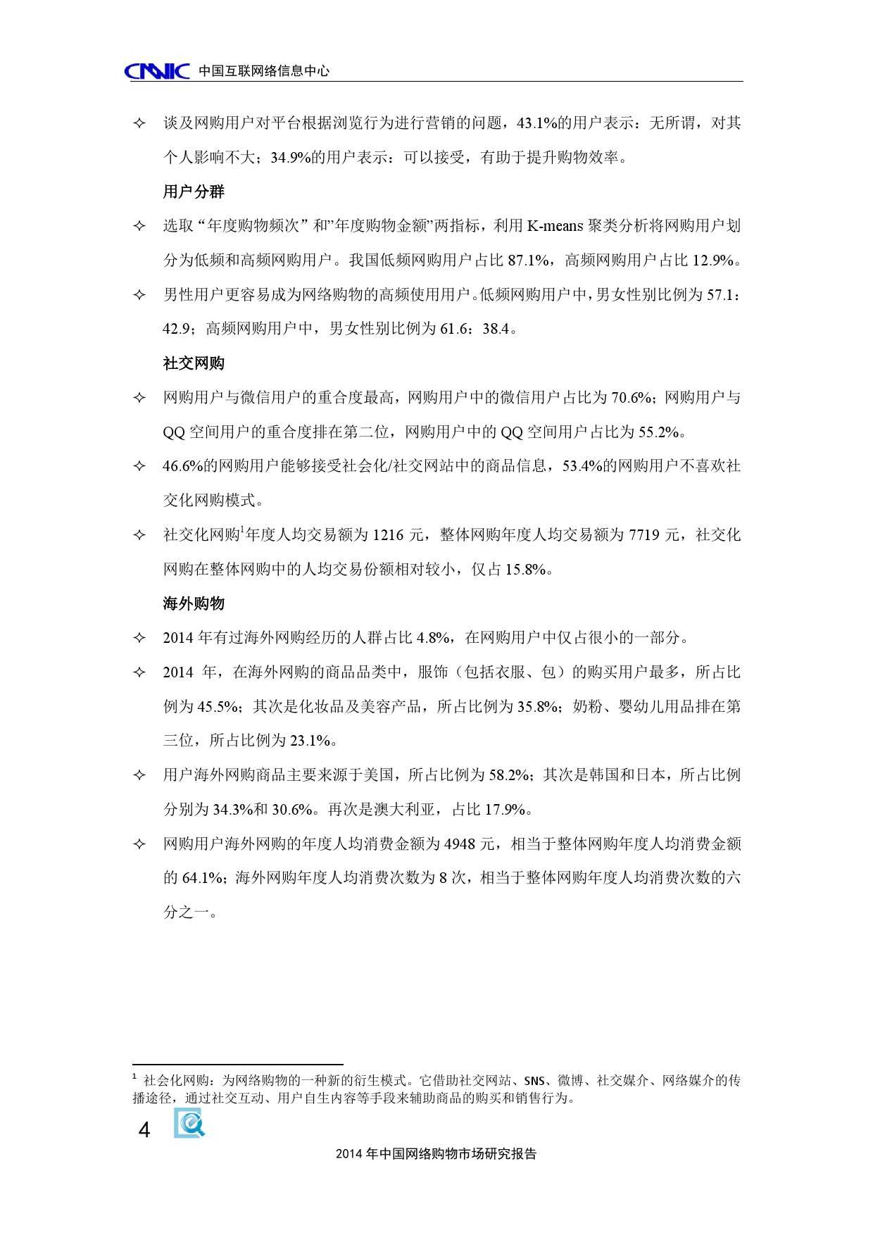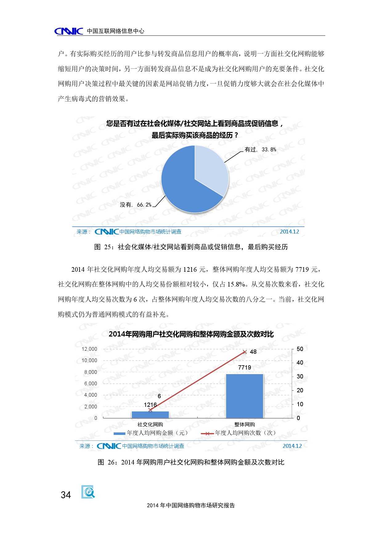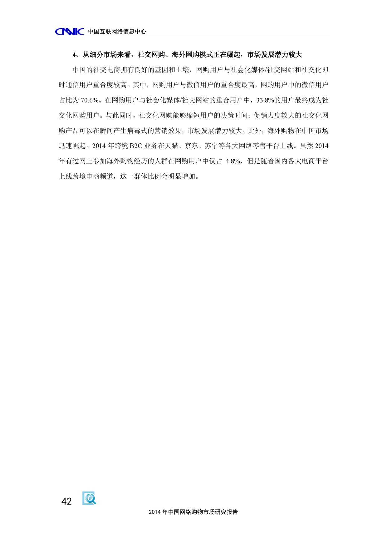 中国的社交电商拥有良好的基因和土壤,网购用户与社会化媒体/社交网站和社交化即时通信用户重合度较高。其中,网购用户与微信用户的重合度最高,网购用户中的微信用户占比为70.6%。在网购用户与社会化媒体/社交网站的重合用户中,33.8%的用户最终成为社交化网购用户。与此同时,社交化网购能够缩短用户的决策时间;促销力度较大的社交化网购产品可以在瞬间产生病毒式的营销效果,市场发展潜力较大。此外,海外购物在中国市场迅速崛起。2014年跨境B2C业务在天猫、京东、苏宁等各大网络零售平台上线。虽然2014年有过网上参加海外购物经历的人群在网购用户中仅占4.8%,但是随着国内各大电商平台上线跨境电商频道,这一群体比例会明显增加。