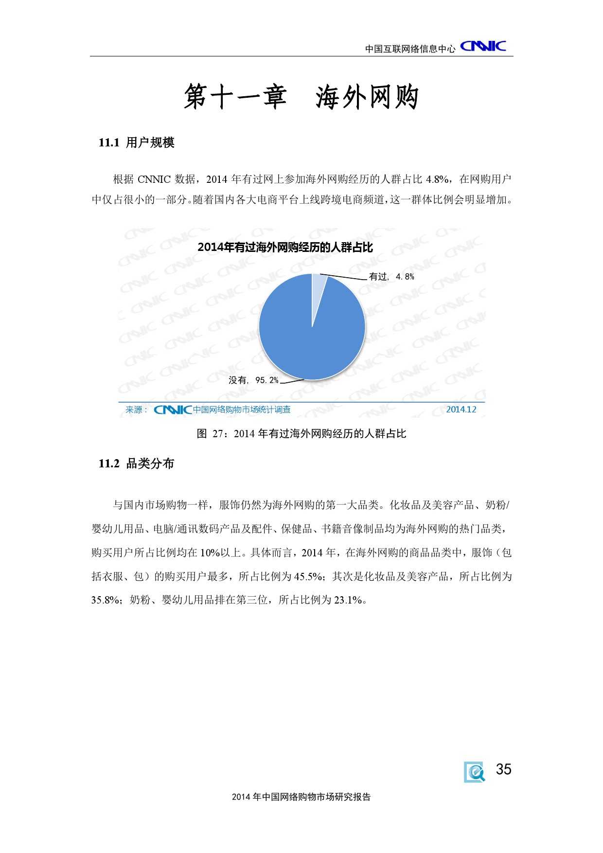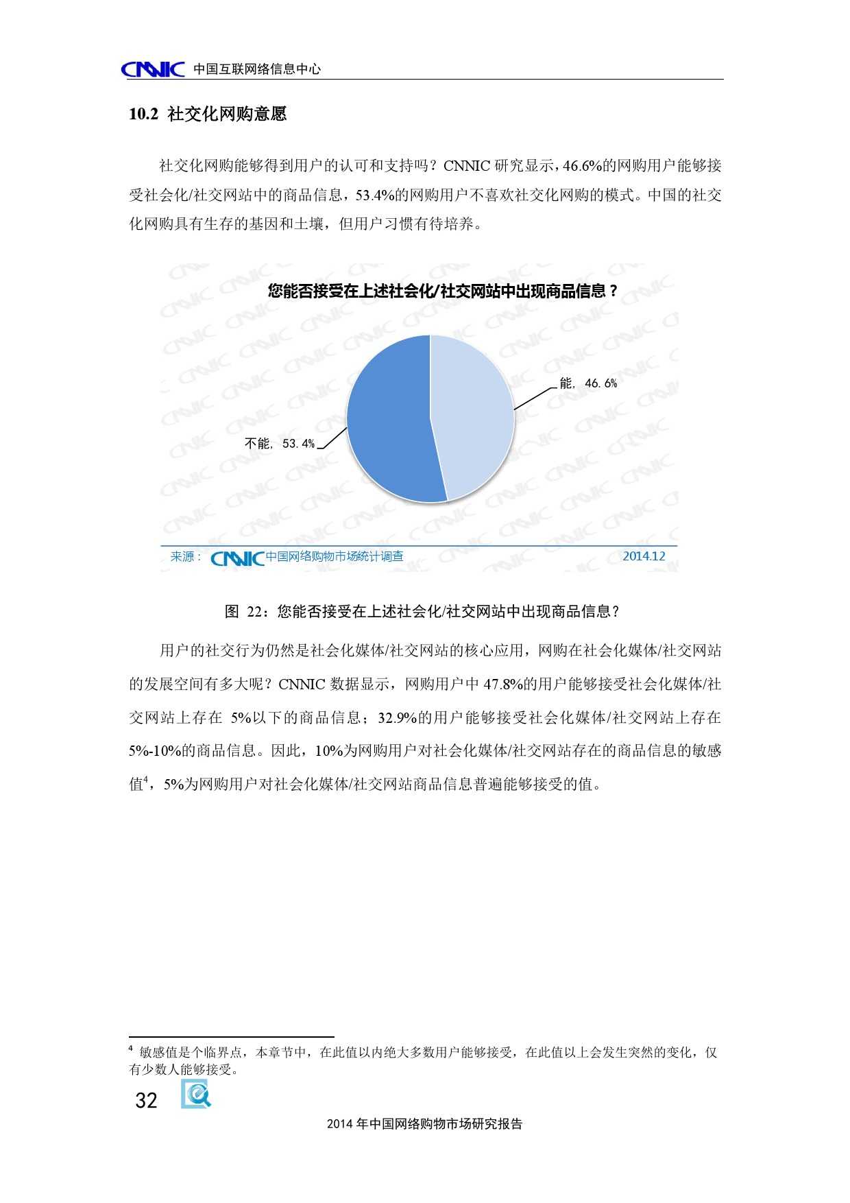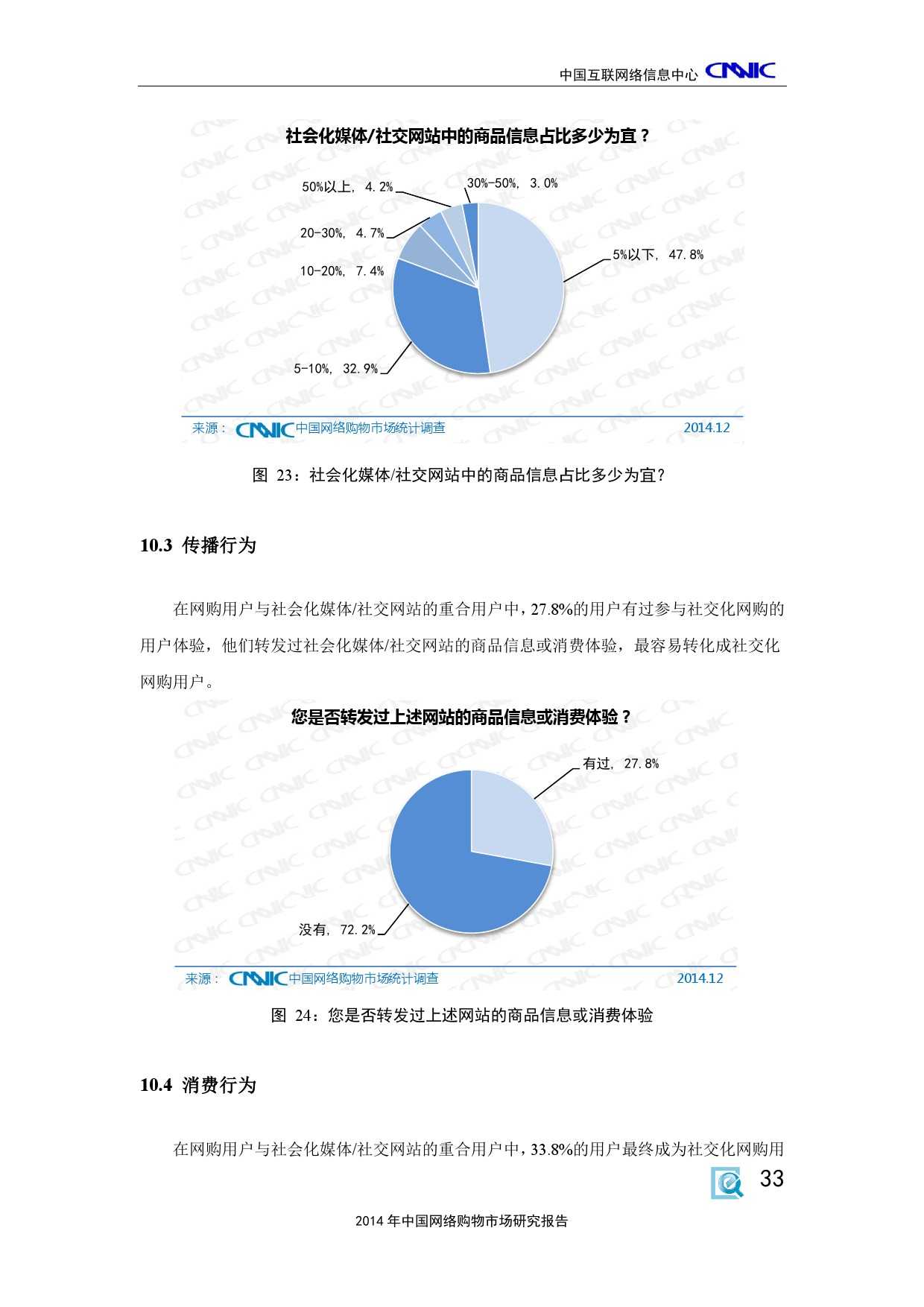 中国的社交电商拥有良好的基因和土壤,网购用户与社会化媒体/社交网站和社交化即时通信用户重合度较高。其中,网购用户与微信用户的重合度最高,网购用户中的微信用户占比为70.6%。在网购用户与社会化媒体/社交网站的重合用户中,33.8%的用户最终成为社交化网购用户。与此同时,社交化网购能够缩短用户的决策时间;促销力度较大的社交化网购产品可以在瞬间产生病毒式的营销效果,市场发展潜力较大。此外,海外购物在中国市场迅速崛起。2014年跨境B2C业务在天猫、京东、苏宁等各大网络零售平台上线。虽然2014年有过网上参加海外购物经历的人群在网购用户中仅占4.8%,但是随着国内各大电商平台上线跨境电商频道,这一群体比例会明显增加。