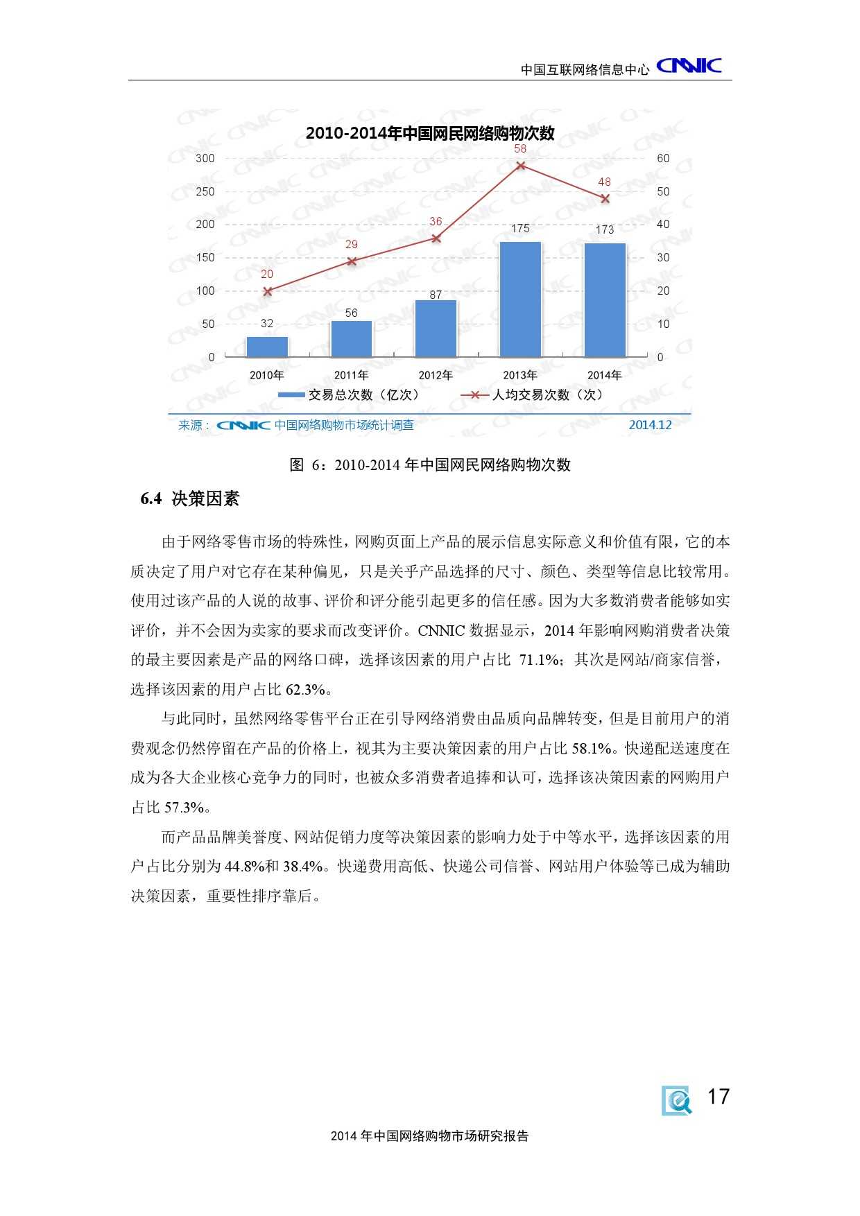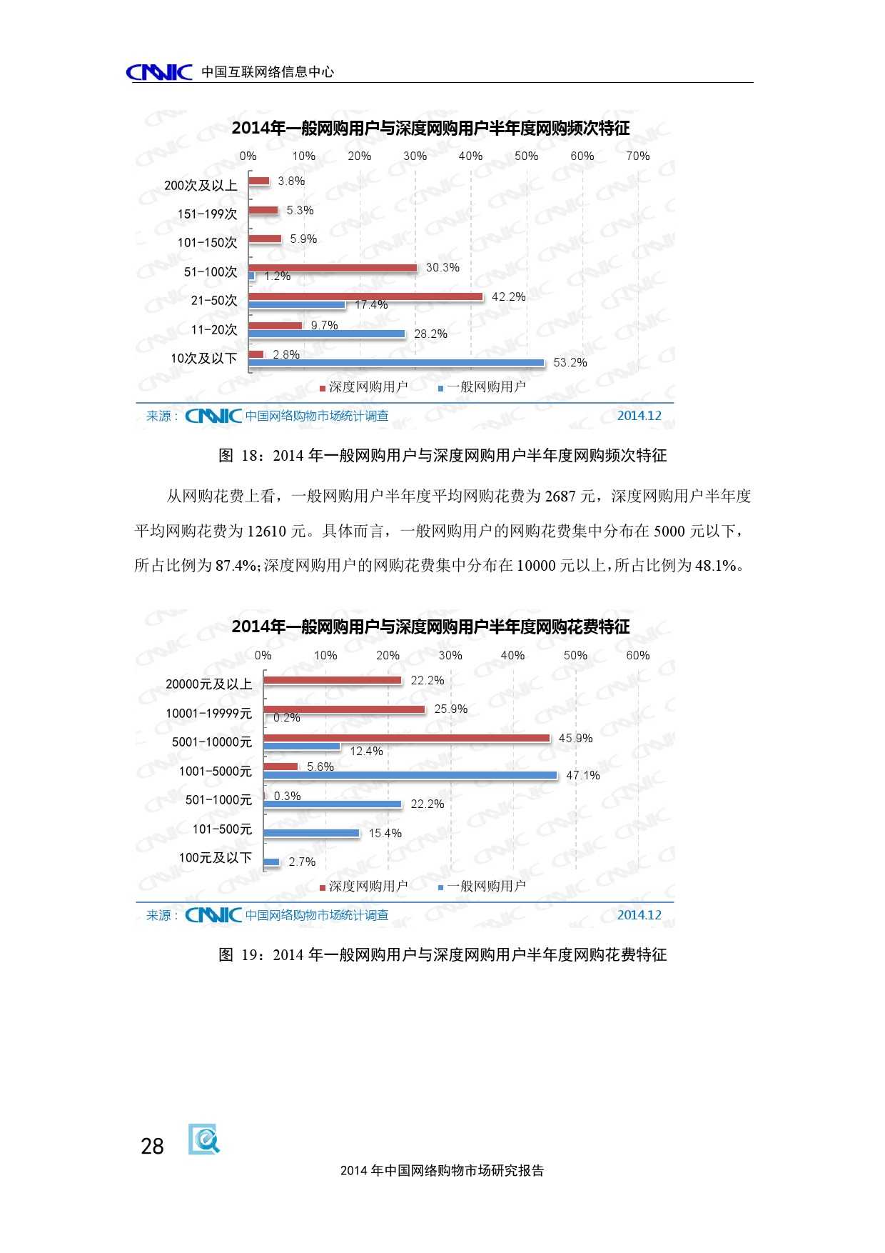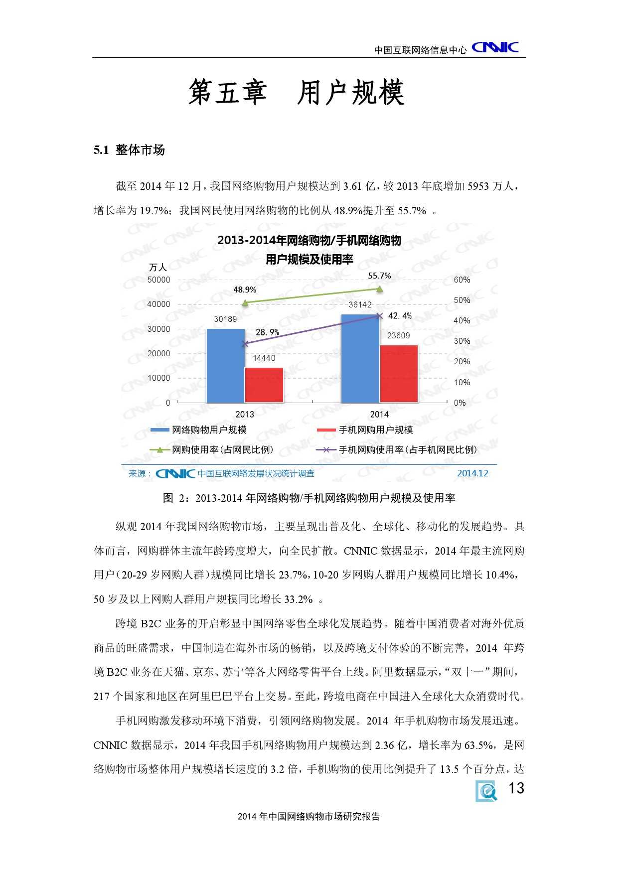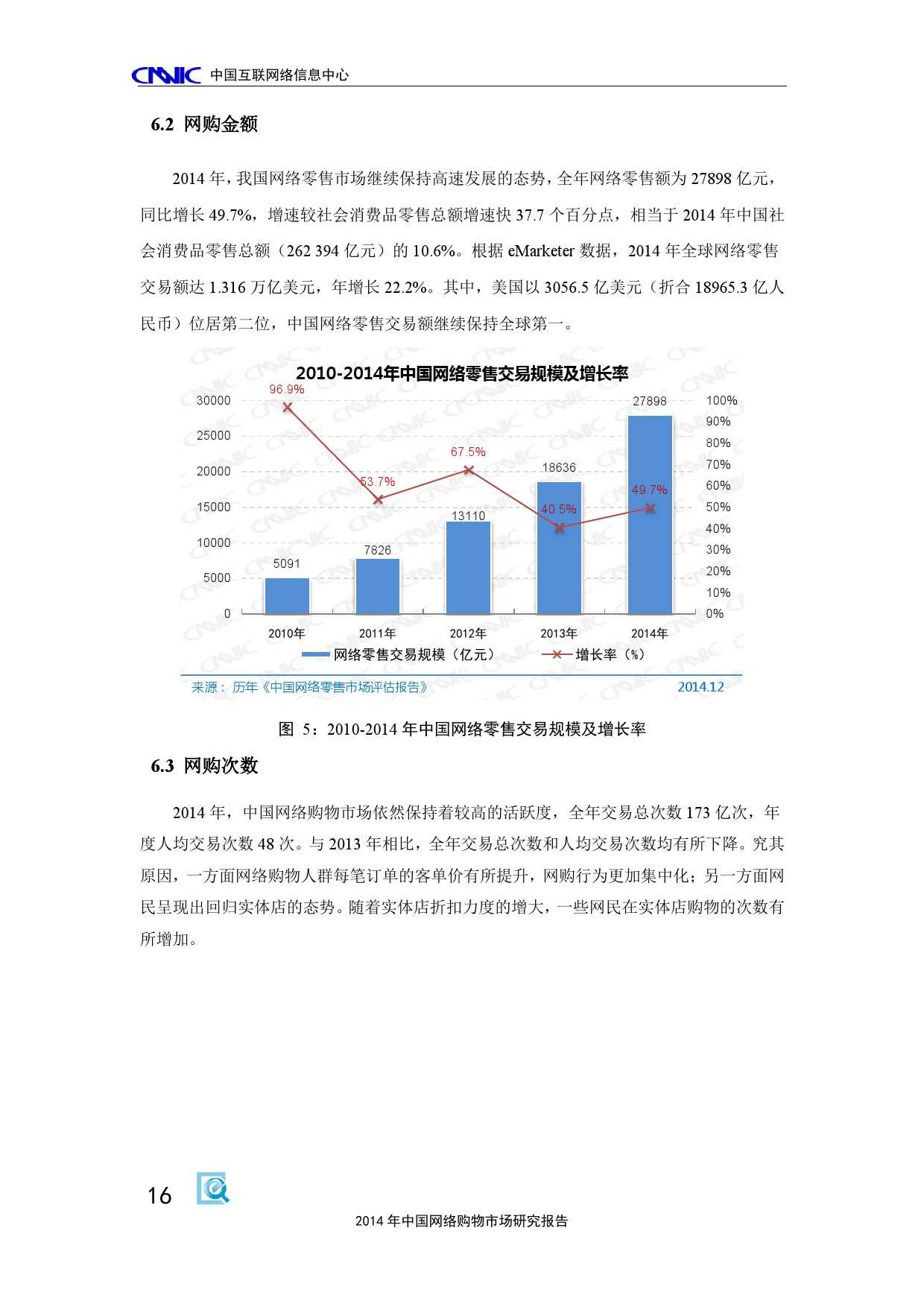 近日,中国互联网络信息中心(CNNIC)发布《2014年中国网络购物市场研究报告》,报告显示,截至2014年12月,我国网络购物用户规模达到3.61亿,较2013年底增加5953万人,增长率为19.7%;我国网民使用网络购物的比例从48.9%提升至55.7%。与此同时, 2014年手机购物市场发展迅速。2014年我国手机网络购物用户规模达到2.36亿,增长率为63.5%,是网络购物市场整体用户规模增长速度的3.2倍,手机购物的使用比例提升了13.5个百分点,达到42.4% 。