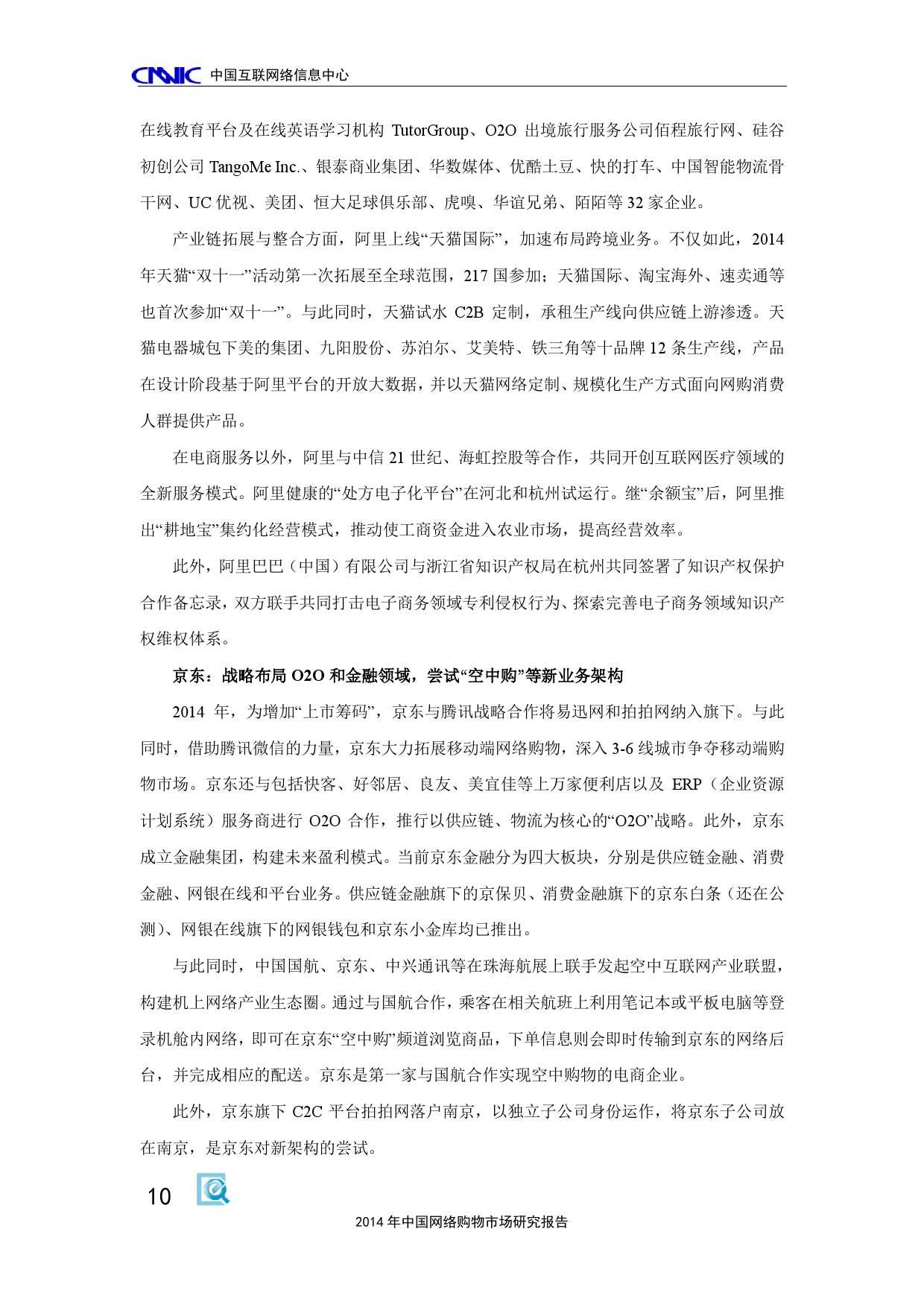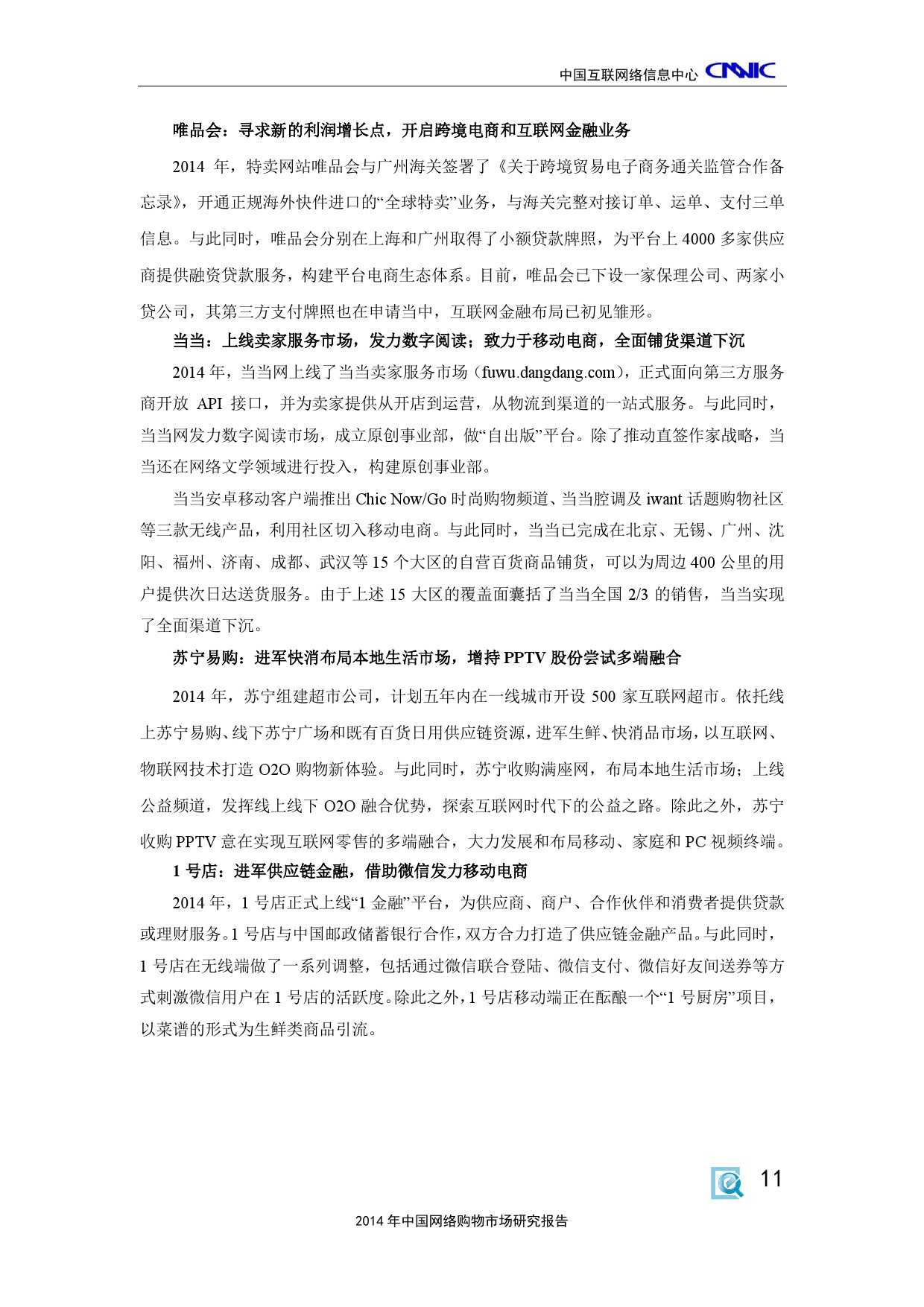 2014年,网络购物整体市场的用户规模在高位上仍保持千万级别的增长,普及率达到55.7%。与此同时,手机网络购物市场发展迅猛,用户年度增长率为63.5%;手机购物市场用户规模增速是整体网络购物市场的3.2倍。电商市场的持续繁荣,促使企业加速战略布局。阿里巴巴通过资产重组和产业链整合构筑电商服务生态;京东战略布局O2O和金融领域,尝试“空中购”等新业务架构;唯品会寻求新的利润增长点,开启跨境电商和互联网金融业务;当当上线卖家服务市场,发力数字阅读,致力于移动电商,全面铺货渠道下沉;苏宁进军快消布局本地生活市场,增持PPTV股份尝试多端融合;1号店进军供应链金融,借助微信发力移动电商。