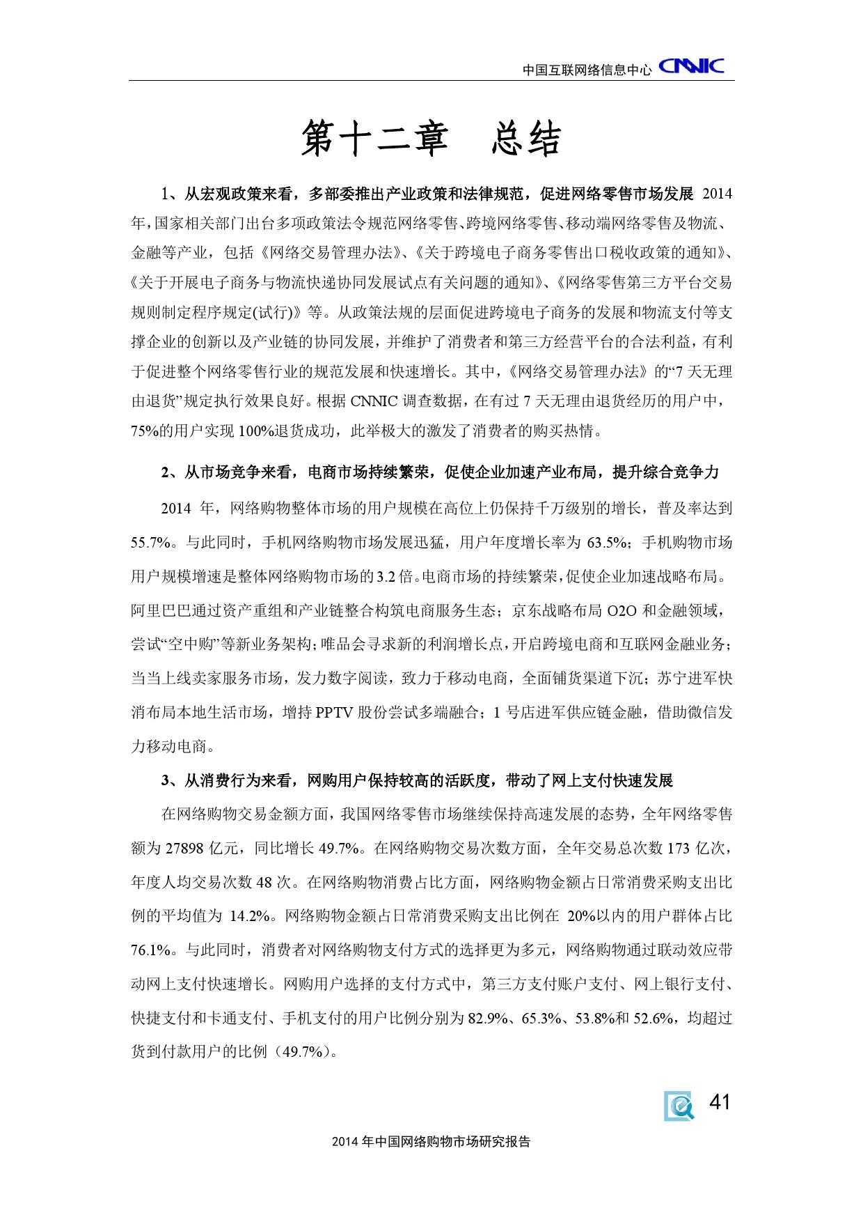 2014年,国家相关部门出台多项政策法令规范网络零售、跨境网络零售、移动端网络零售及物流、金融等产业,包括《网络交易管理办法》、《关于跨境电子商务零售出口税收政策的通知》、《关于开展电子商务与物流快递协同发展试点有关问题的通知》、《网络零售第三方平台交易规则制定程序规定(试行)》等。从政策法规的层面促进跨境电子商务的发展和物流支付等支撑企业的创新以及产业链的协同发展,并维护了消费者和第三方经营平台的合法利益,有利于促进整个网络零售行业的规范发展和快速增长。其中,《网络交易管理办法》的“7天无理由退货”规定执行效果良好。根据CNNIC调查数据,在有过7天无理由退货经历的用户中,75%的用户实现100%退货成功,此举极大的激发了消费者的购买热情。