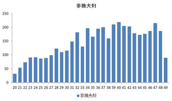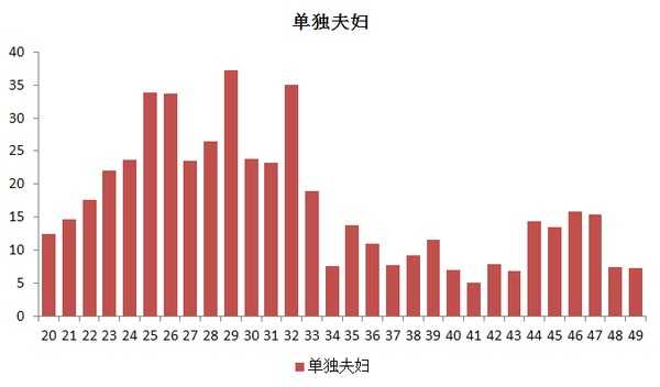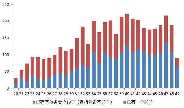 可以看到,单独夫妇虽然人数少,但是夫妇年龄结构相对年轻,集中在25到30岁左右。而总数占多的非独生子女夫妇的年龄结构就要老得多了,竟然是40岁以上的部分最为集中。这部分人口较为老化的年龄结构,在一定程度上削弱了“全面两孩”的政策效果。
