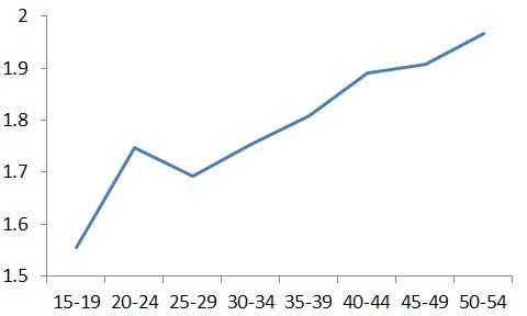 其次,新婚的非独生子女夫妇的生育意愿也在下降。根据2013年的中国综合社会调查(CGSS)数据,各年龄层女性的生育意愿如下图(注意坐标底部为1.5),也就是说,两年前,15-19岁女性的生育意愿仅勉强多于1.5个孩子,这批人进入婚姻后,因“全面两孩”政策而被释放出的生育意愿也会相应减少。