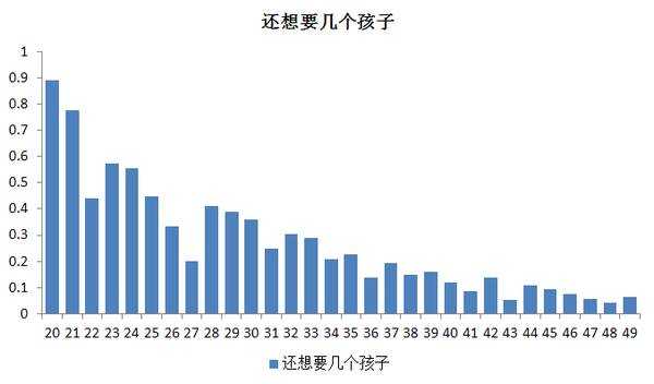 可以看到一个明显的随年龄下降趋势。在一个妻子为20岁的非独夫妇家庭中,如果已经有了一个孩子,那么他们的再生育意愿为0.9个孩子;而妻子年龄越大,再生育的愿望也就越低。