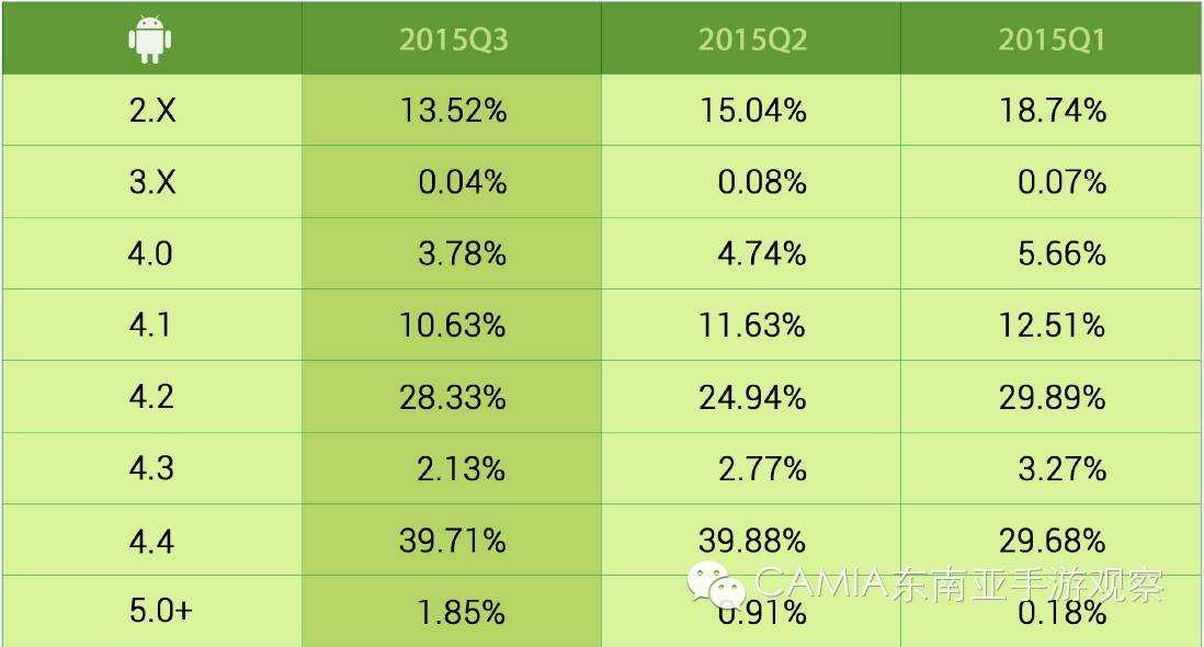 ·市场占有率最高的android版本分别是4.4,4.2,4.1和2.x。2015年2.x版本的占有率在持续下跌,但仍占有较大市场,对于开发者来说,考虑低分辨率手机的兼容性依然非常重要。