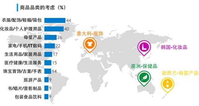 消费者在未来一年考虑购买的品类主要集中在衣服/配饰/鞋帽/箱包(44%),化妆品/个人护理用品(40%)、母婴产品(26%)和家电/手机/IT数码(22%)。就国家而言,消费者青睐的货源地主要集中在美国与东亚国家/地区(韩国、日本、香港)。其中意向购买韩国、法国产品的人更倾向购买美容护肤产品;意向购买香港、意大利产品的人更倾向购买服装、鞋包;意向购买澳大利亚商品的人更倾向购买保健品;意向购买新西兰产品的人更倾向购买母婴产品。