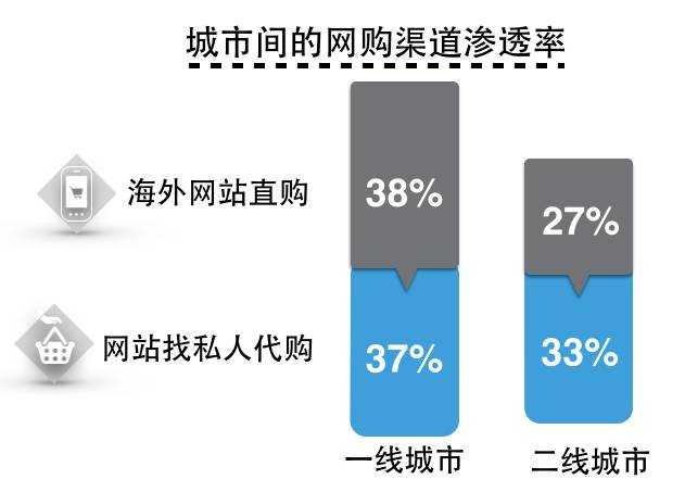 二线城市在各跨境网购渠道上的渗透率均低于一线城市,以主要的“自己从海外网站直购”和“淘宝等网站上的私人代购服务”两种渠道为例:一线城市和二线城市的渗透率分别为38% vs. 27%和37% vs. 33%。