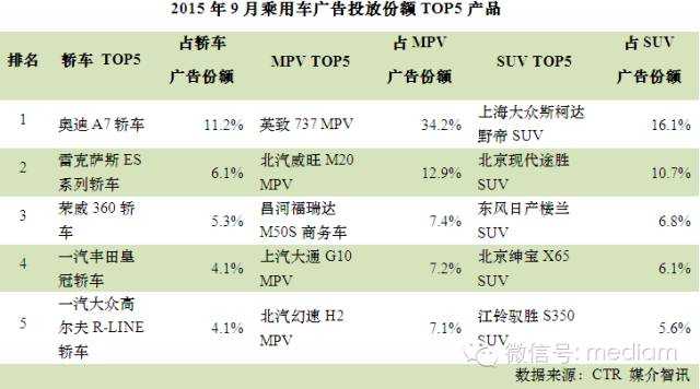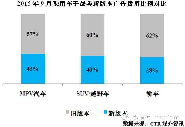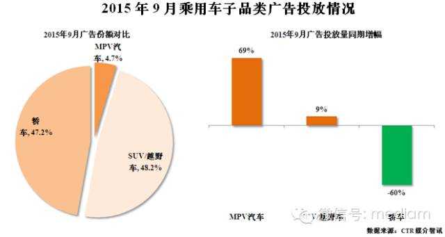2015年9月各乘用车子行业与上月对比, SUV和轿车广告投放份额变化不大,分别减少3个和1个百分点;MPV出现4个百分点的增长。9月轿车广告投放刊例花费同比进一步下滑,降幅达60%;MPV广告增长势头强劲,同比增幅高达69%;SUV广告同比增长趋缓,增幅仅为9%。