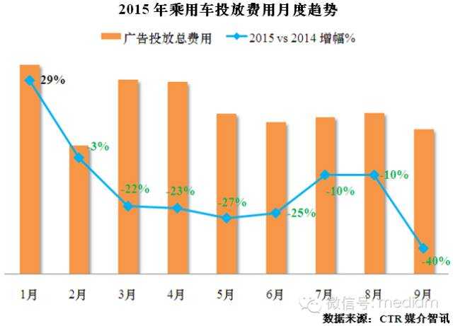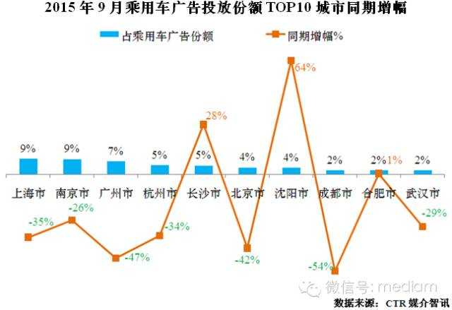 根据CTR媒介智讯广告监测数据显示,2015年9月乘用车广告投放环比下降10.2%,较去年同期下降40%。乘用车广告投放TOP10城市中,沈阳乘着10月中旬举办国际汽车展览会的“东风”广告投放同比增幅显著,达64%;长沙保持稳步增长,同比增幅为28%;其余城市均呈现二位数的同比跌幅,“金九”并没有给各地车市带来更好的行情。
