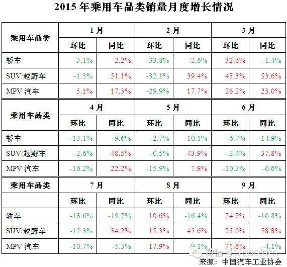 根据中国汽车工业协会发布的数据显示,2015年9月,轿车、SUV和MPV三大类乘用车品种与上年同期相比,增速均超过20%;与去年同期相比,SUV销量保持快速增长,其他品种则呈不同程度下降。