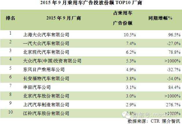 2015年9月,上海大众汽车继续位列榜首,同比增幅10%,主投上海大众斯柯达野帝SUV;一汽大众汽车同样维持在第二名,同比增长7%;大众汽车、丰田汽车、上汽汽车和江铃汽车挤入前十榜单。