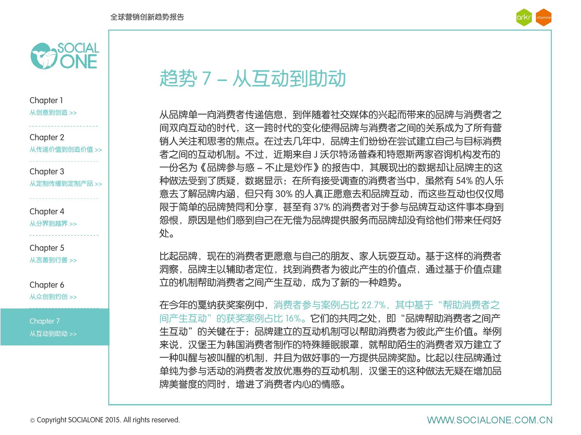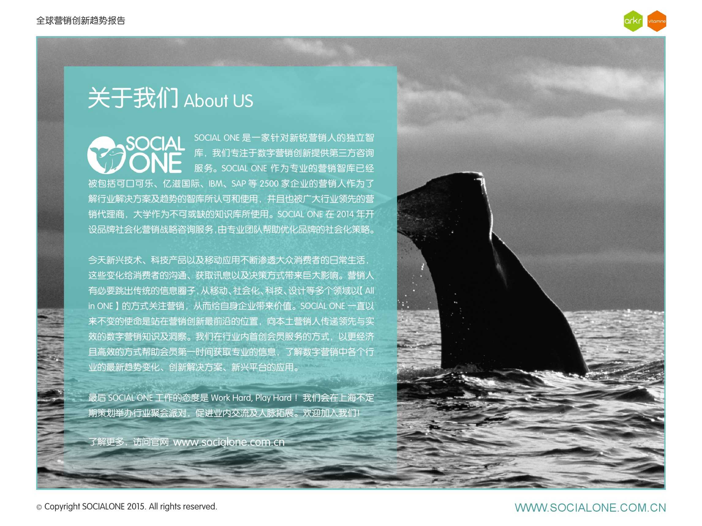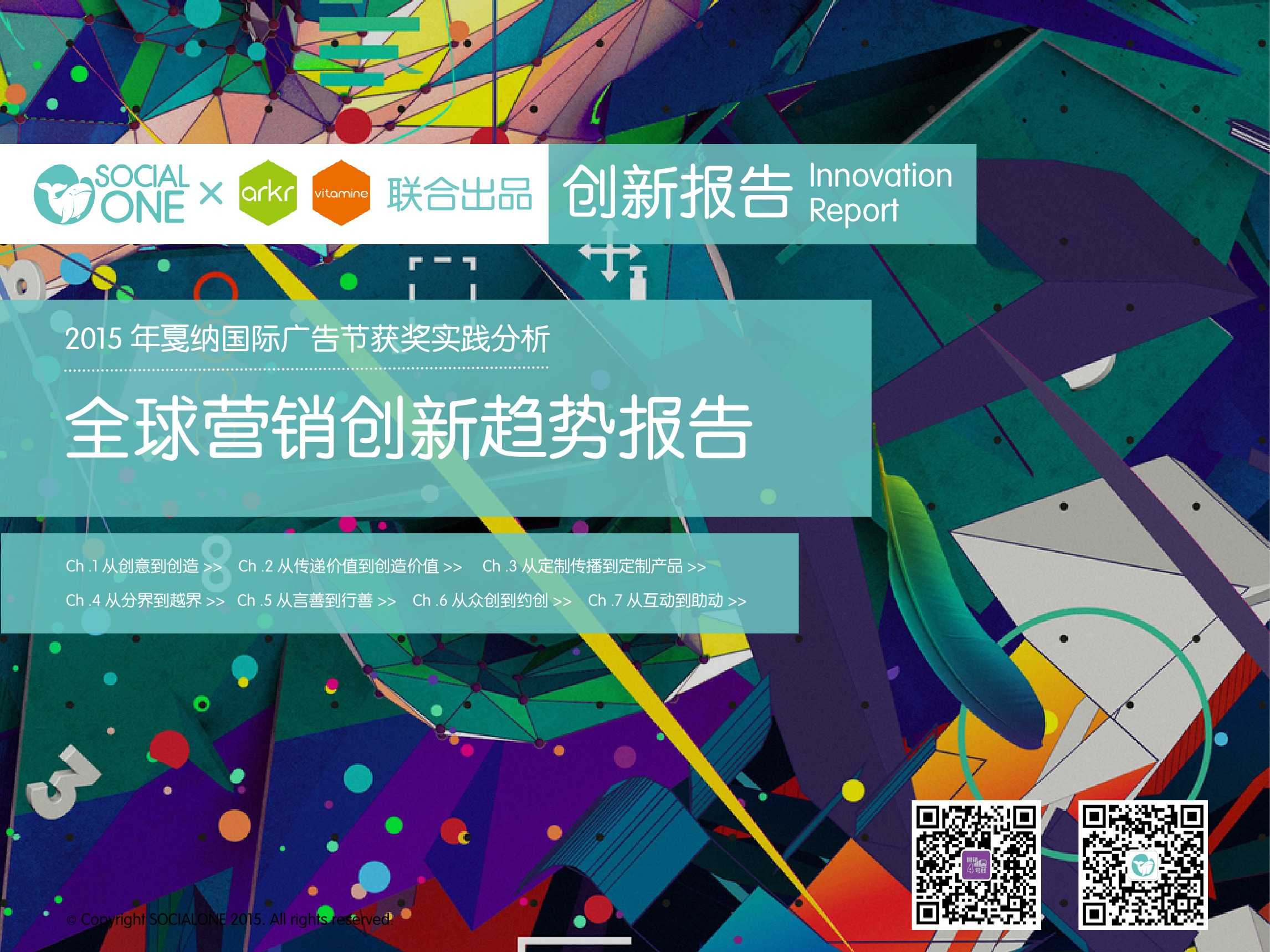 利欧数字网络旗下氩氪集团联合胖鲸智库共同发布了《全球营销创新趋势报告》,报告中的洞察和趋势是基于 2015 年戛纳国际广告节的获奖作品,分析了全球创新趋势,同时结合国内情况给予营销人一定的启示。为了更加贴合本土的营销环境 , 报告将趋势标签与胖鲸智库创新实践库标签匹配,将国际领先趋势在中国市场的呈现和延伸做了梳理。