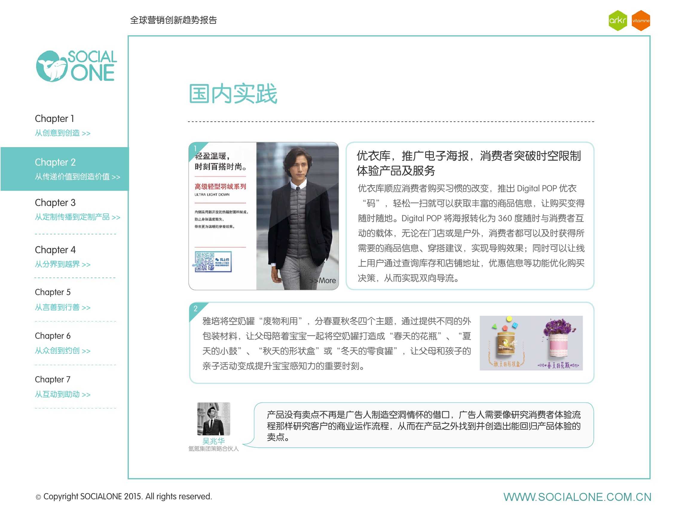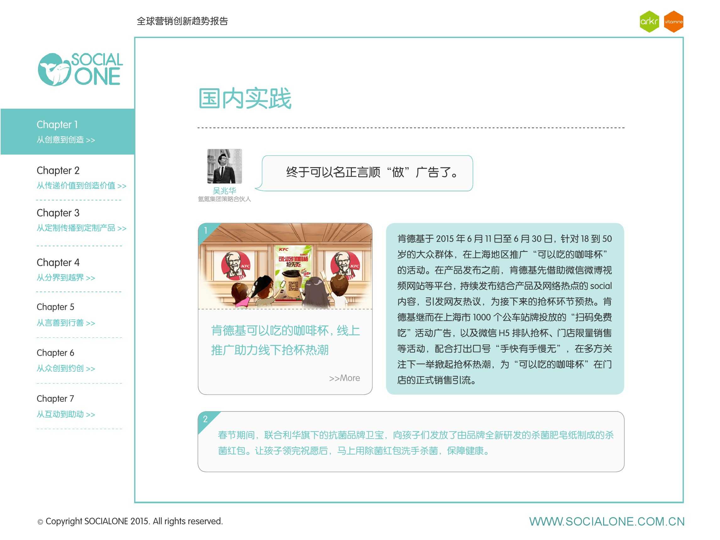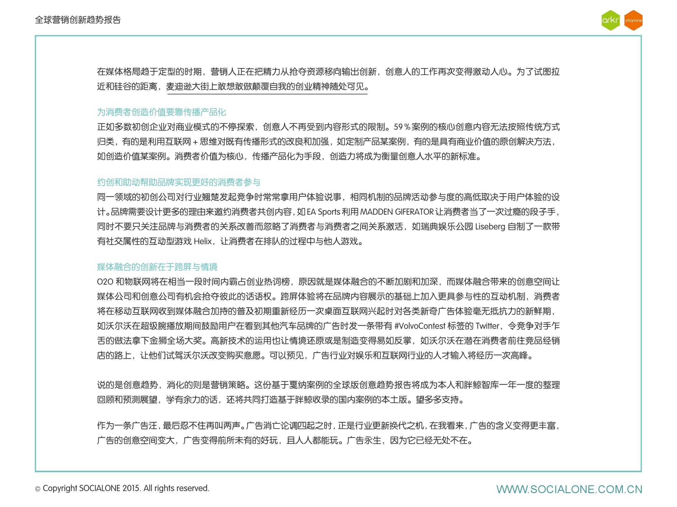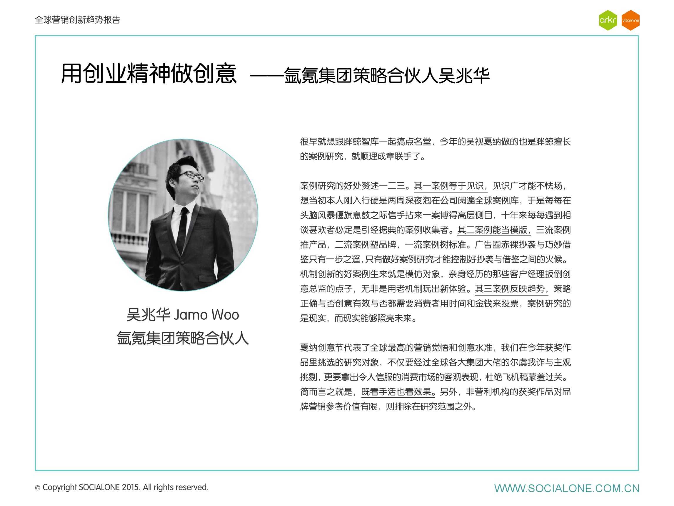 作为此次报告的操盘人和联合出品人,氩氪集团策略合伙人吴兆华(Jamo Woo)根据整个报告提炼出了“用创业精神做创意”的观点,并在这个核心观点下总结了三大趋势:为消费者创造价值要靠传播产品化;约创和助动帮助品牌实现更好的消费者参与;媒体融合的创新在于跨屏与情境。他认为在媒体格局趋于定型的时期,营销人正在把精力从抢夺资源移向输出创新,创意人的工作再次变得激动人心。