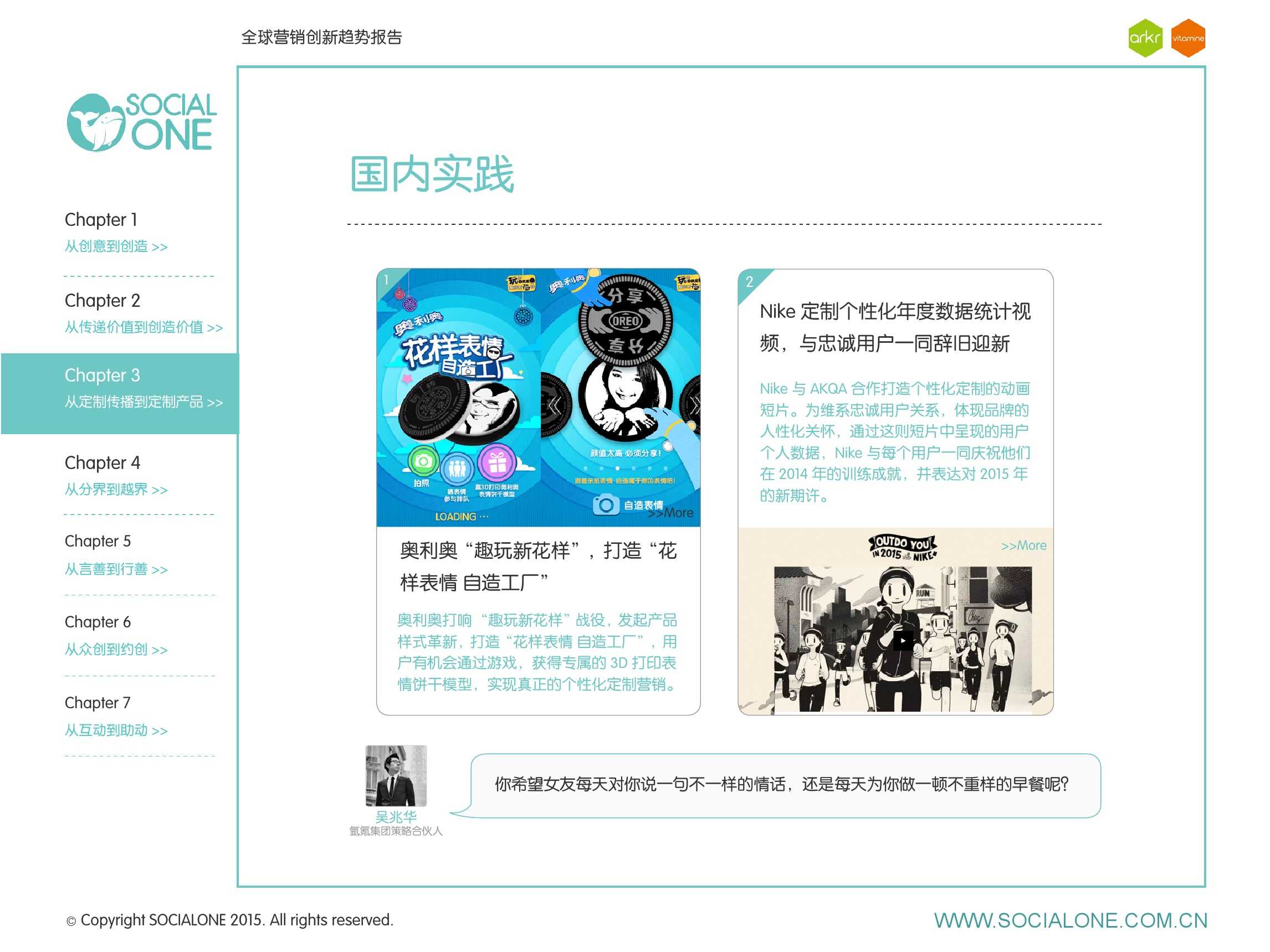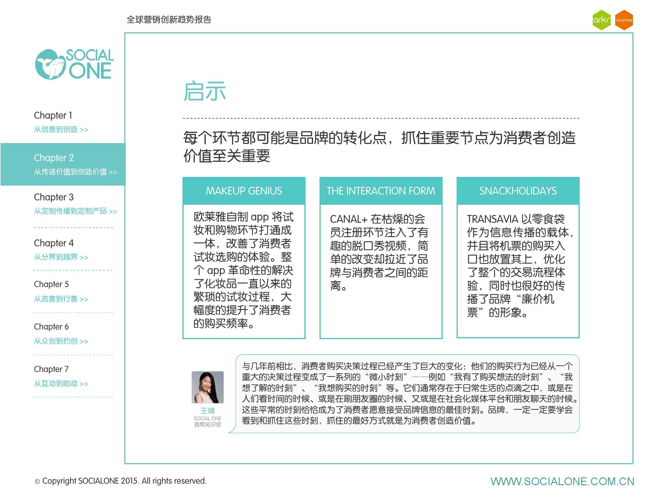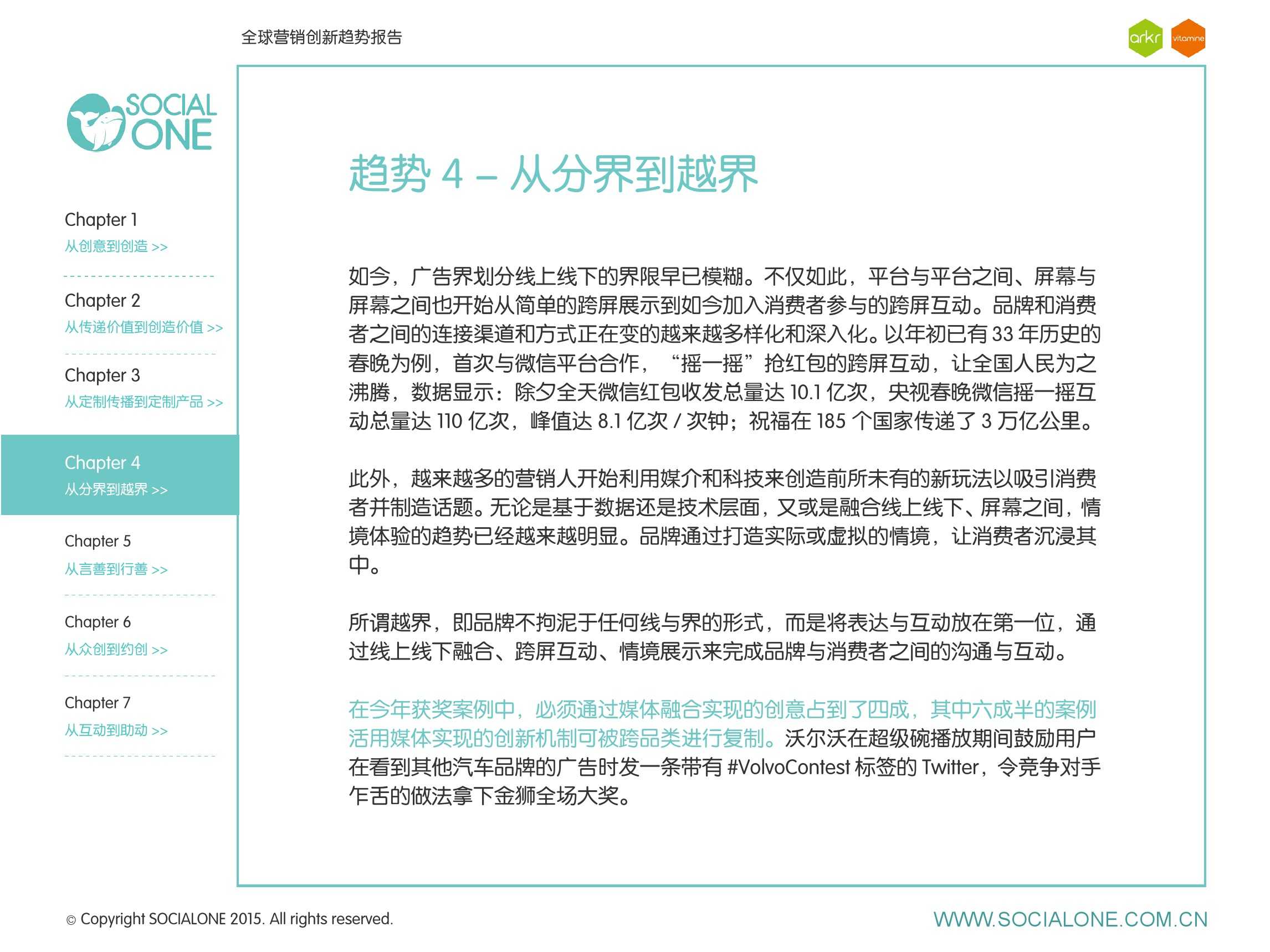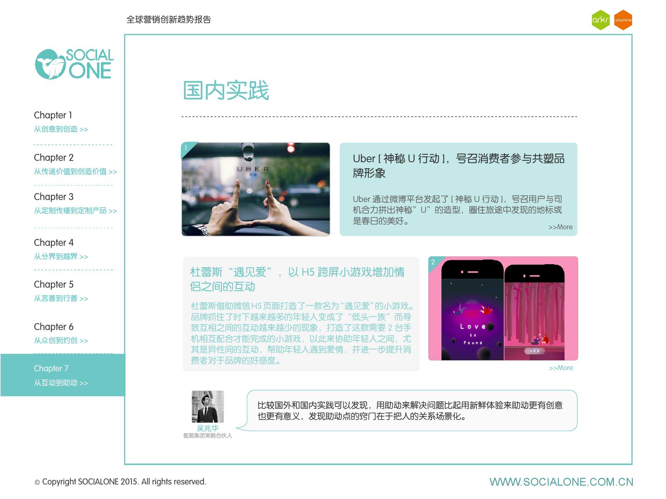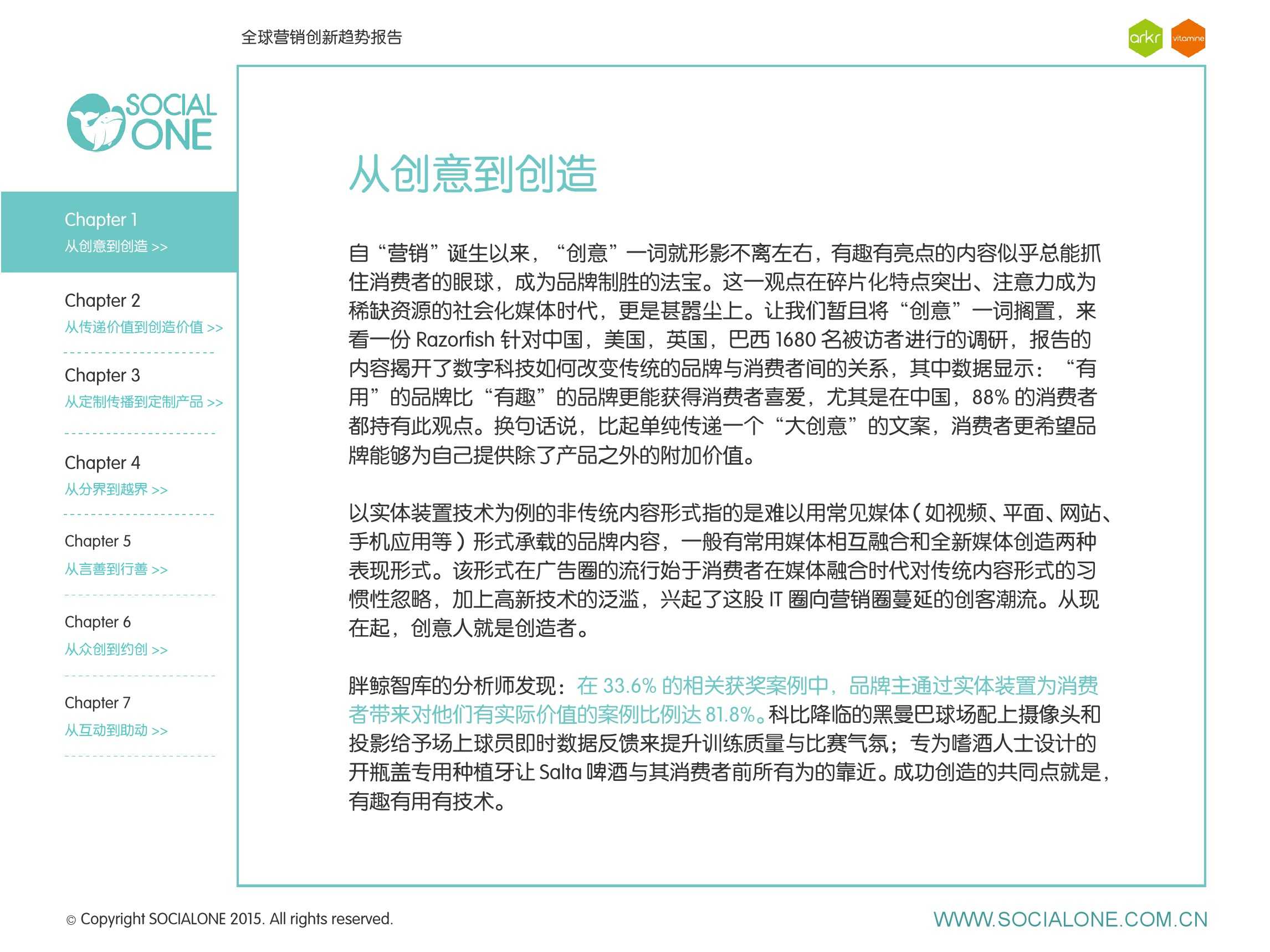 作为此次报告的操盘人和联合出品人,氩氪集团策略合伙人吴兆华(Jamo Woo)根据整个报告提炼出了“用创业精神做创意”的观点,并在这个核心观点下总结了三大趋势:为消费者创造价值要靠传播产品化;约创和助动帮助品牌实现更好的消费者参与;媒体融合的创新在于跨屏与情境。他认为在媒体格局趋于定型的时期,营销人正在把精力从抢夺资源移向输出创新,创意人的工作再次变得激动人心。