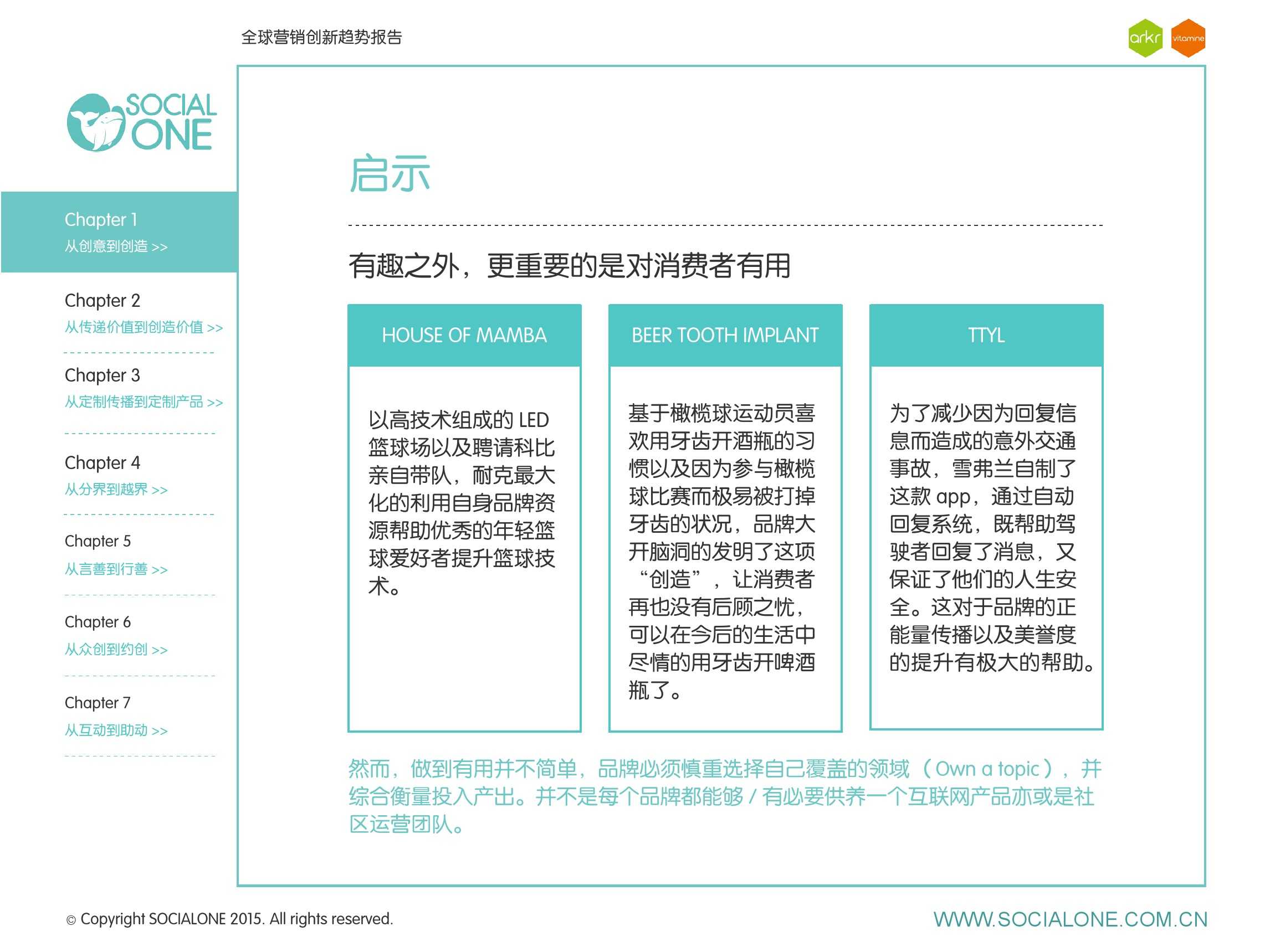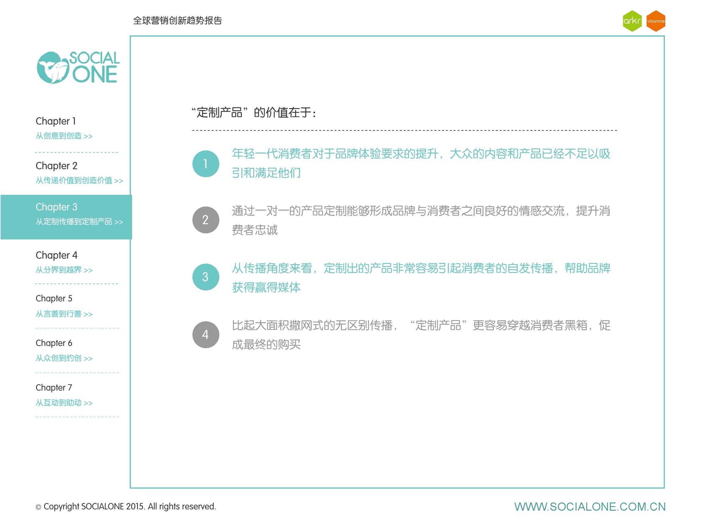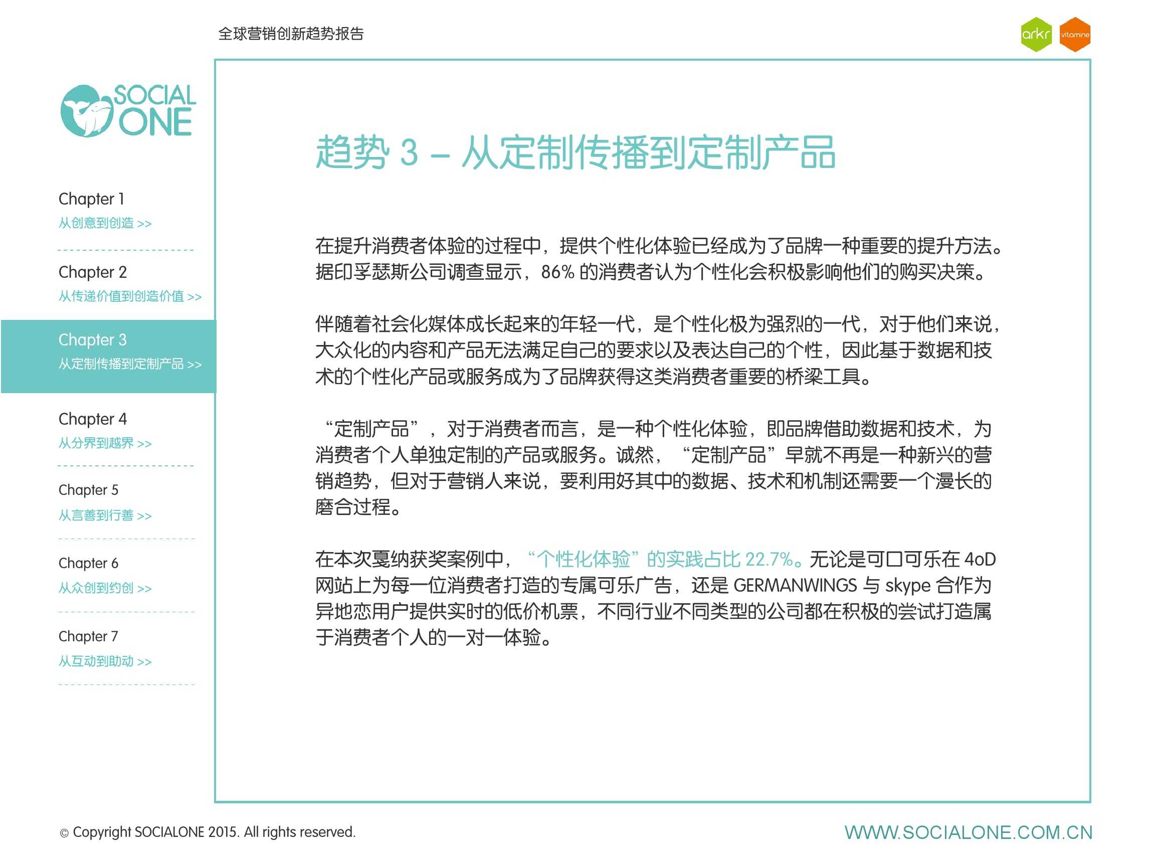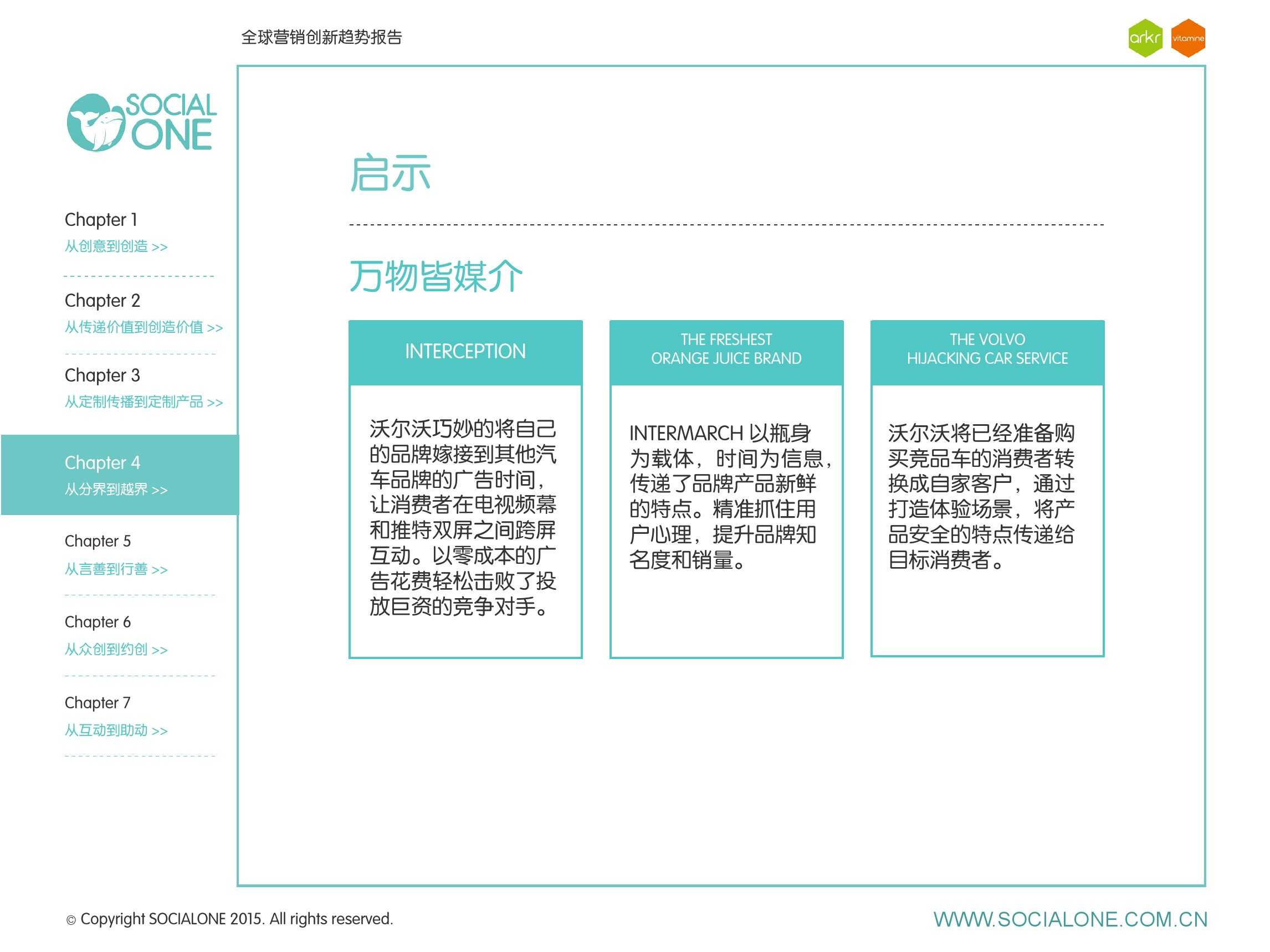 作为此次报告的操盘人和联合出品人,氩氪集团策略合伙人吴兆华(Jamo Woo)根据整个报告提炼出了“用创业精神做创意”的观点,并在这个核心观点下总结了三大趋势:为消费者创造价值要靠传播产品化;约创和助动帮助品牌实现更好的消费者参与;媒体融合的创新在于跨屏与情境。他认为在媒体格局趋于定型的时期,营销人正在把精力从抢夺资源移向输出创新,创意人的工作再次变得激动人心。