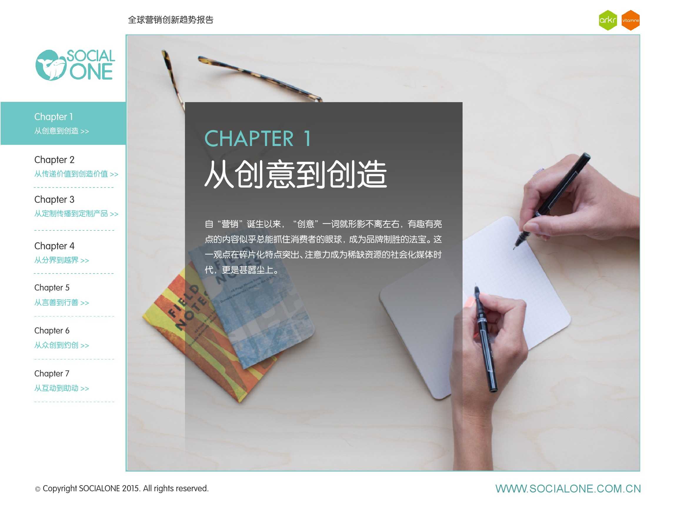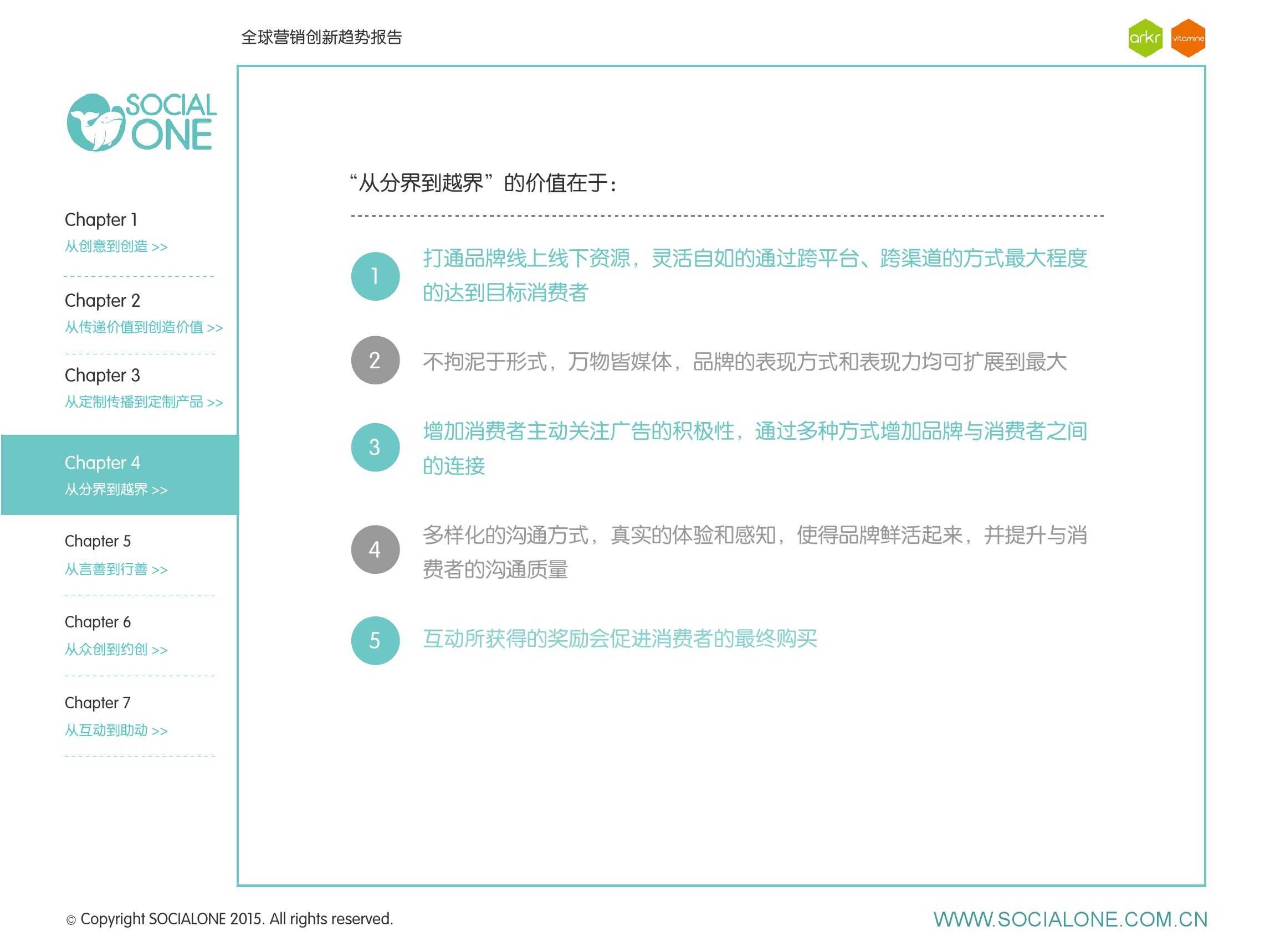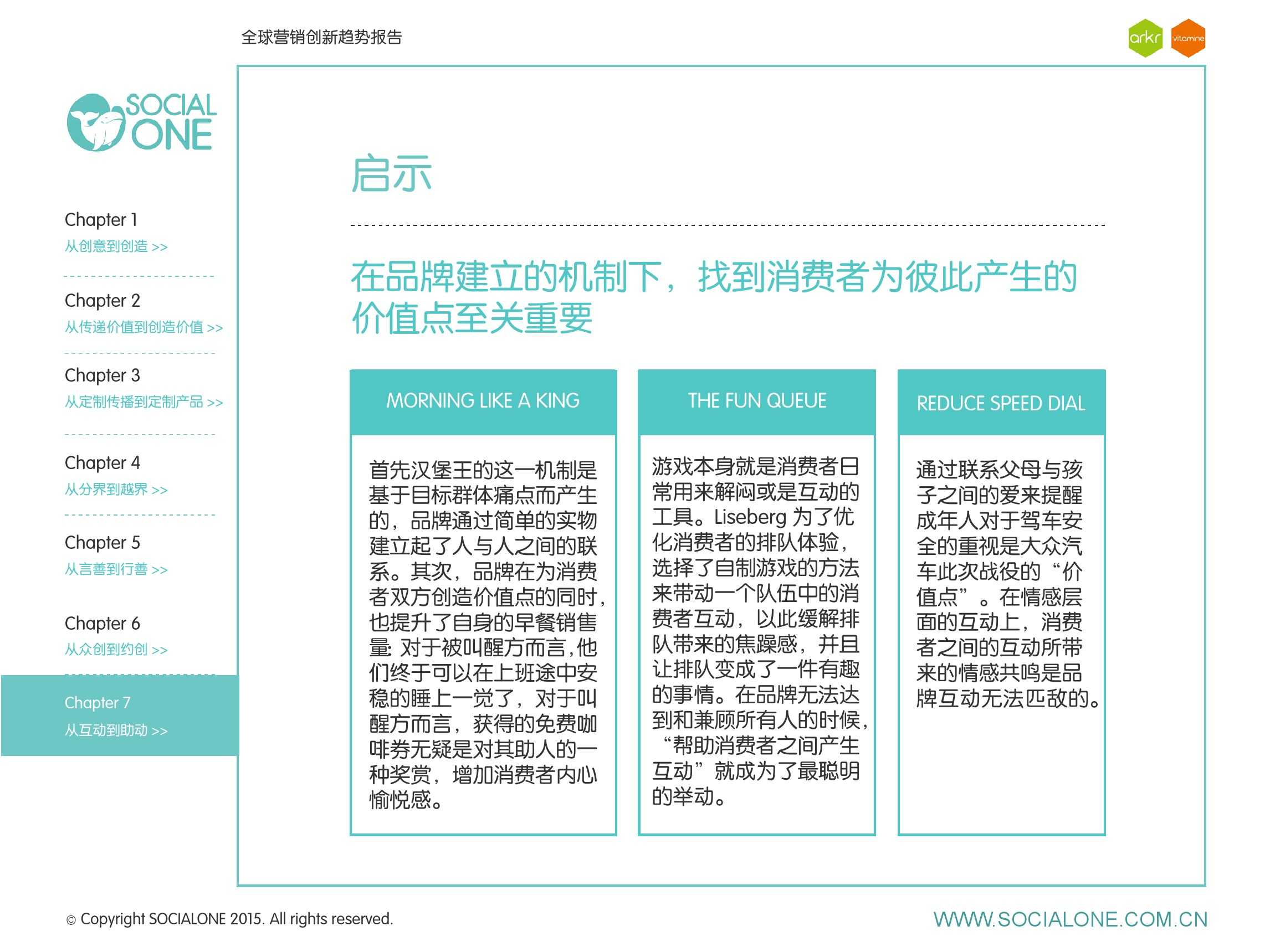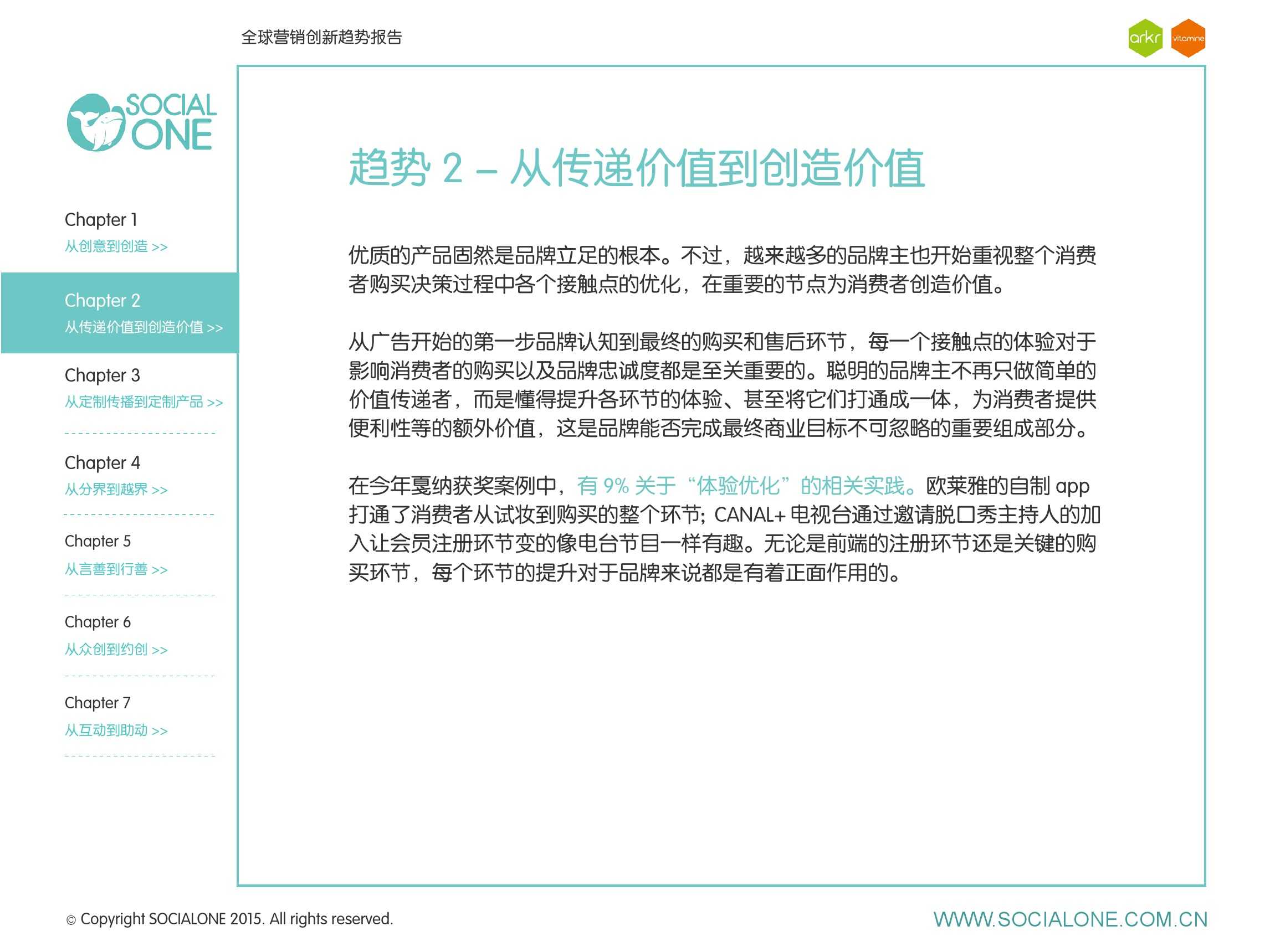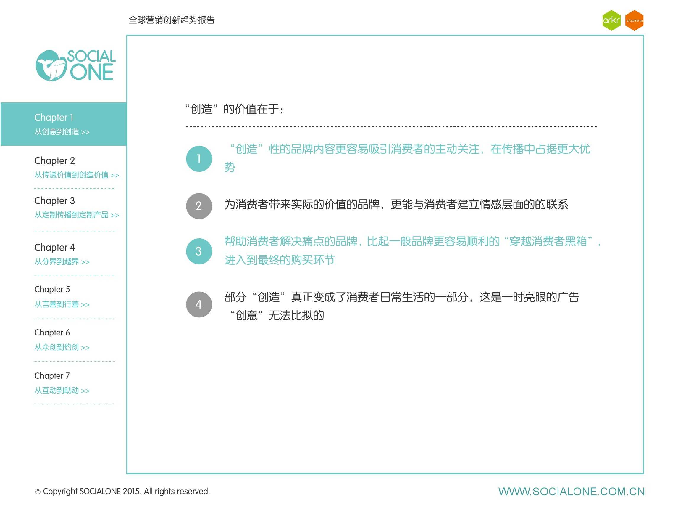 作为此次报告的操盘人和联合出品人,氩氪集团策略合伙人吴兆华(Jamo Woo)根据整个报告提炼出了“用创业精神做创意”的观点,并在这个核心观点下总结了三大趋势:为消费者创造价值要靠传播产品化;约创和助动帮助品牌实现更好的消费者参与;媒体融合的创新在于跨屏与情境。他认为在媒体格局趋于定型的时期,营销人正在把精力从抢夺资源移向输出创新,创意人的工作再次变得激动人心。