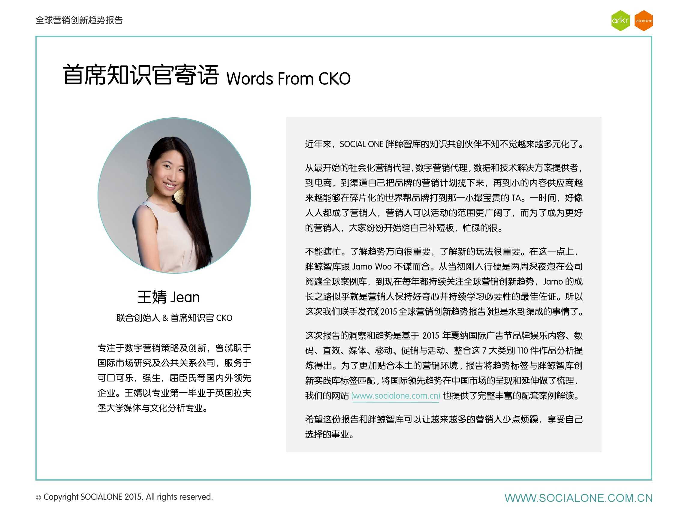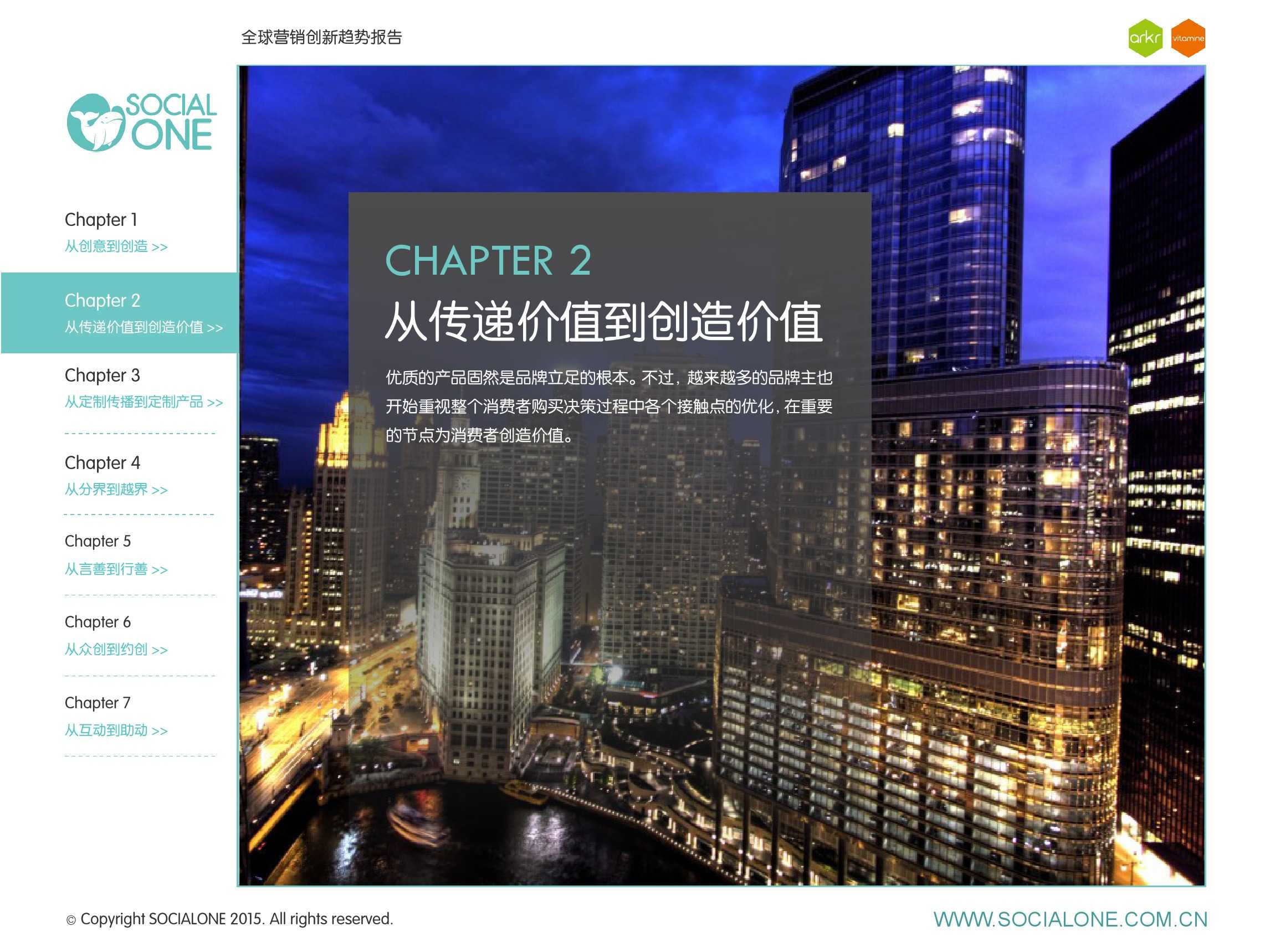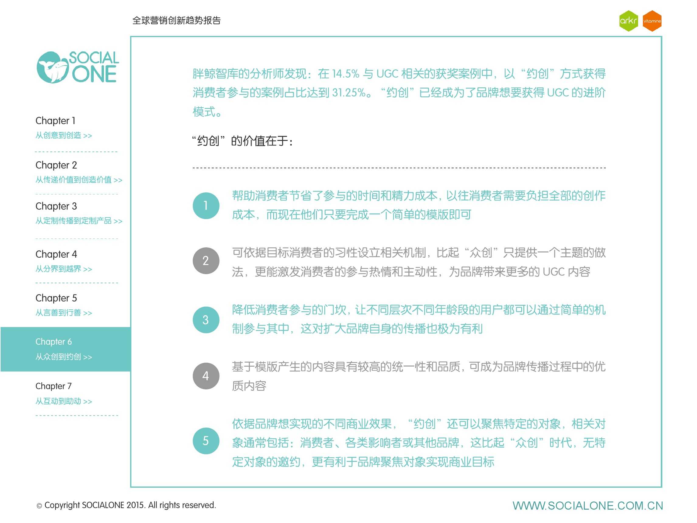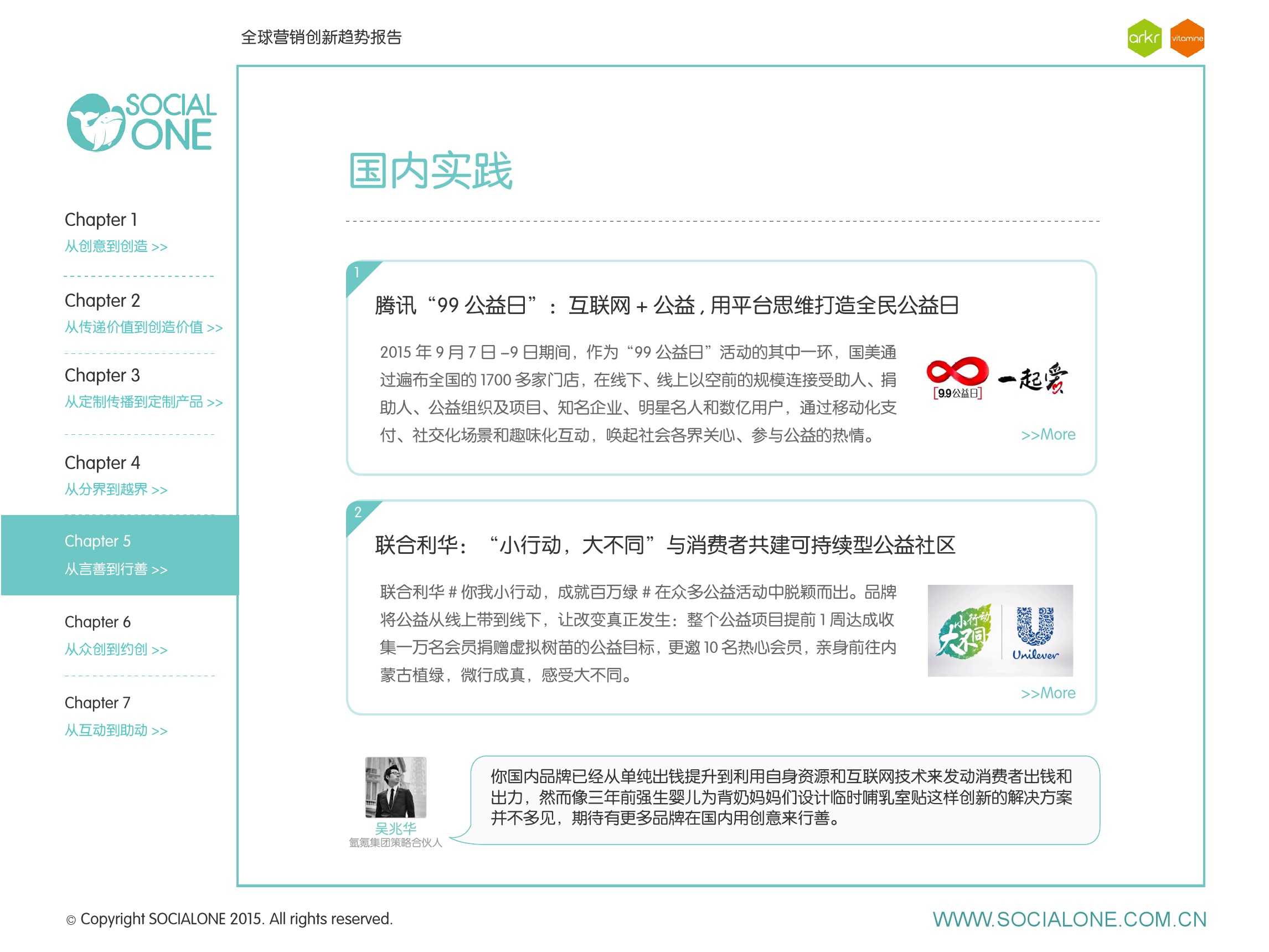 作为此次报告的操盘人和联合出品人,氩氪集团策略合伙人吴兆华(Jamo Woo)根据整个报告提炼出了“用创业精神做创意”的观点,并在这个核心观点下总结了三大趋势:为消费者创造价值要靠传播产品化;约创和助动帮助品牌实现更好的消费者参与;媒体融合的创新在于跨屏与情境。他认为在媒体格局趋于定型的时期,营销人正在把精力从抢夺资源移向输出创新,创意人的工作再次变得激动人心。