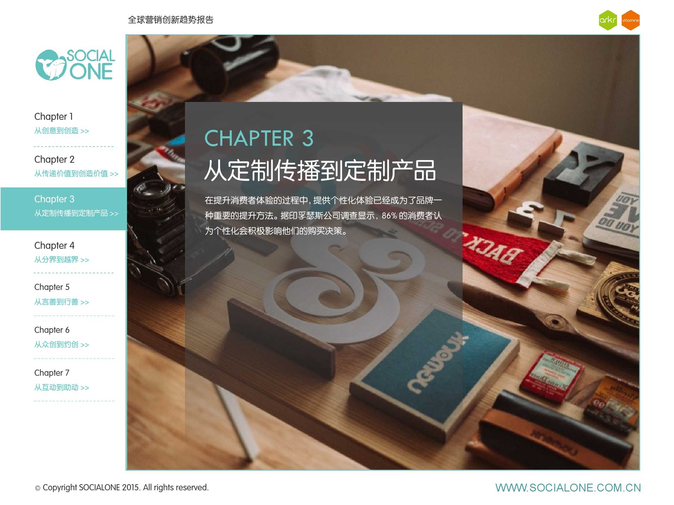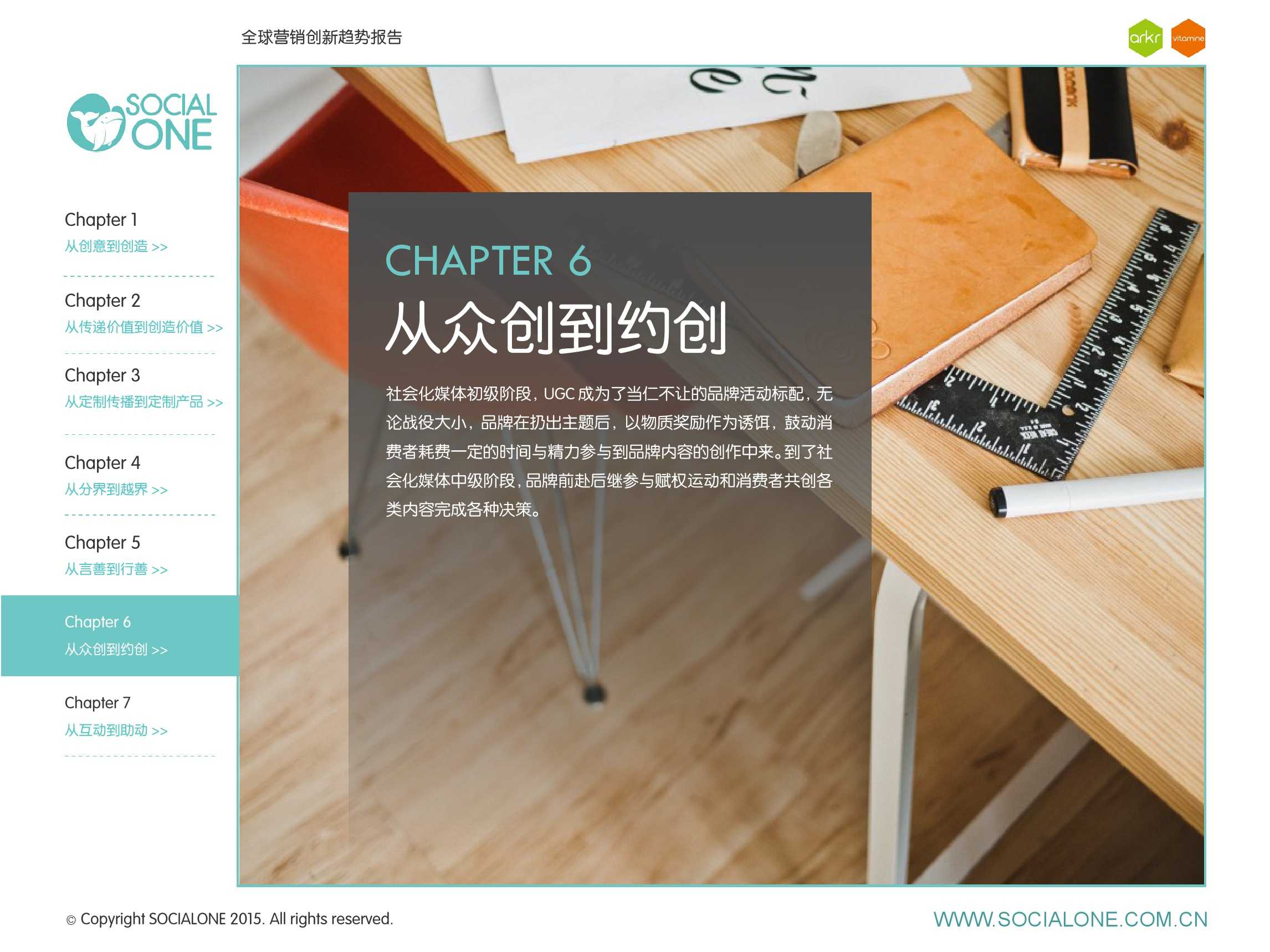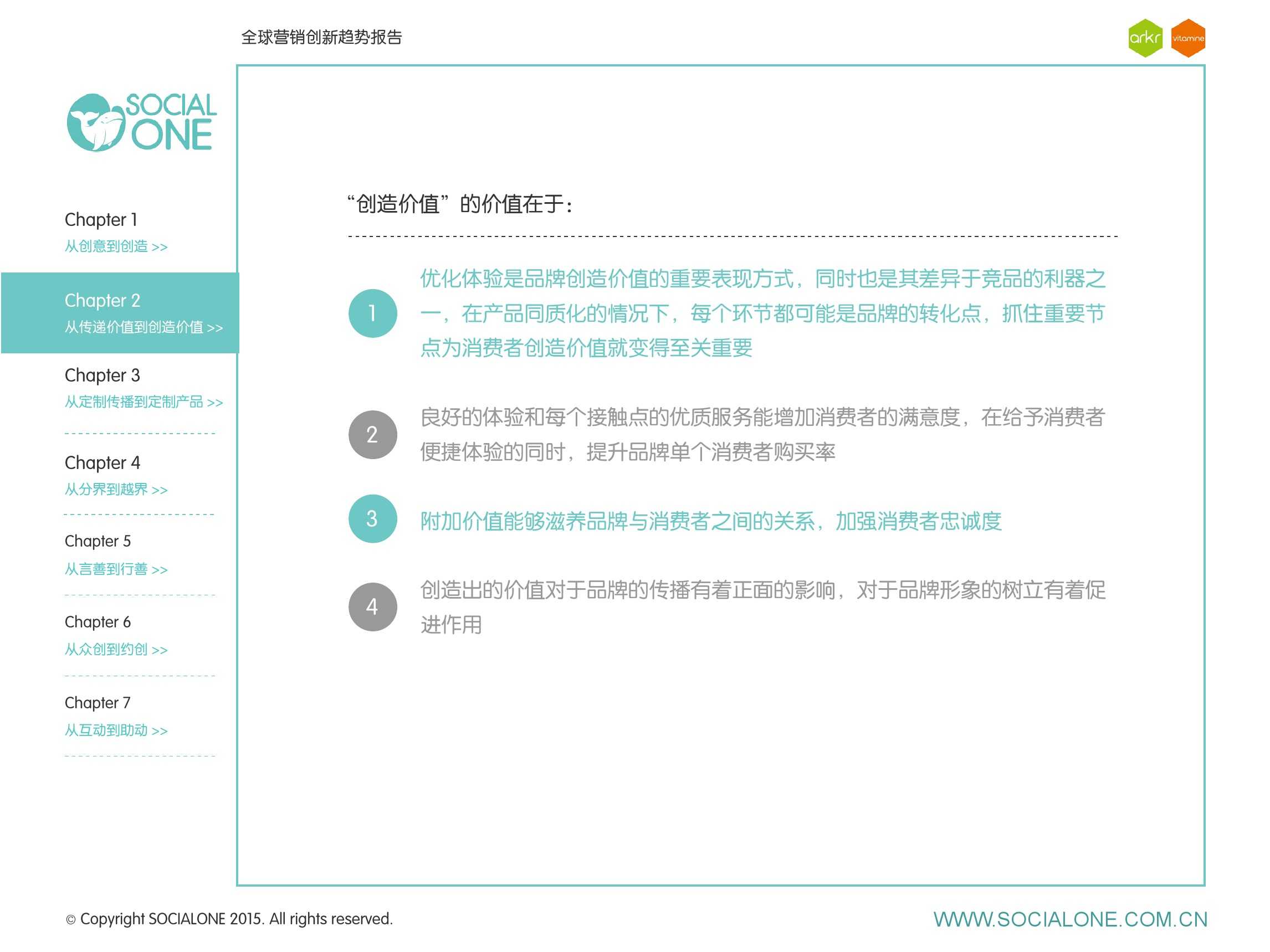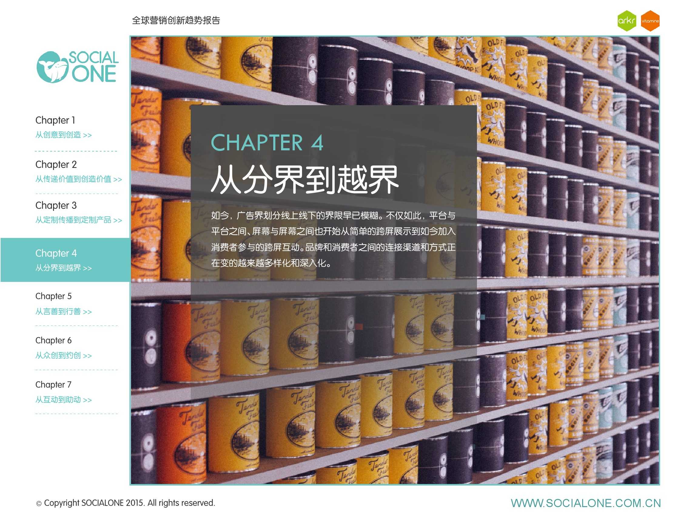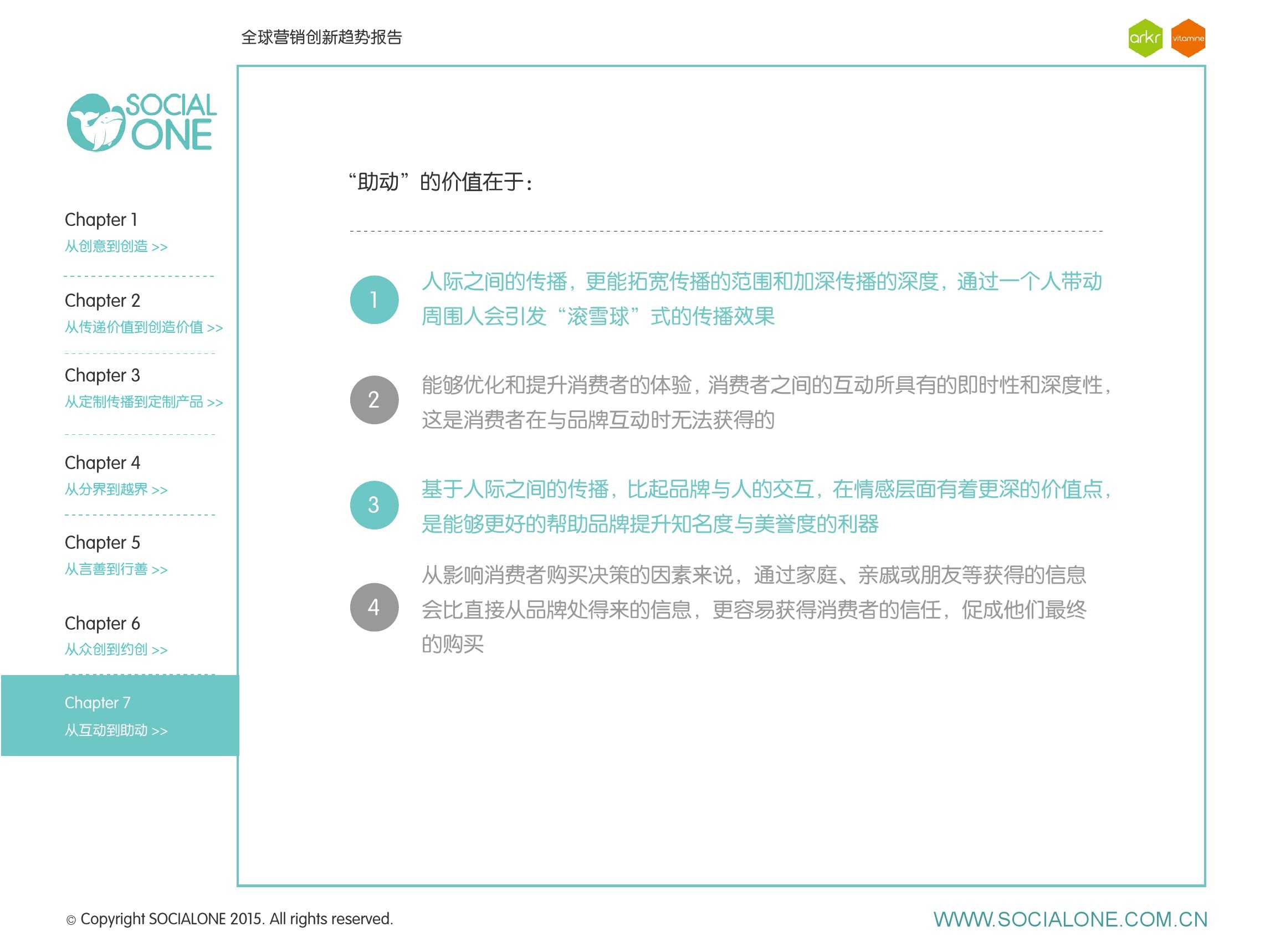 作为此次报告的操盘人和联合出品人,氩氪集团策略合伙人吴兆华(Jamo Woo)根据整个报告提炼出了“用创业精神做创意”的观点,并在这个核心观点下总结了三大趋势:为消费者创造价值要靠传播产品化;约创和助动帮助品牌实现更好的消费者参与;媒体融合的创新在于跨屏与情境。他认为在媒体格局趋于定型的时期,营销人正在把精力从抢夺资源移向输出创新,创意人的工作再次变得激动人心。