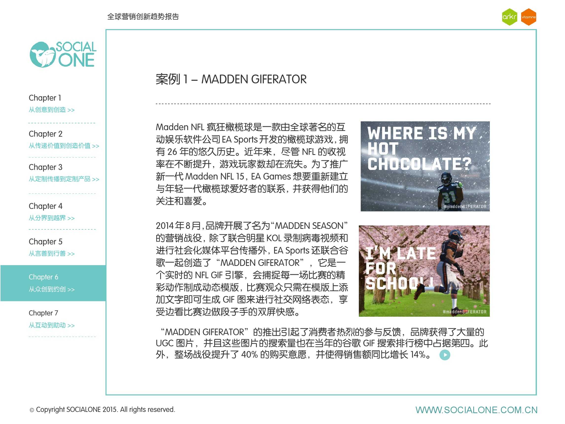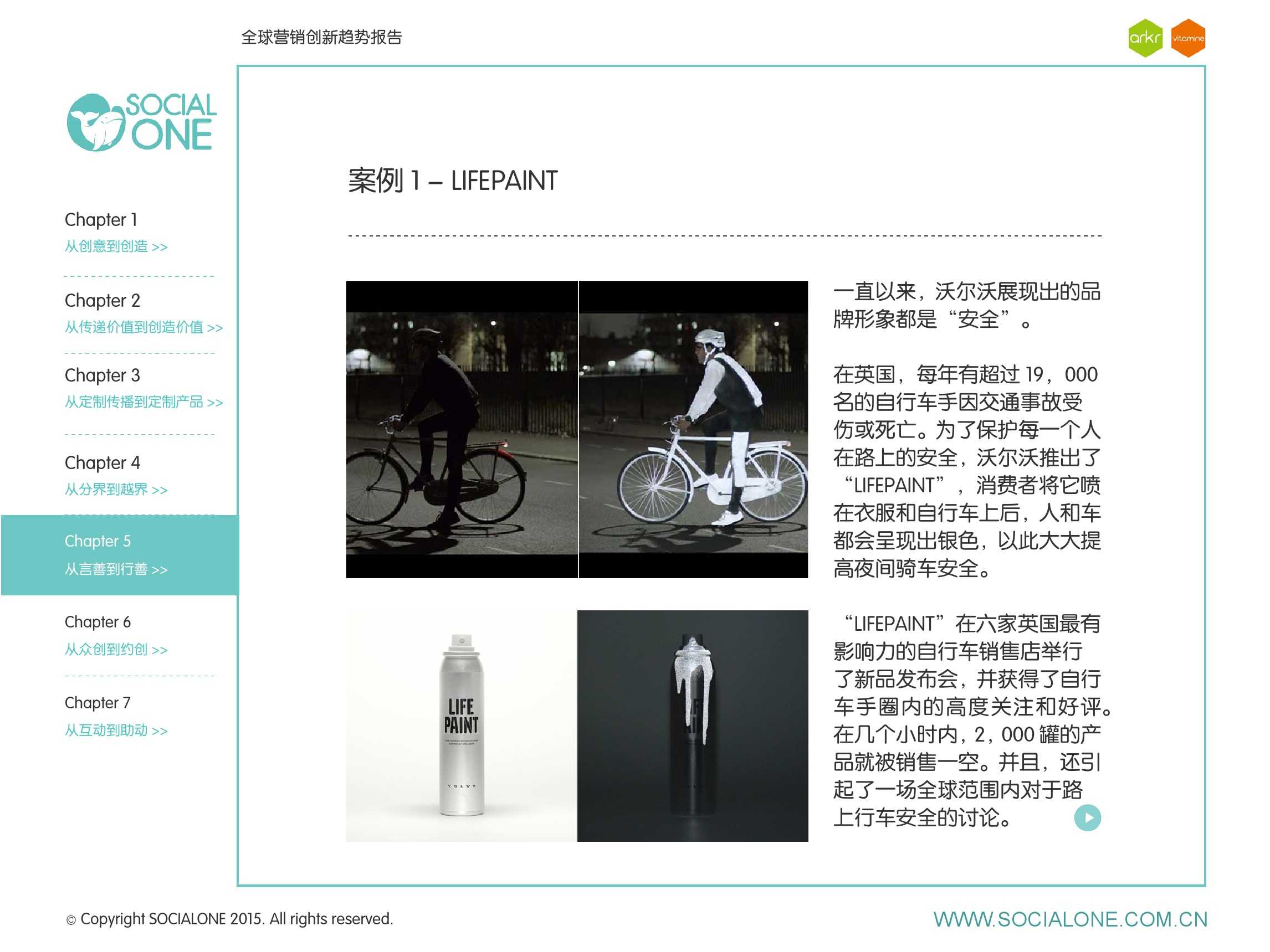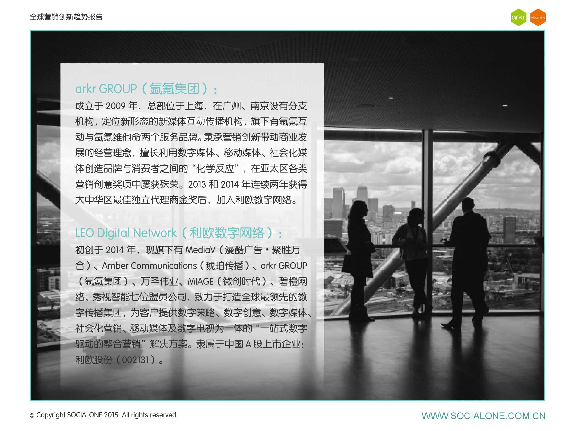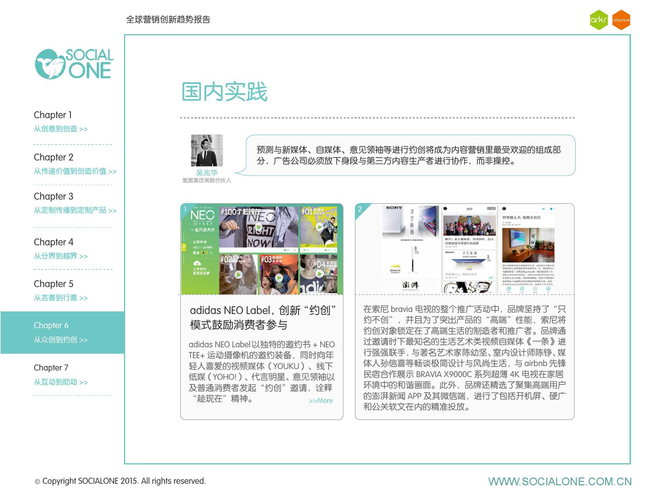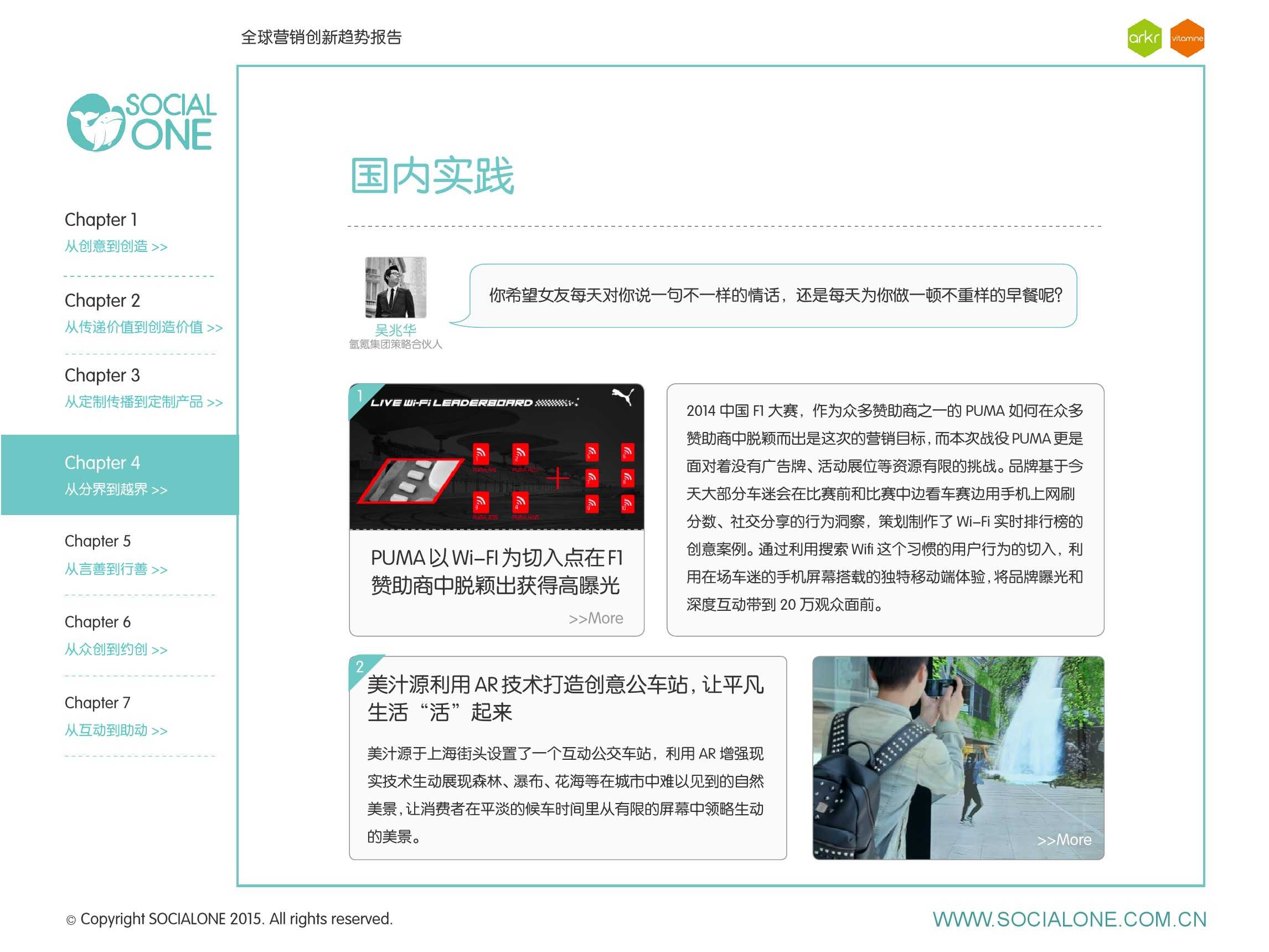 氩氪集团一直致力于品牌和消费者之间的化学反应,而创新无疑是产生化学反应最关键的“催化剂”。在今年许多案例中,氩氪集团就已经在“用创业精神做创意”,玩转创意,真正做到用创意来说话。一些优秀案例也被收录进了这份报告中,如“PUMA WIFI实时排名榜”以WI-FI为切入点,用手机屏幕给用户带来品牌曝光和互动;在腾讯“99公益日”氩氪集团利用自身资源和互联网技术,制作微电影和H5页面,实践了“创意行善“;在“adidas NEO Label约创100个趁现在”活动中,氩氪集团为品牌打造了“约创”模板,向YOUKU、YOHO!及各类意见领袖发起邀请,共同诠释“趁现在”的品牌精神;在推广索尼BRAVIA电视时,氩氪集团又利用了高端生活的制造者制造内容,通过高端生活的推广者来推广内容,做到“只约不创”。