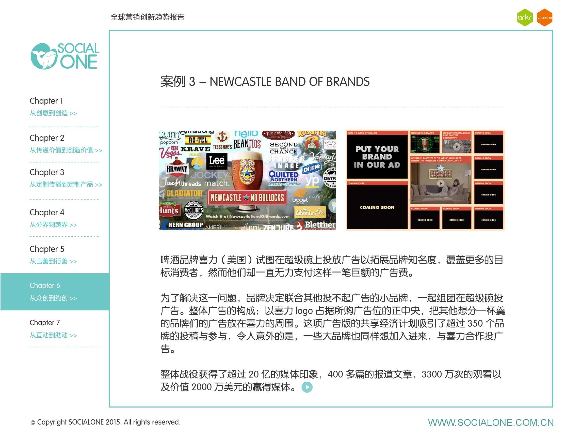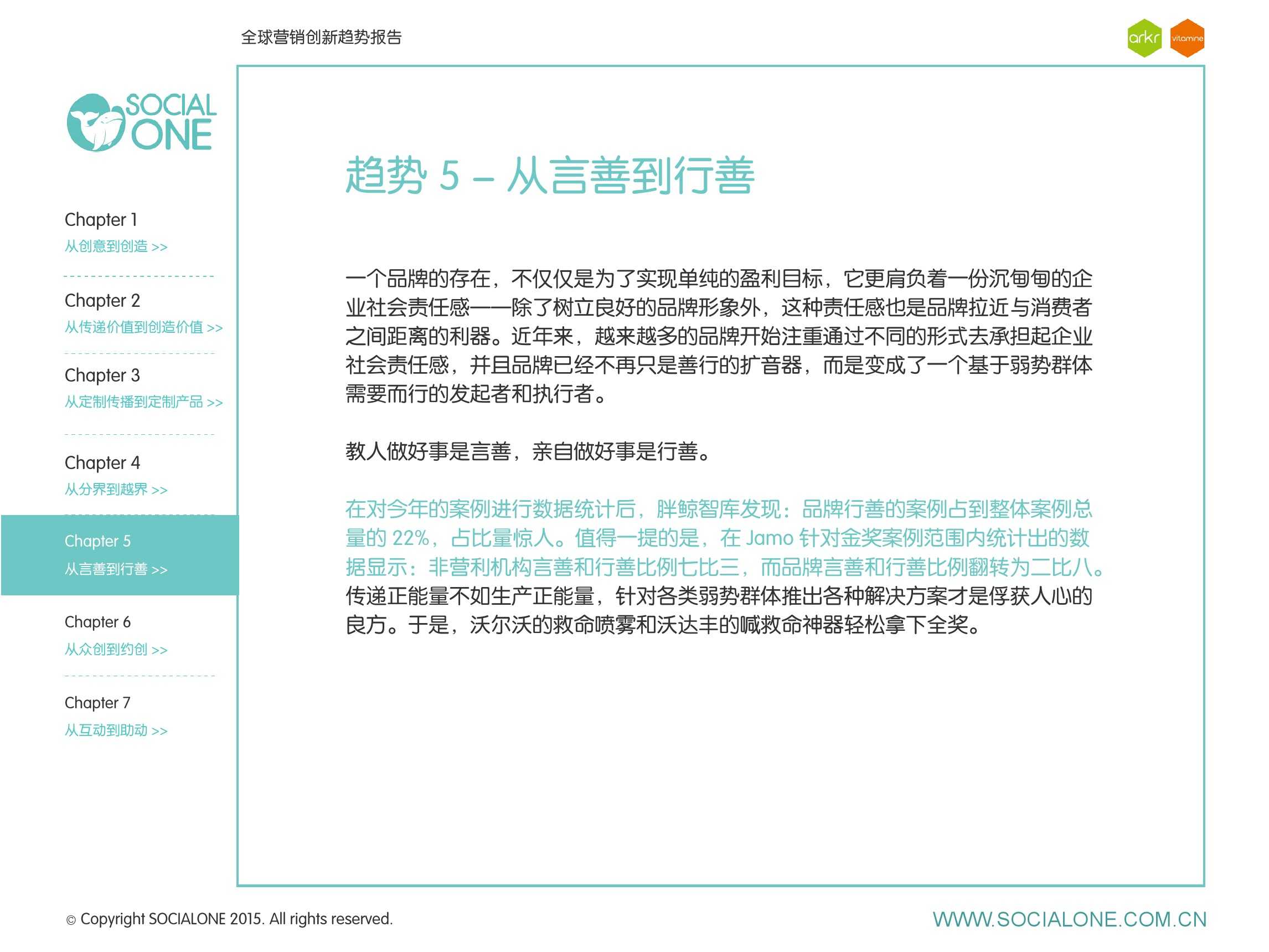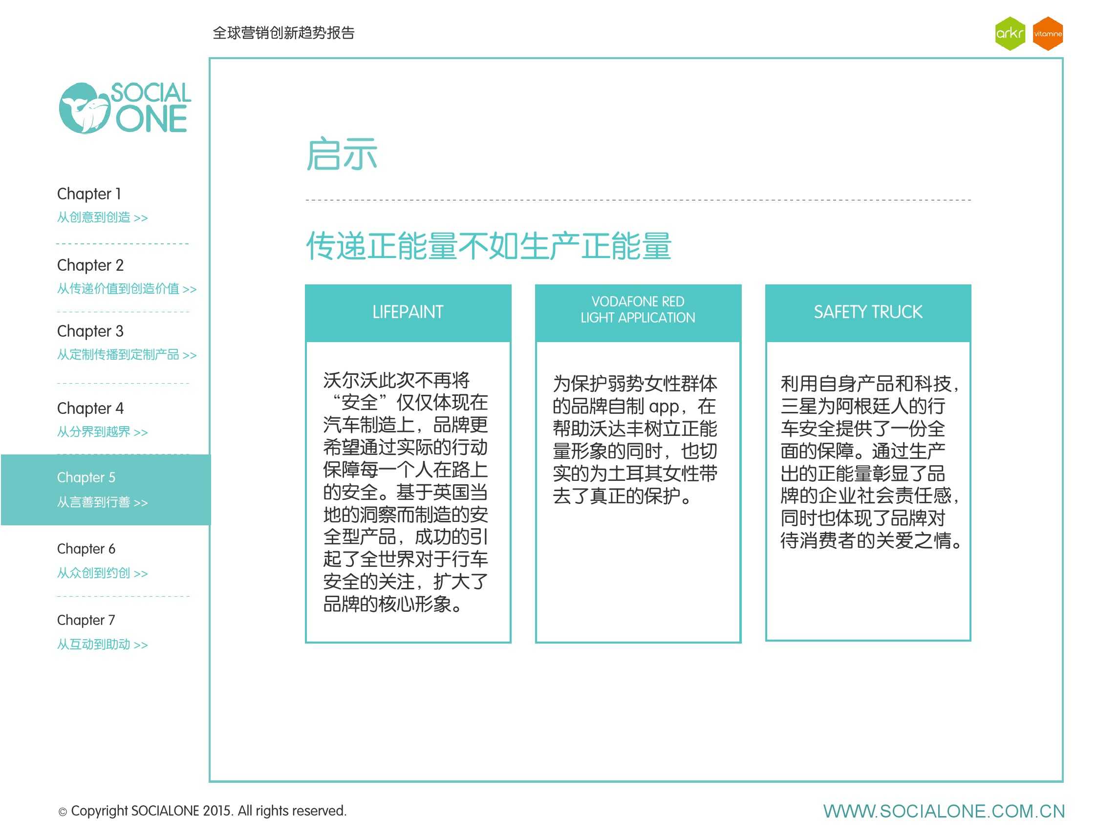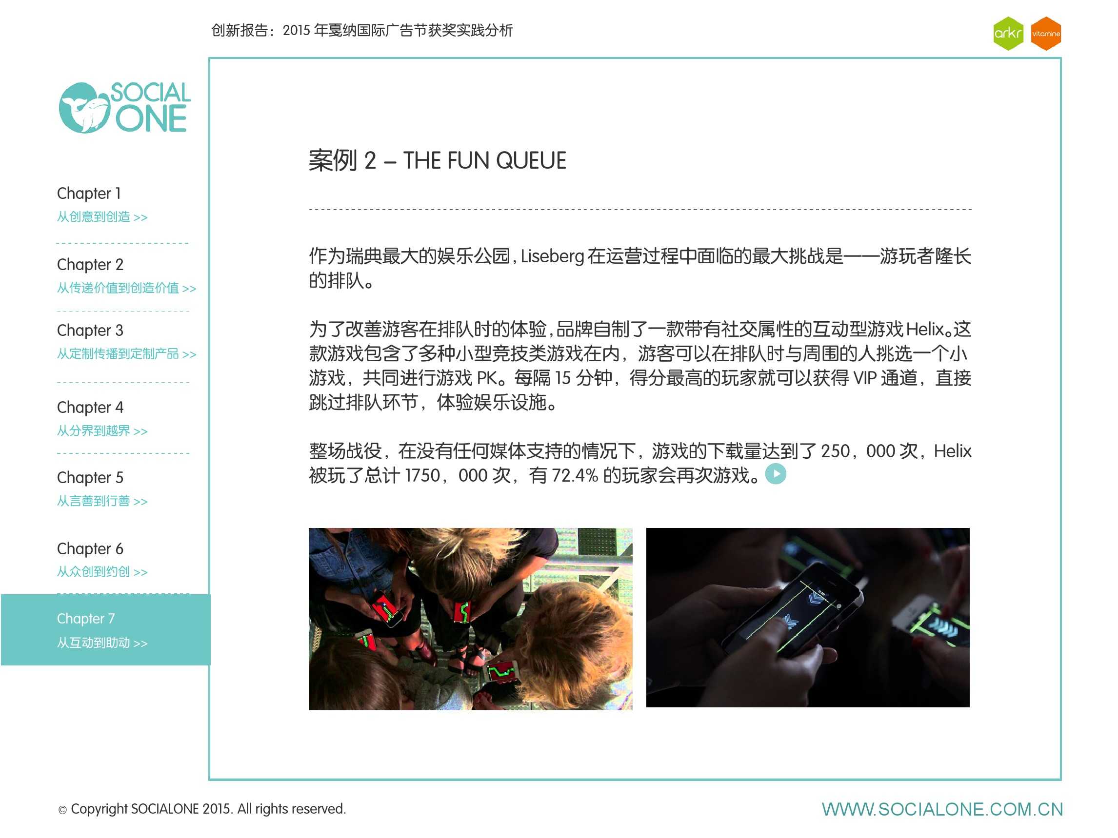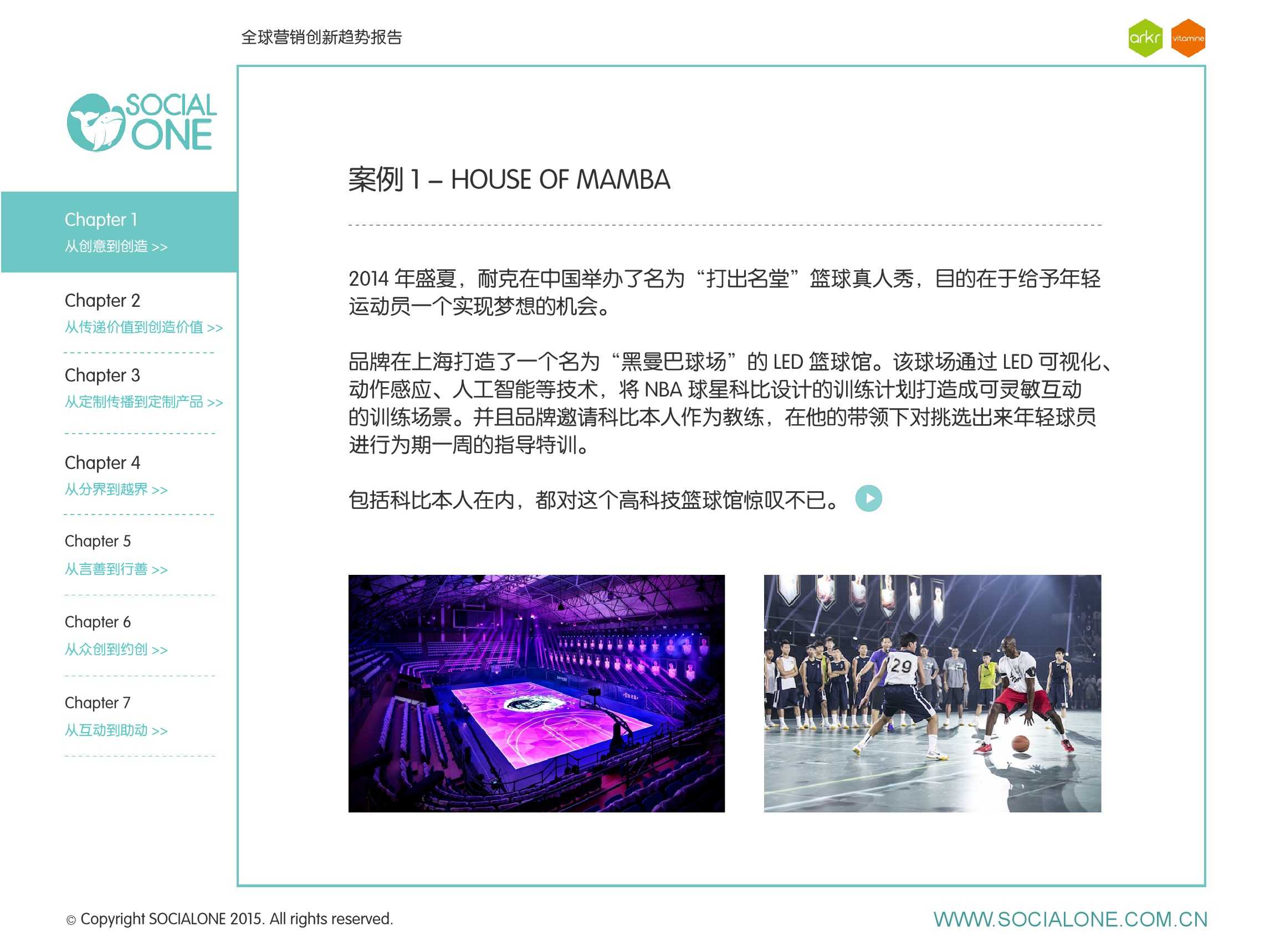 氩氪集团一直致力于品牌和消费者之间的化学反应,而创新无疑是产生化学反应最关键的“催化剂”。在今年许多案例中,氩氪集团就已经在“用创业精神做创意”,玩转创意,真正做到用创意来说话。一些优秀案例也被收录进了这份报告中,如“PUMA WIFI实时排名榜”以WI-FI为切入点,用手机屏幕给用户带来品牌曝光和互动;在腾讯“99公益日”氩氪集团利用自身资源和互联网技术,制作微电影和H5页面,实践了“创意行善“;在“adidas NEO Label约创100个趁现在”活动中,氩氪集团为品牌打造了“约创”模板,向YOUKU、YOHO!及各类意见领袖发起邀请,共同诠释“趁现在”的品牌精神;在推广索尼BRAVIA电视时,氩氪集团又利用了高端生活的制造者制造内容,通过高端生活的推广者来推广内容,做到“只约不创”。
