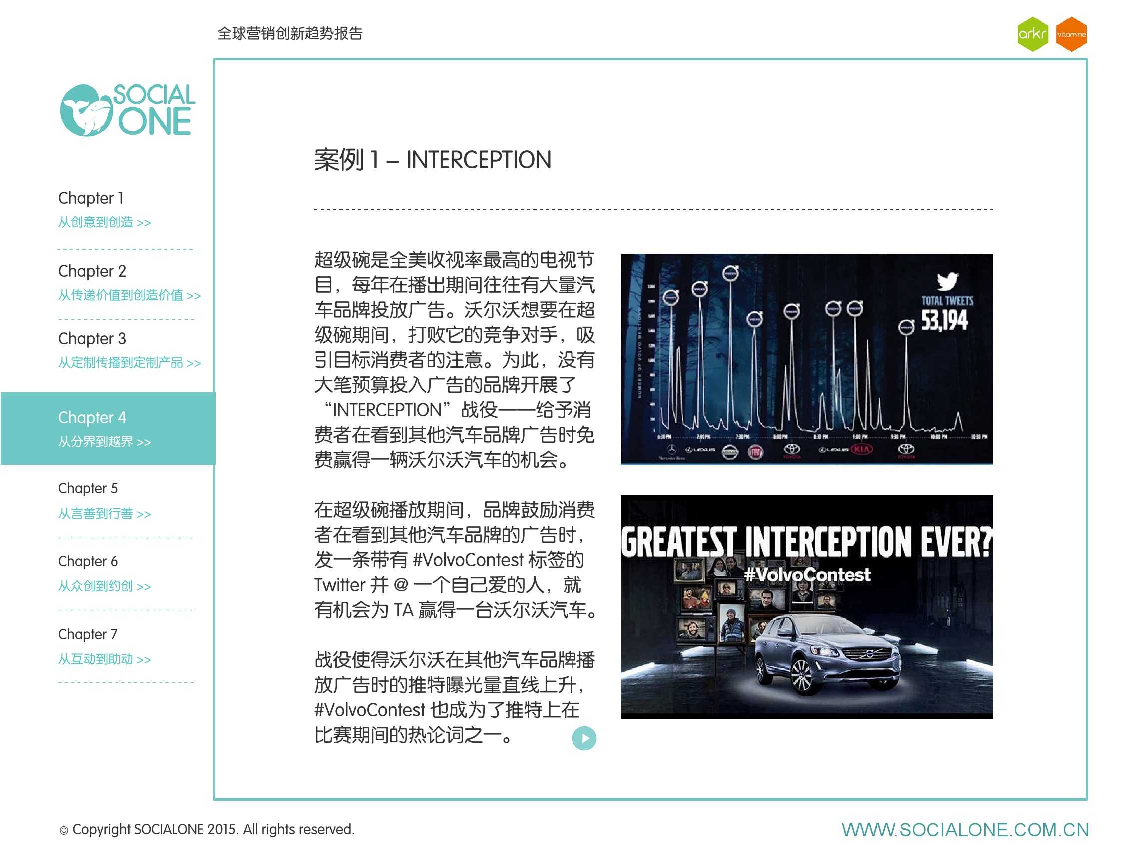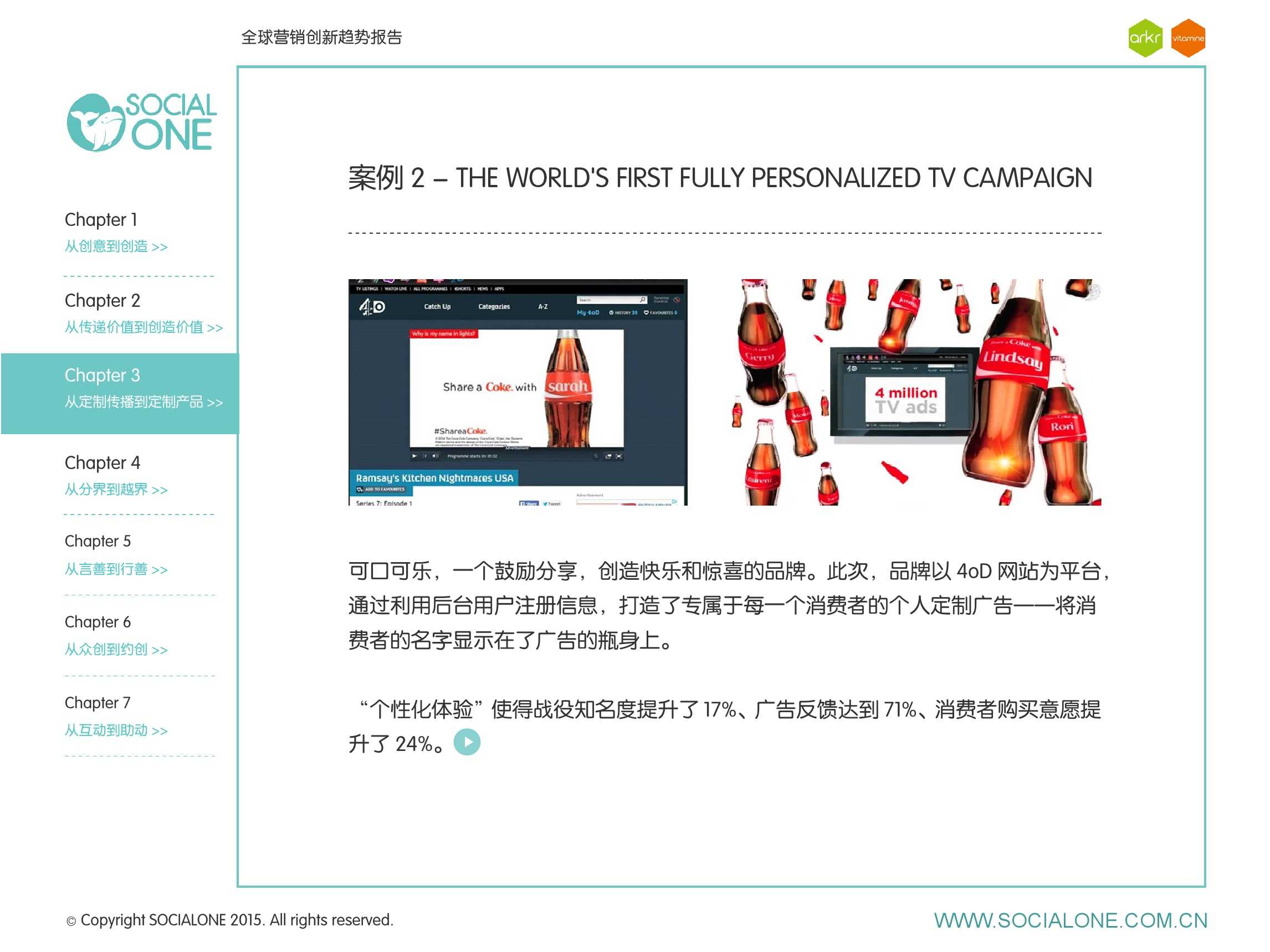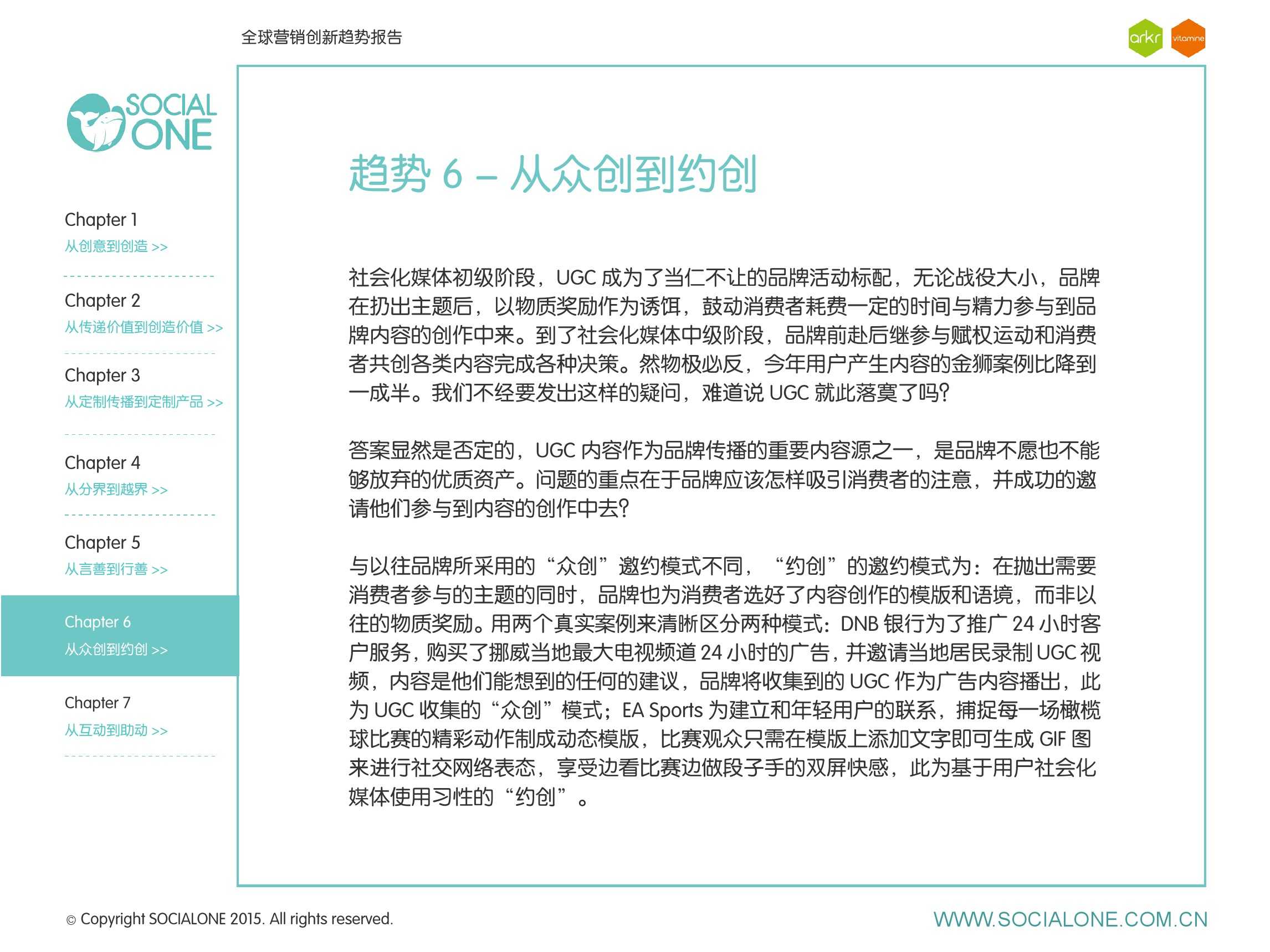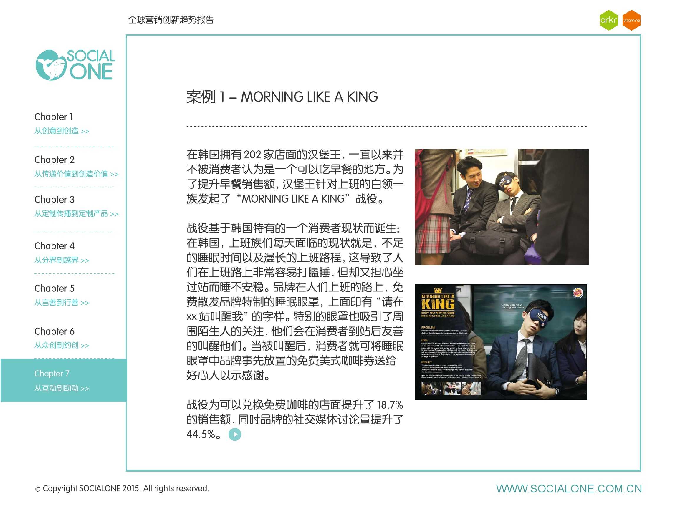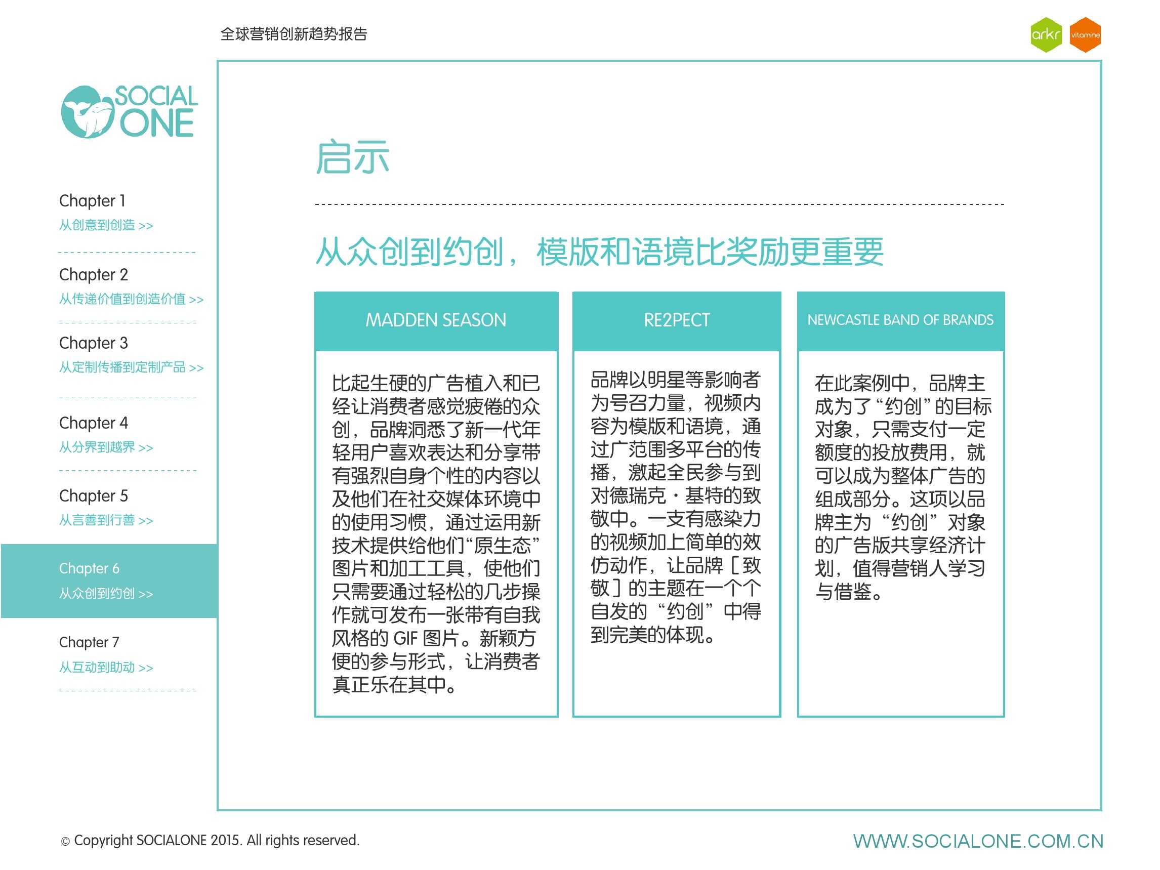 氩氪集团一直致力于品牌和消费者之间的化学反应,而创新无疑是产生化学反应最关键的“催化剂”。在今年许多案例中,氩氪集团就已经在“用创业精神做创意”,玩转创意,真正做到用创意来说话。一些优秀案例也被收录进了这份报告中,如“PUMA WIFI实时排名榜”以WI-FI为切入点,用手机屏幕给用户带来品牌曝光和互动;在腾讯“99公益日”氩氪集团利用自身资源和互联网技术,制作微电影和H5页面,实践了“创意行善“;在“adidas NEO Label约创100个趁现在”活动中,氩氪集团为品牌打造了“约创”模板,向YOUKU、YOHO!及各类意见领袖发起邀请,共同诠释“趁现在”的品牌精神;在推广索尼BRAVIA电视时,氩氪集团又利用了高端生活的制造者制造内容,通过高端生活的推广者来推广内容,做到“只约不创”。