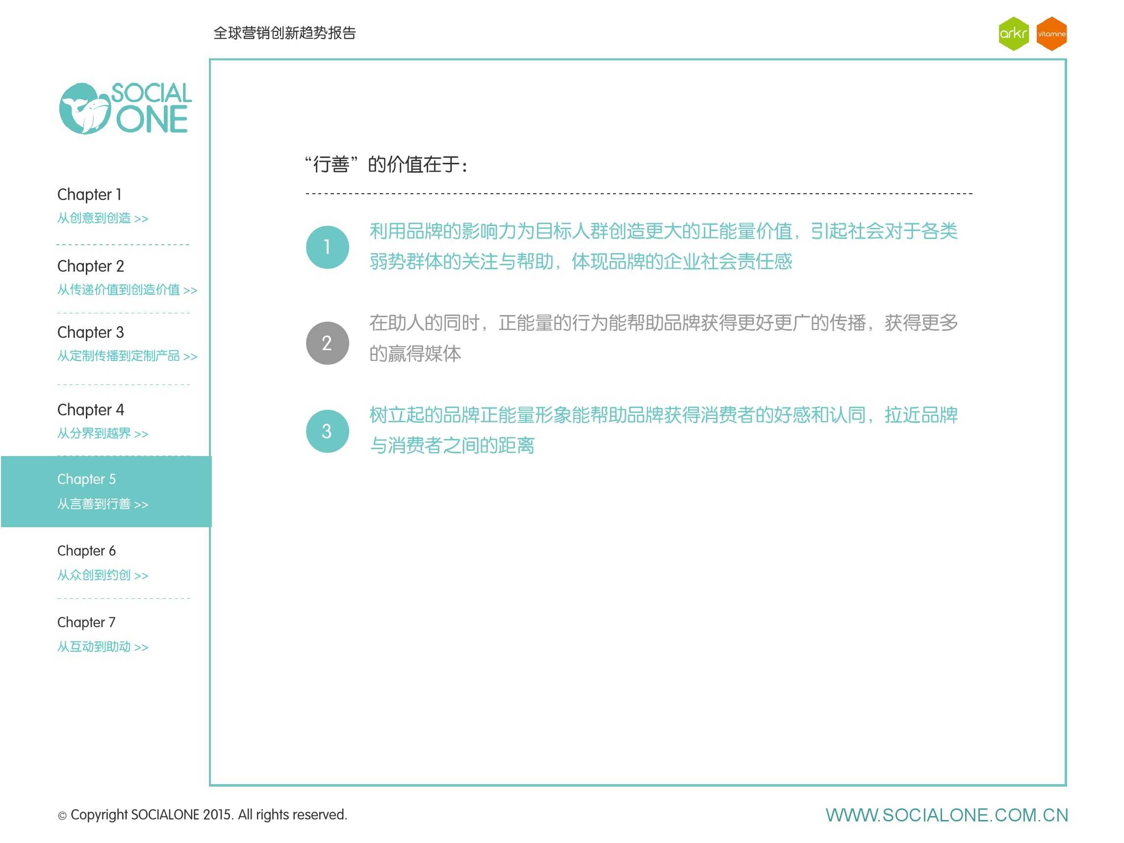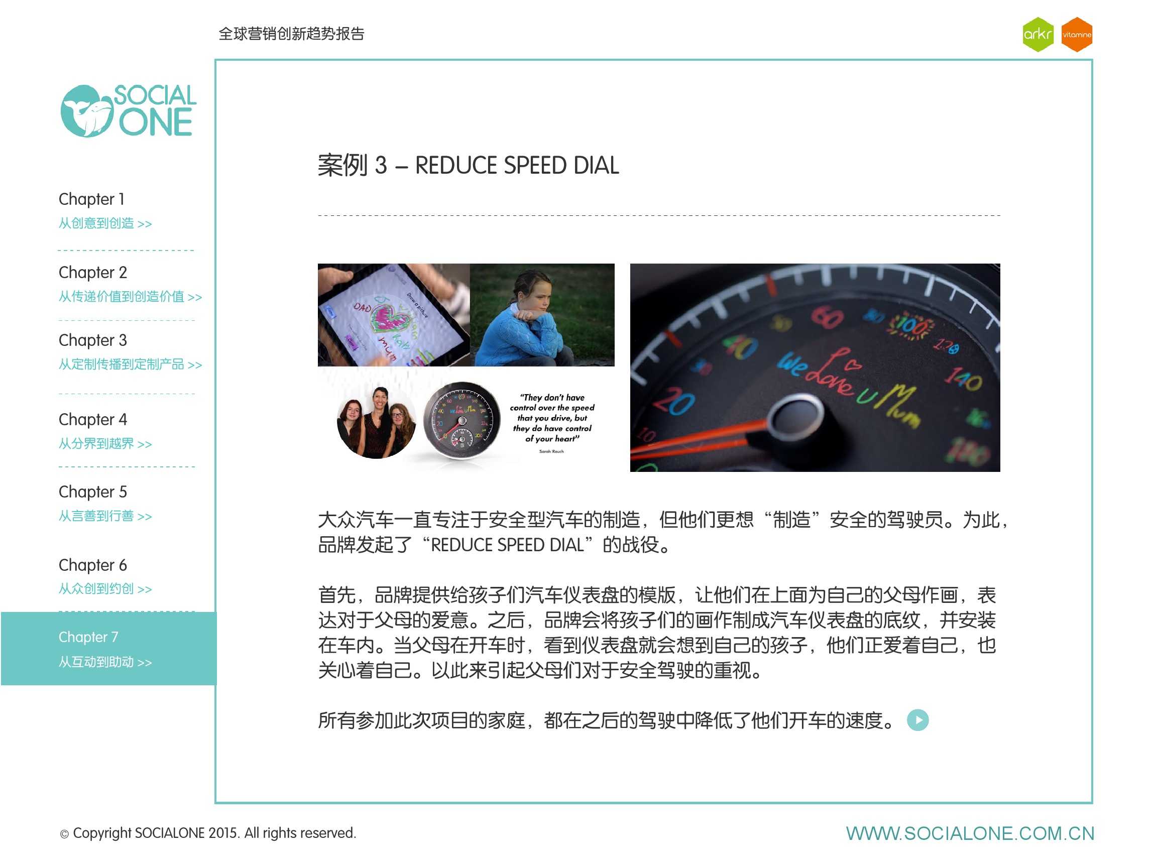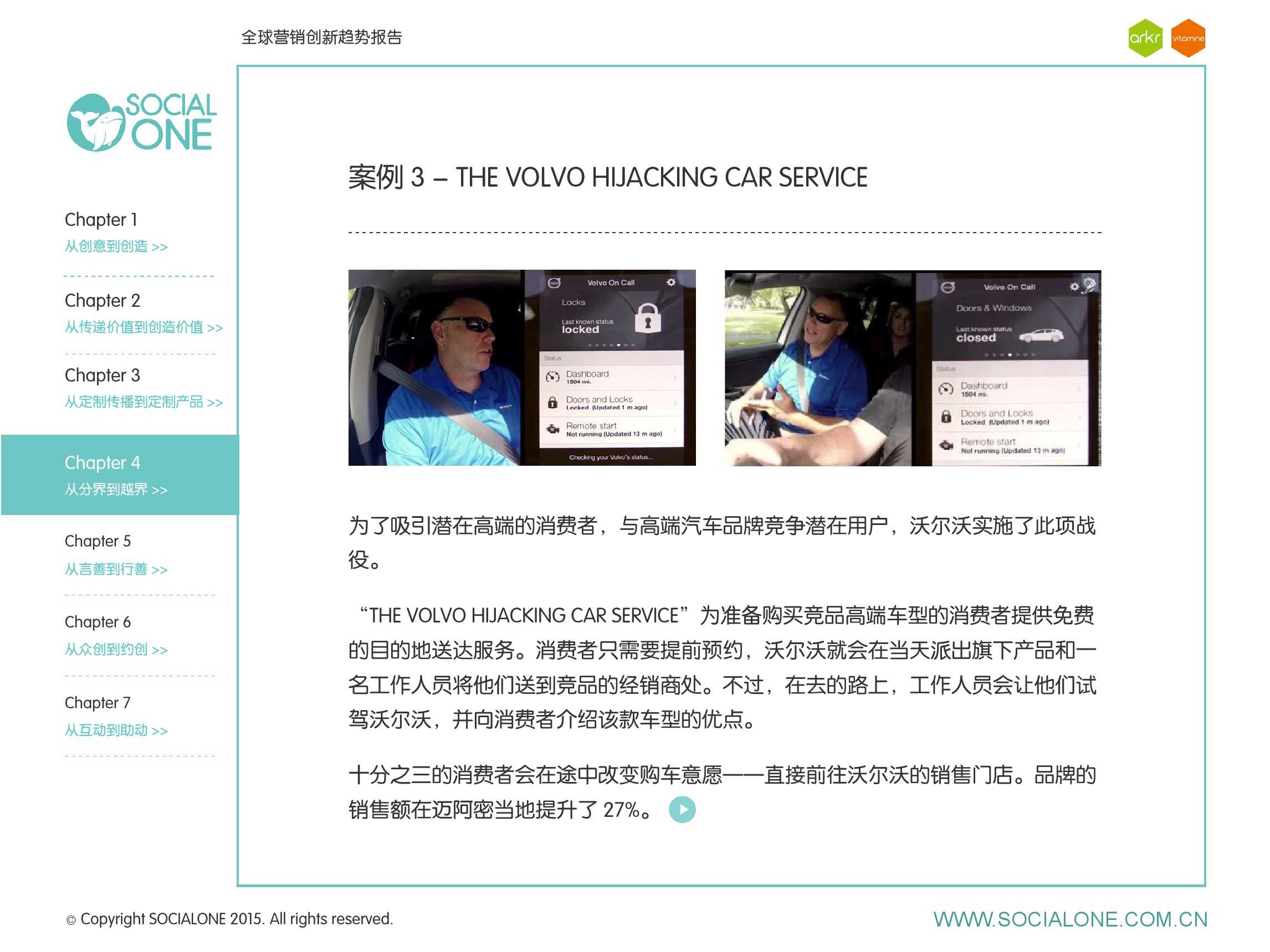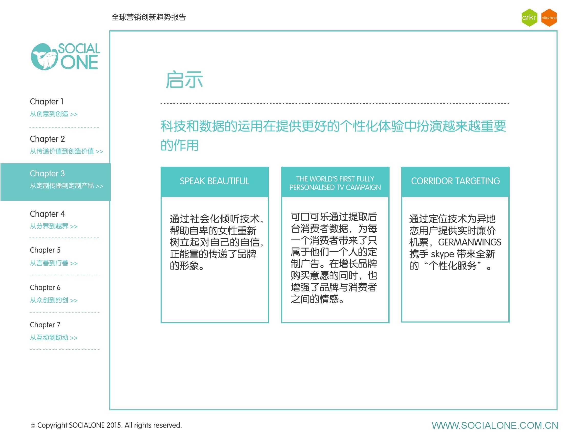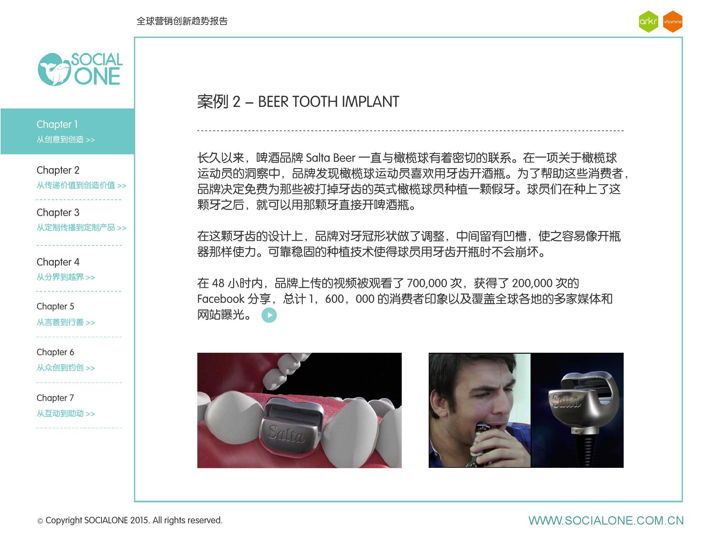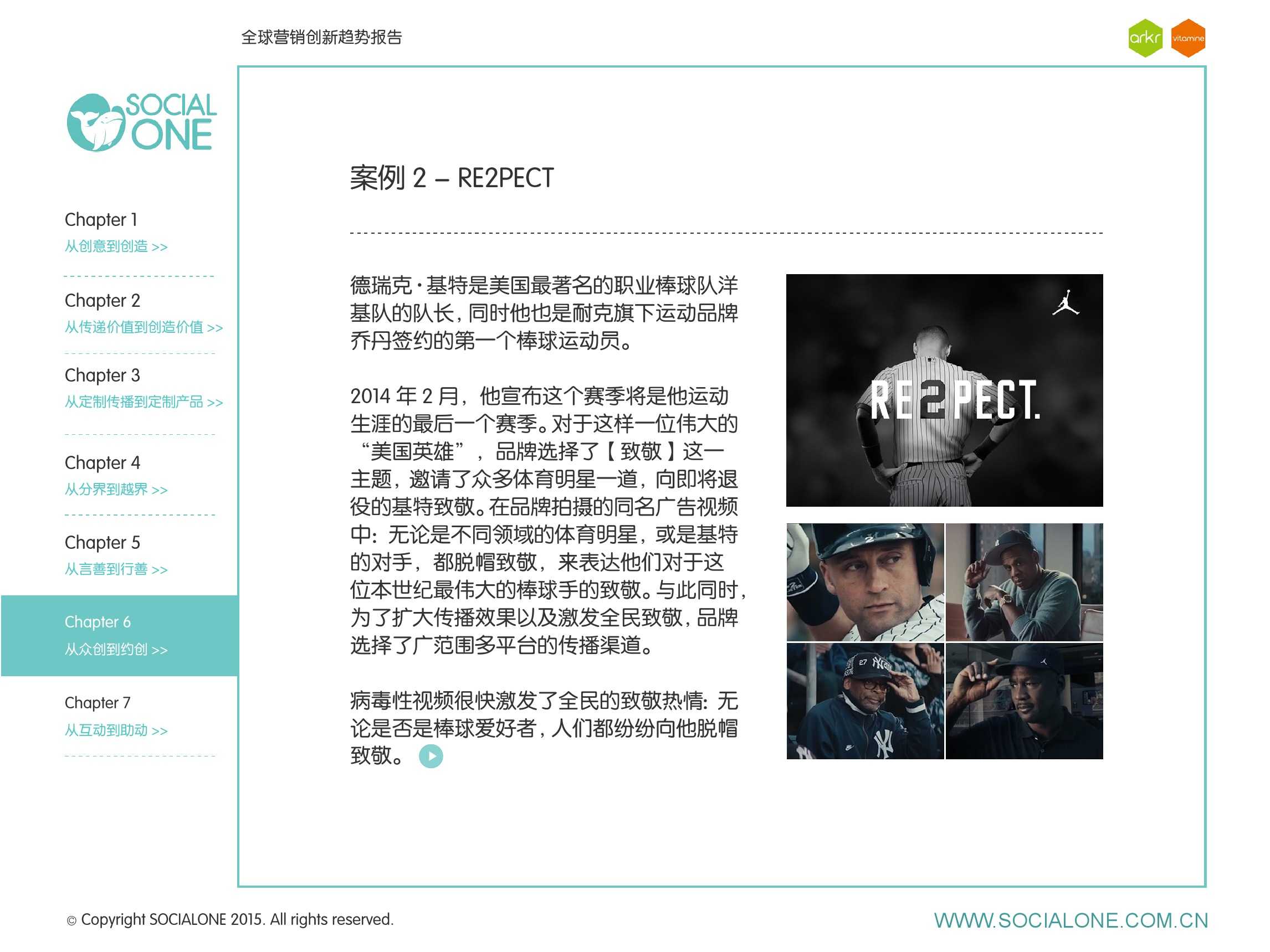 氩氪集团一直致力于品牌和消费者之间的化学反应,而创新无疑是产生化学反应最关键的“催化剂”。在今年许多案例中,氩氪集团就已经在“用创业精神做创意”,玩转创意,真正做到用创意来说话。一些优秀案例也被收录进了这份报告中,如“PUMA WIFI实时排名榜”以WI-FI为切入点,用手机屏幕给用户带来品牌曝光和互动;在腾讯“99公益日”氩氪集团利用自身资源和互联网技术,制作微电影和H5页面,实践了“创意行善“;在“adidas NEO Label约创100个趁现在”活动中,氩氪集团为品牌打造了“约创”模板,向YOUKU、YOHO!及各类意见领袖发起邀请,共同诠释“趁现在”的品牌精神;在推广索尼BRAVIA电视时,氩氪集团又利用了高端生活的制造者制造内容,通过高端生活的推广者来推广内容,做到“只约不创”。