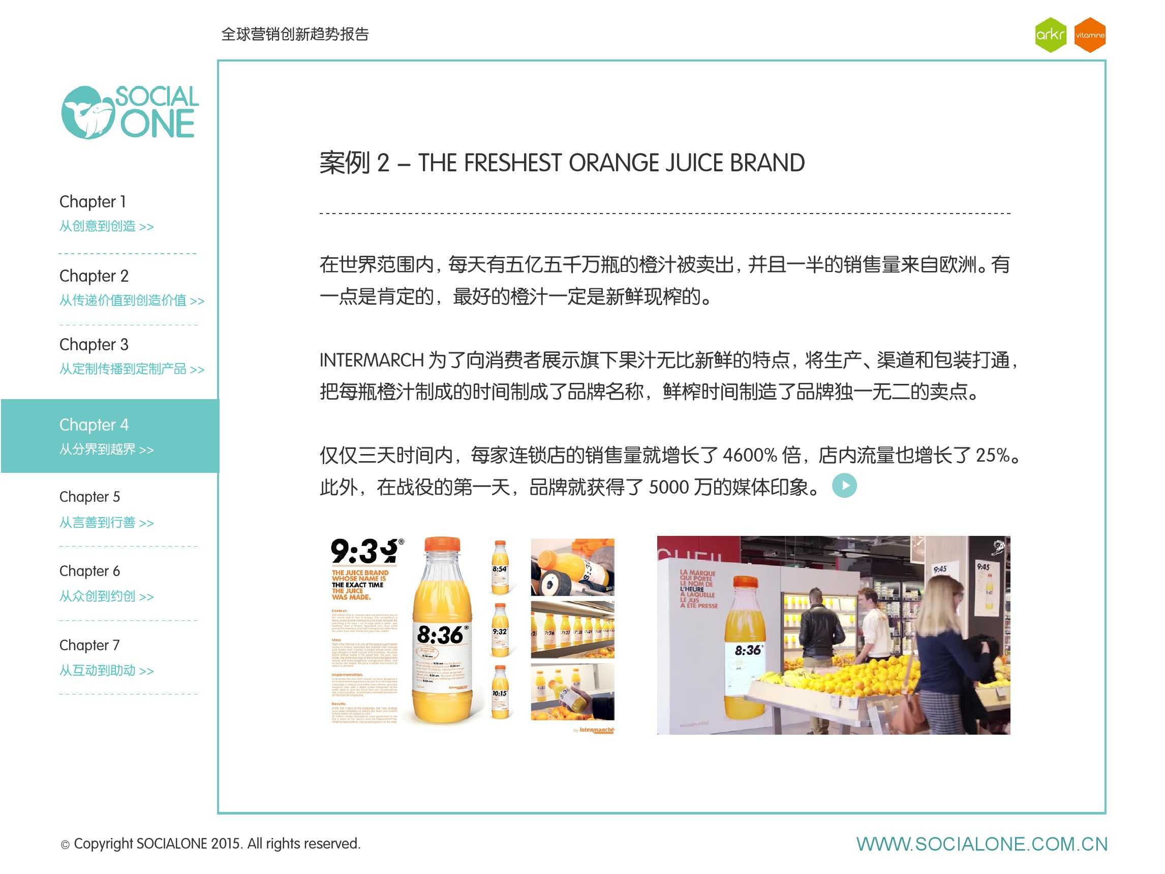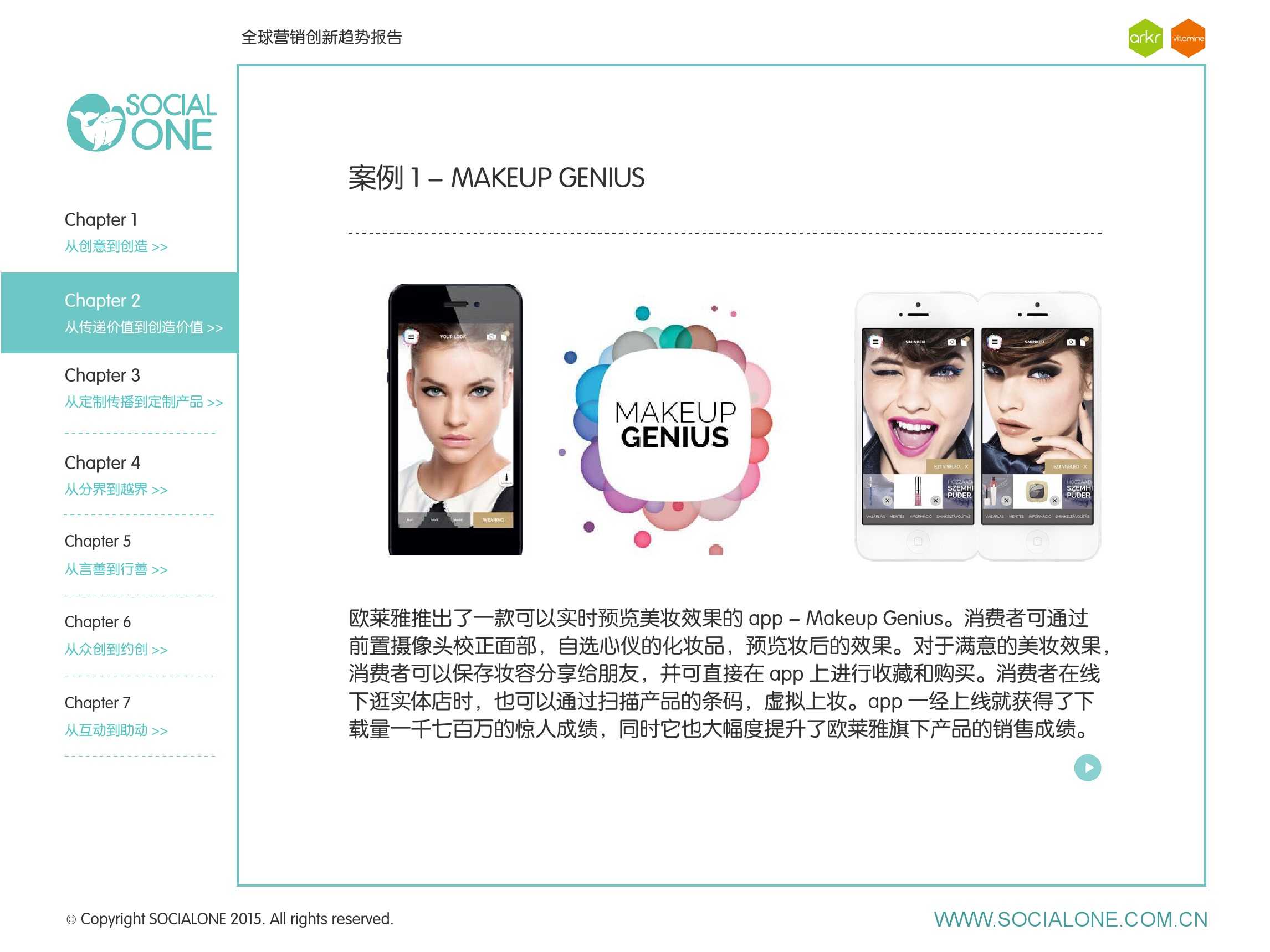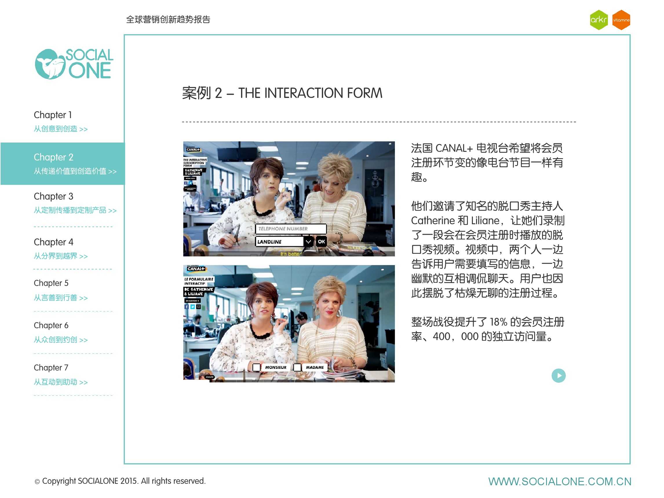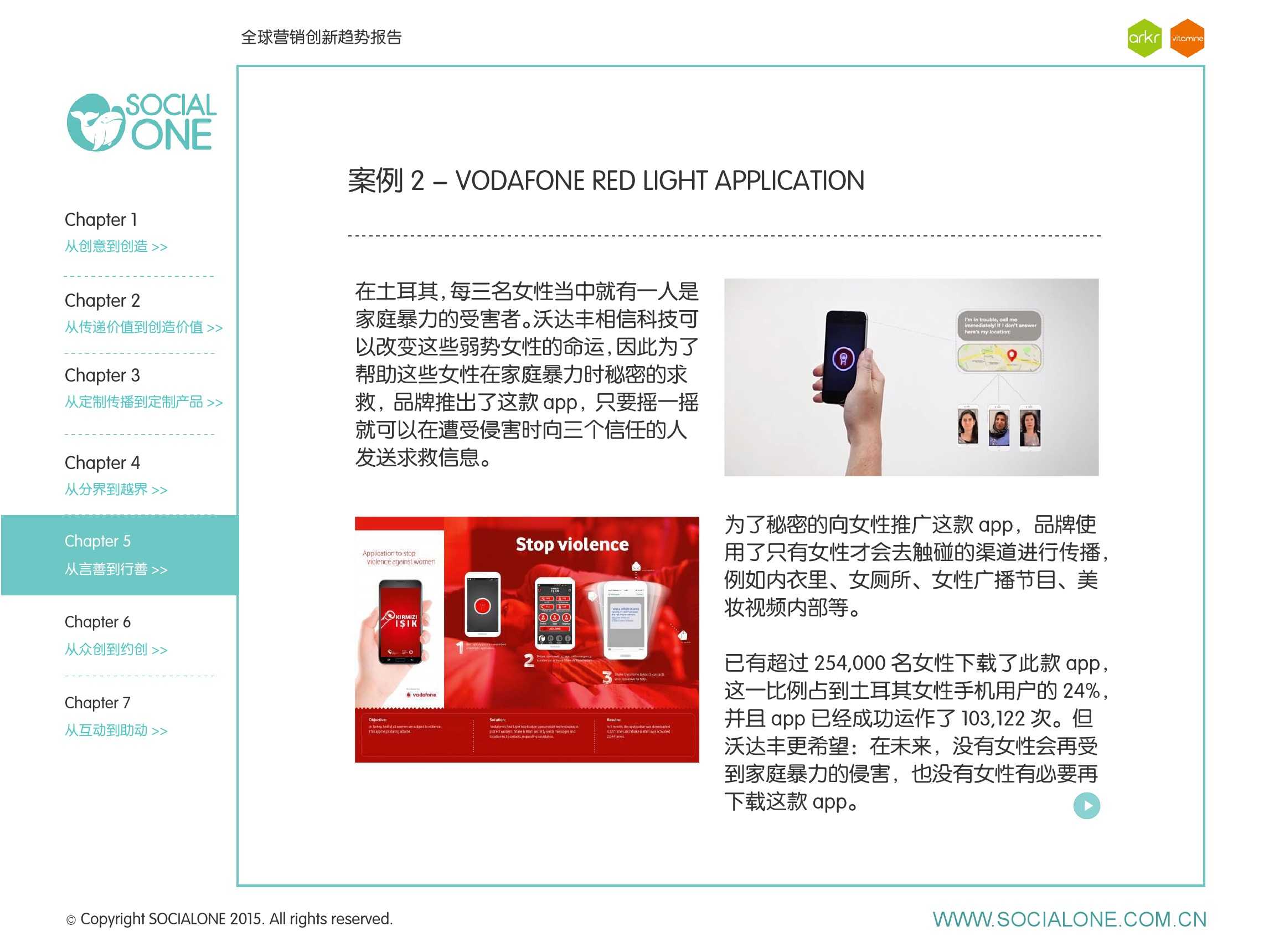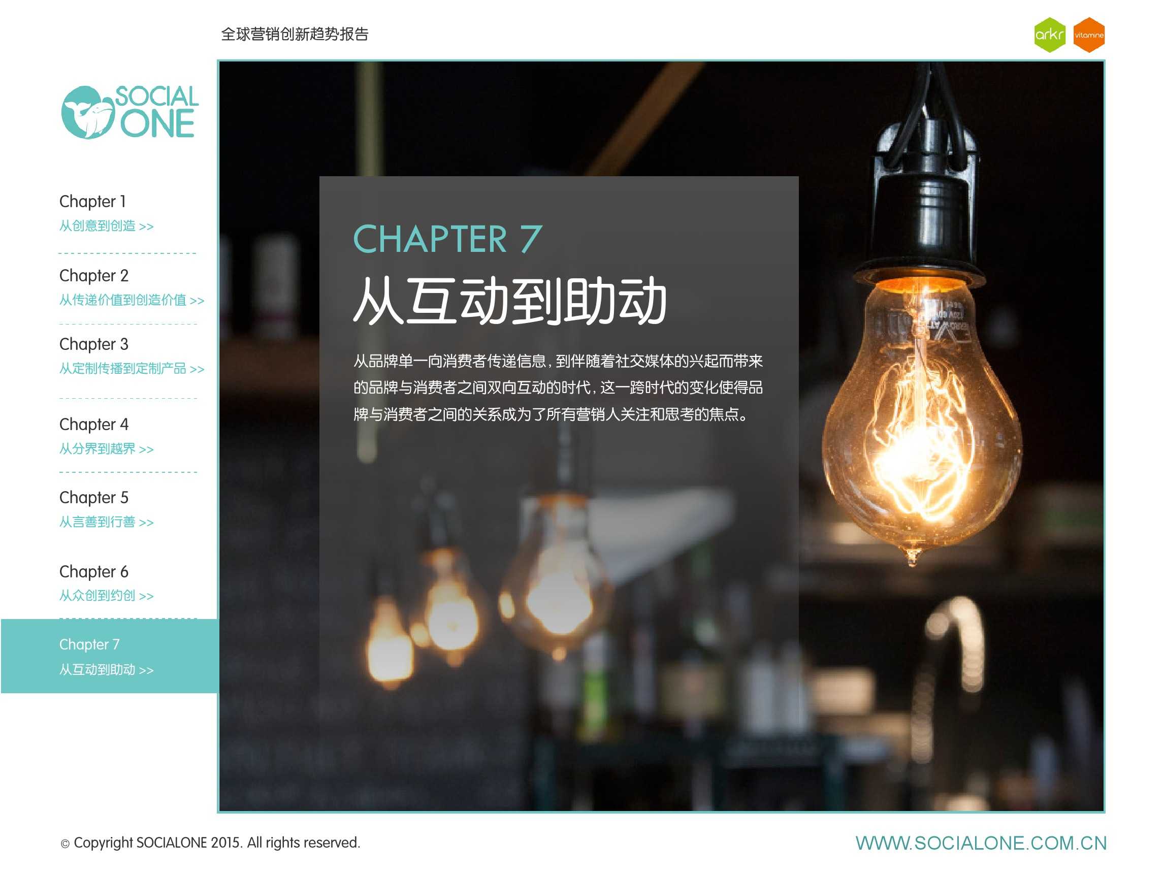 氩氪集团一直致力于品牌和消费者之间的化学反应,而创新无疑是产生化学反应最关键的“催化剂”。在今年许多案例中,氩氪集团就已经在“用创业精神做创意”,玩转创意,真正做到用创意来说话。一些优秀案例也被收录进了这份报告中,如“PUMA WIFI实时排名榜”以WI-FI为切入点,用手机屏幕给用户带来品牌曝光和互动;在腾讯“99公益日”氩氪集团利用自身资源和互联网技术,制作微电影和H5页面,实践了“创意行善“;在“adidas NEO Label约创100个趁现在”活动中,氩氪集团为品牌打造了“约创”模板,向YOUKU、YOHO!及各类意见领袖发起邀请,共同诠释“趁现在”的品牌精神;在推广索尼BRAVIA电视时,氩氪集团又利用了高端生活的制造者制造内容,通过高端生活的推广者来推广内容,做到“只约不创”。