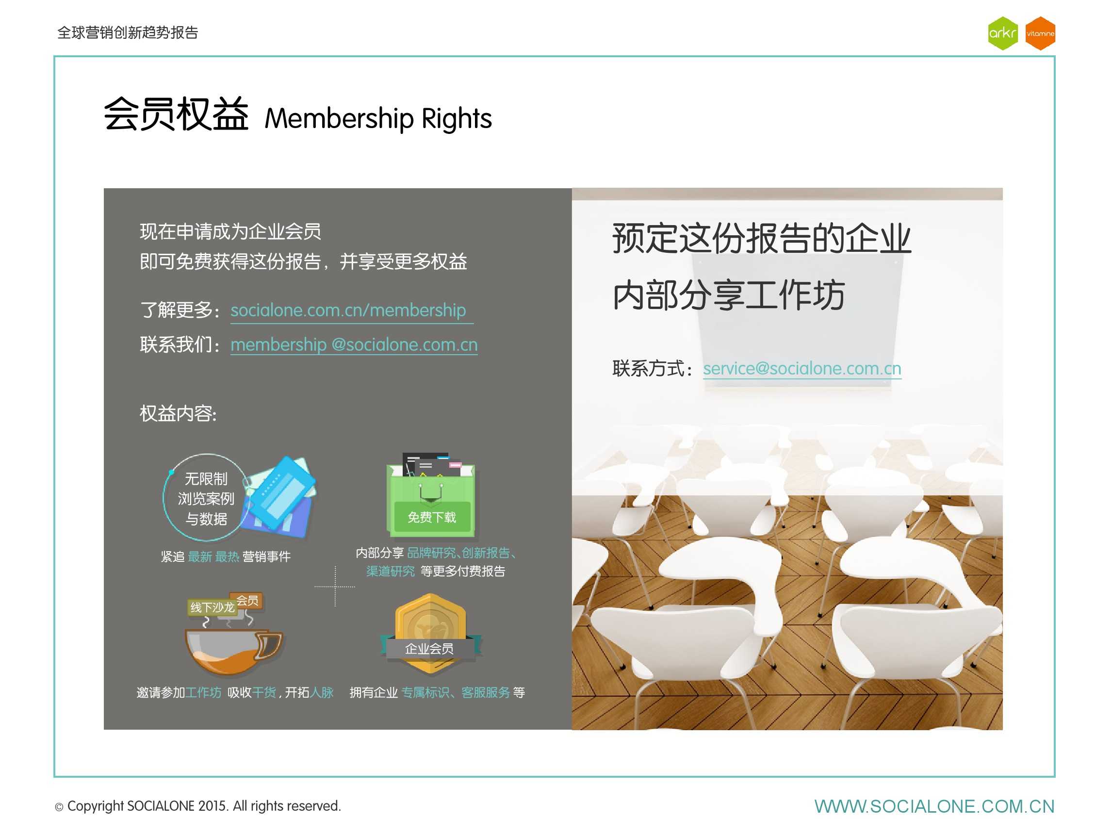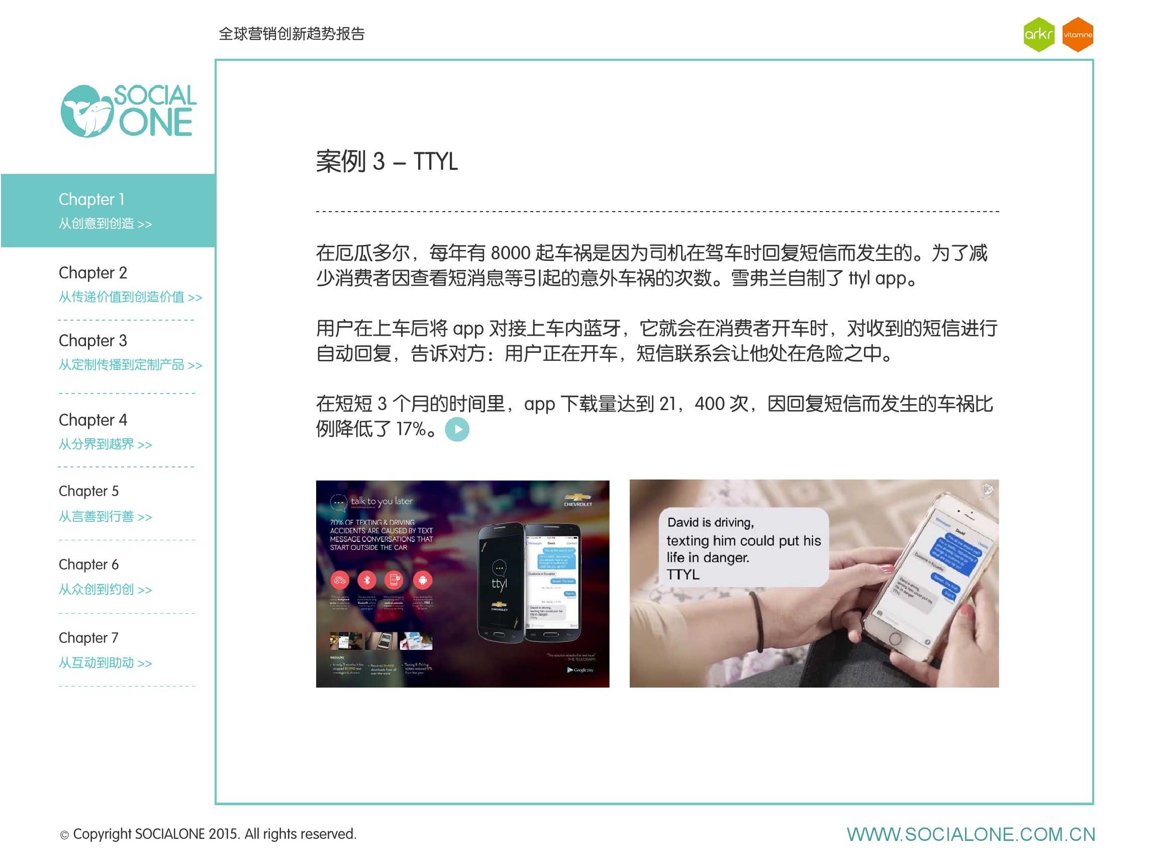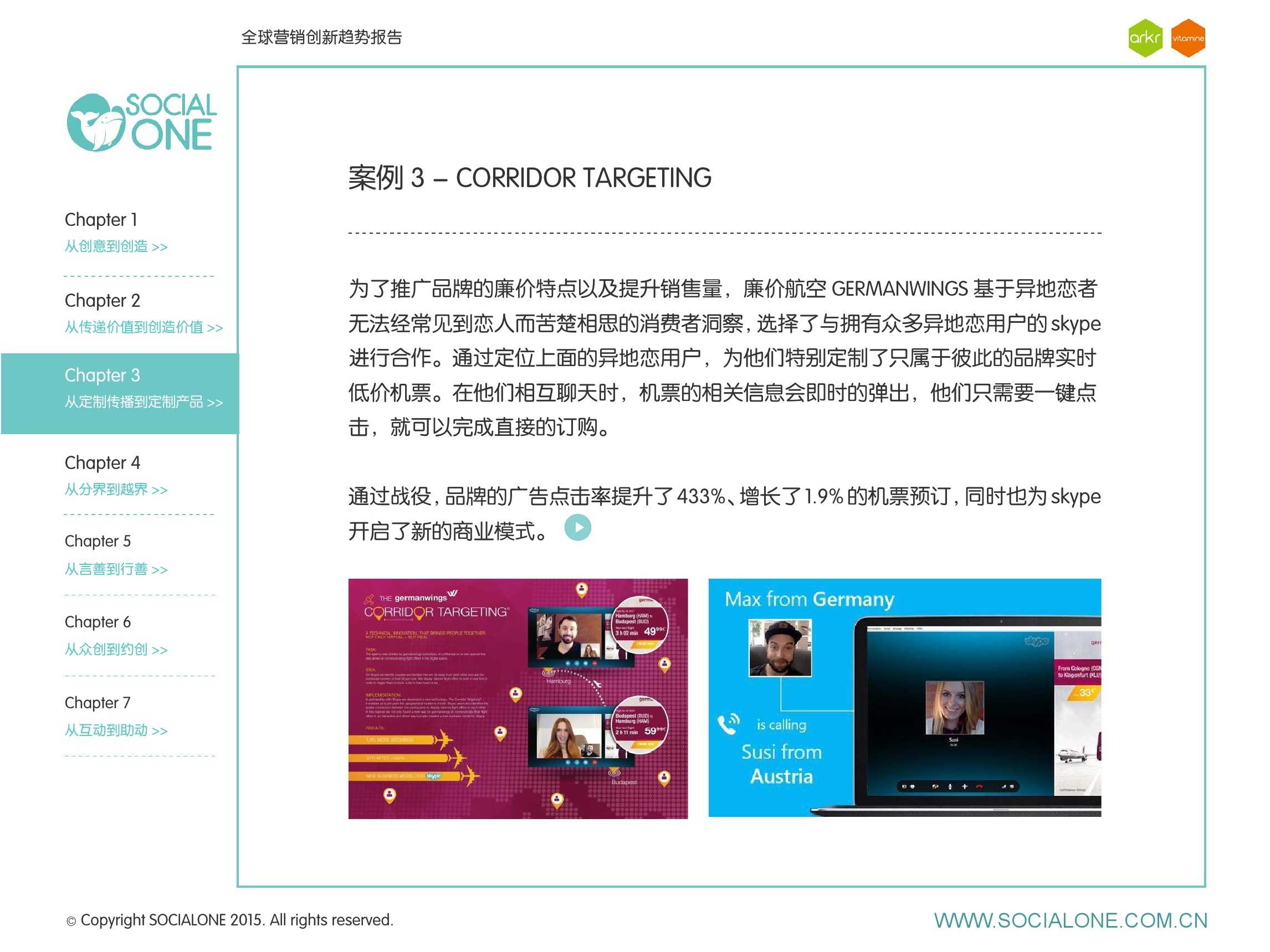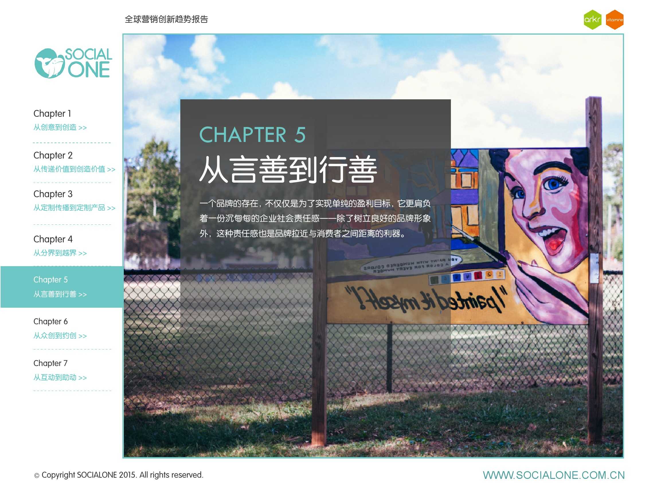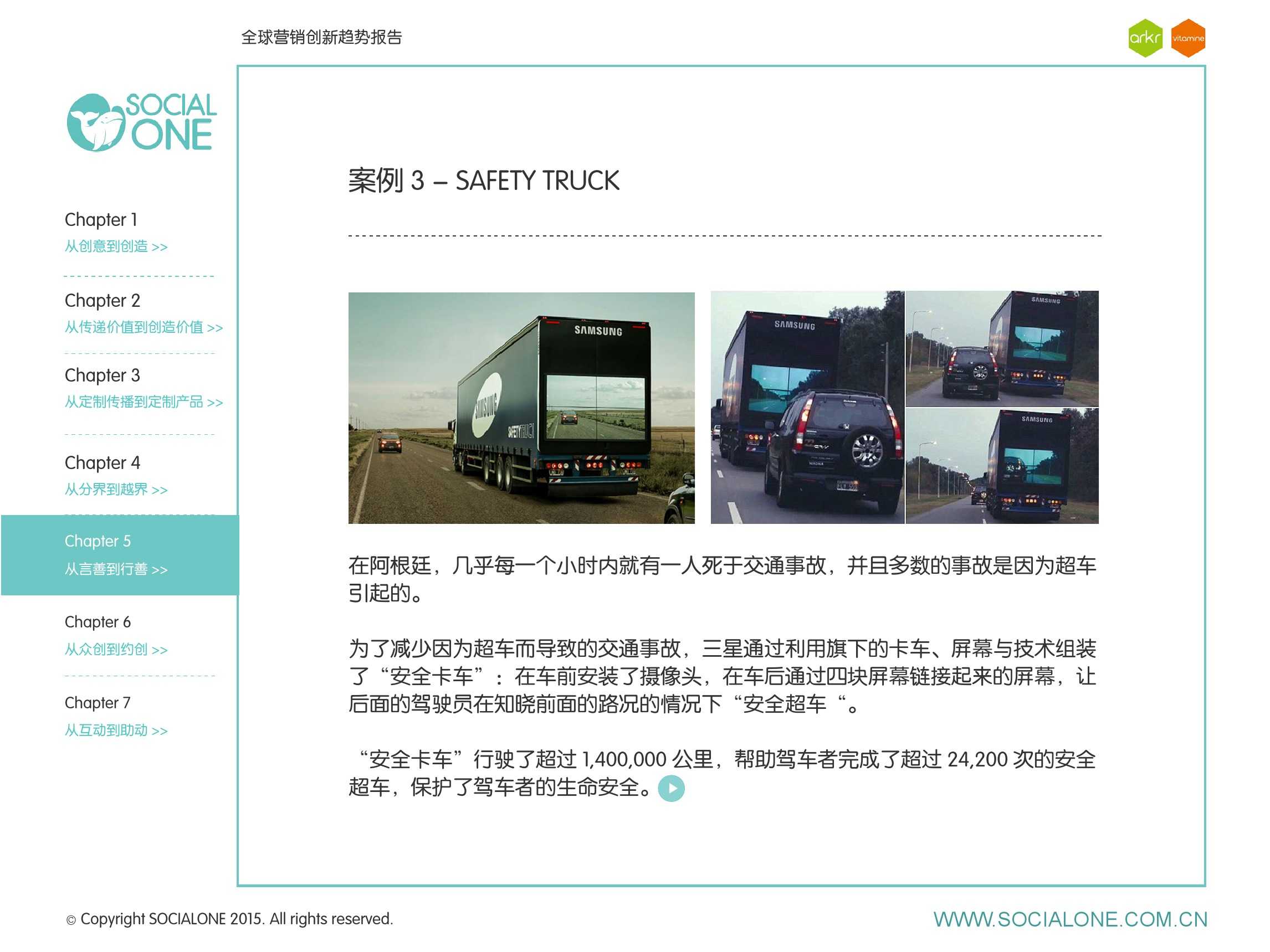 氩氪集团一直致力于品牌和消费者之间的化学反应,而创新无疑是产生化学反应最关键的“催化剂”。在今年许多案例中,氩氪集团就已经在“用创业精神做创意”,玩转创意,真正做到用创意来说话。一些优秀案例也被收录进了这份报告中,如“PUMA WIFI实时排名榜”以WI-FI为切入点,用手机屏幕给用户带来品牌曝光和互动;在腾讯“99公益日”氩氪集团利用自身资源和互联网技术,制作微电影和H5页面,实践了“创意行善“;在“adidas NEO Label约创100个趁现在”活动中,氩氪集团为品牌打造了“约创”模板,向YOUKU、YOHO!及各类意见领袖发起邀请,共同诠释“趁现在”的品牌精神;在推广索尼BRAVIA电视时,氩氪集团又利用了高端生活的制造者制造内容,通过高端生活的推广者来推广内容,做到“只约不创”。