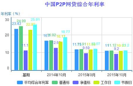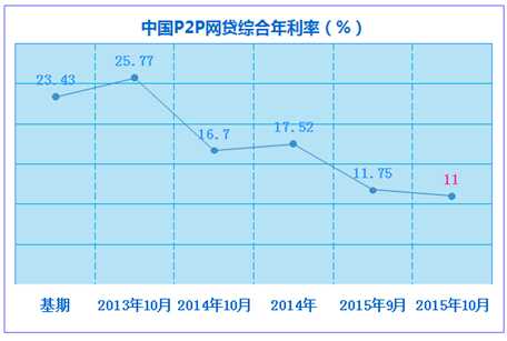 第一网贷报告显示,2015年10月份,全国P2P网贷平均综合年利率再次低于12%,达到11.00%,环比(较2015年9月份)11.75%,降低0.75个百分点;同比(较2014年10月份)16.70%,降低5.7个百分点;较去年全年17.52%,降低6.52个百分点;较基期23.43%,降低12.43个百分点。与前年同期(2013年10月份25.77%)比较,降低14.77个百分点。