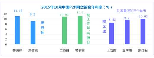 10月份全国P2P网贷平均综合年利率:普通标11.12%、净值标9.20%,较上月份11.91%、9.59%,分别降低0.79个百分点、0.39个百分点;较去年同期16.92%、12.62%,降低5.8个百分点、3.42个百分点;较基期24.99%、11.16%,降低13.87个百分点、1.96个百分点。