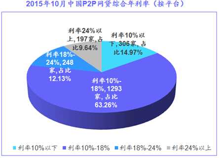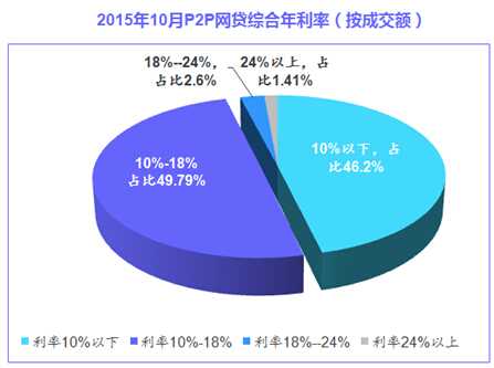 10月份全国P2P网贷总成交额的46.20%,年利率在10%以内,媲美银行;49.79%,年利率10%至18%;2.60%,年利率18%至24%;1.41%,年利率24%以上。其中10%以内的总成交额占比较上月增加14.33%;10%至18%,较上月减少12.63%;18%至24%,较上月减少0.75%,24%以上,较上月减少0.94%。