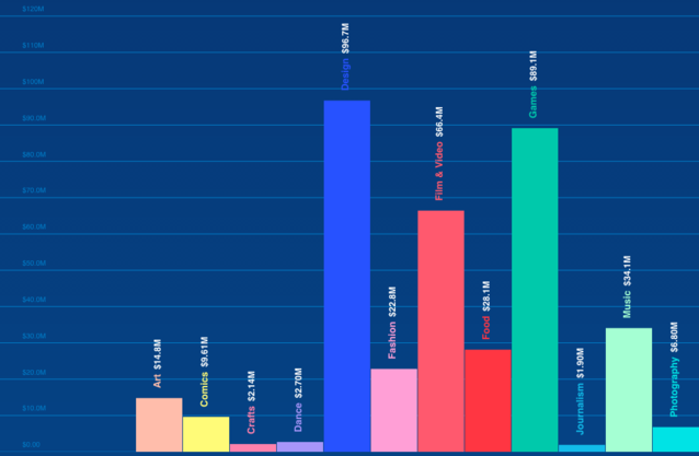 Kickstarter上面一张展示各学科得到的经费图: