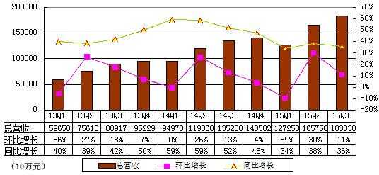 百度第三季度总营收达到183.83亿元(约合28.92亿美元),同比增长36%。其中网络营销营收为176.8亿元(约合27.82亿美元),同比增长了31.7%。2015年第三季度,百度活跃网络营销客户数量约为62.3万家,环比增长5.6%,同比增长20.7%。
