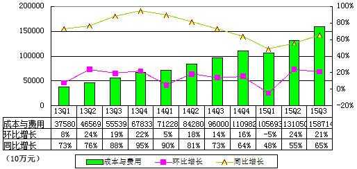 百度第三季度成本与费用为158.71亿元,较上一季度增长21%,较上年同期增长65%。