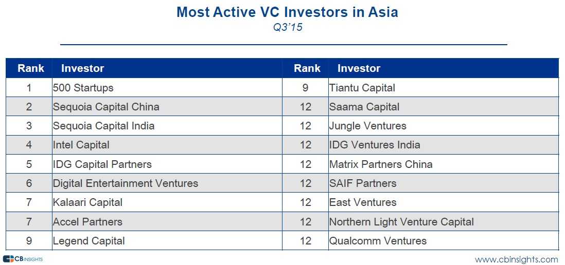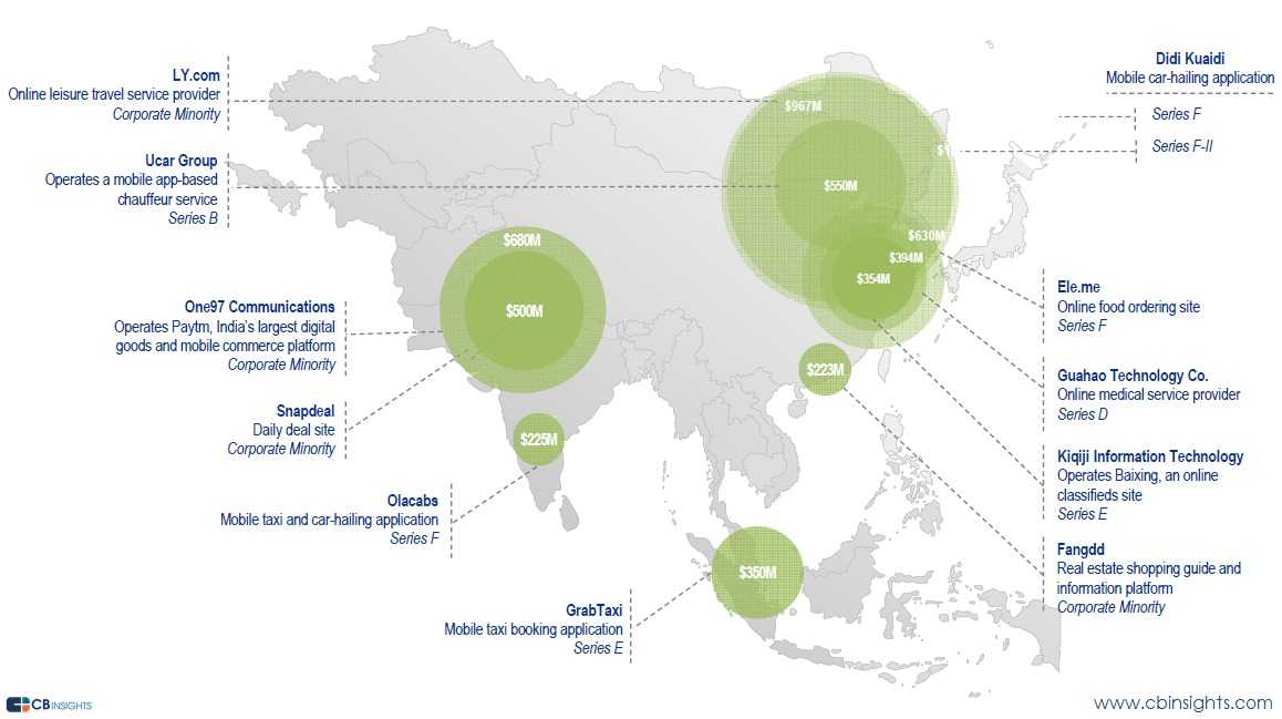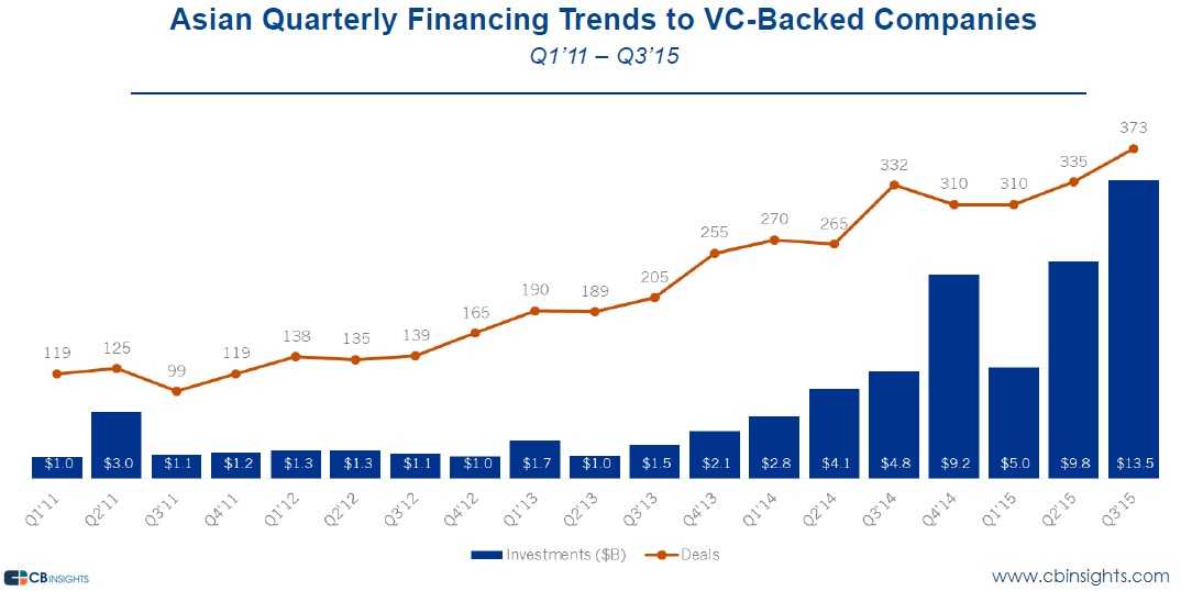 印度投资活动连续5个季度走高,第三季度有135宗交易,交易额27.8亿美元。3宗最大的交易包括One97 Communications, Snapdeal和 Olacabs。最活跃的城市包括Bangalore (34 宗交易, 3.974亿美元), Mumbai (28 宗交易, 4.131亿美元)和Gurgaon (20宗交易, 2.502亿美元)。