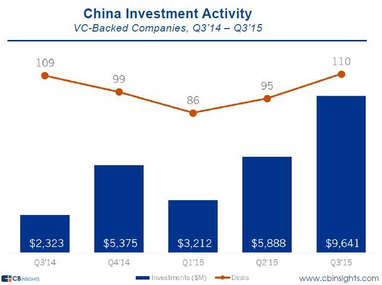 第三季度中国初创企业投资达到96.4亿美元(110宗交易)。最活跃的城市是北京(33宗交易,13.3亿美元)、上海(23宗交易,16亿美元)、深圳(14宗交易,7.619亿美元)。