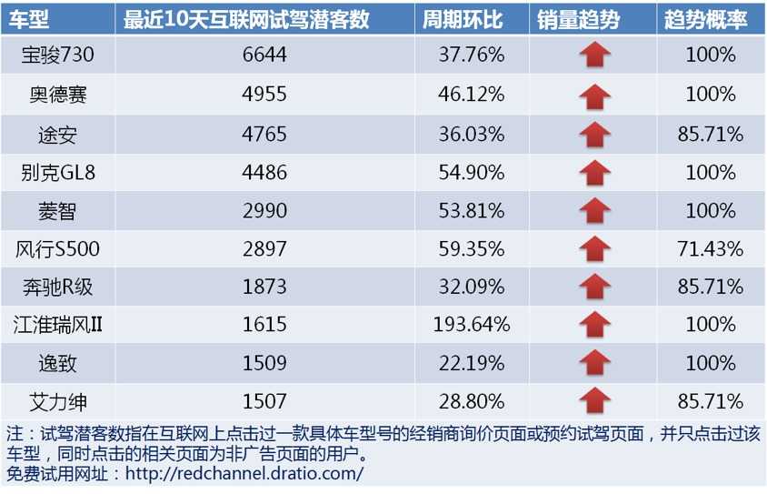根据缔元信红渠汽车互联网营销数据库的试驾潜客数据,筛选出SUV、轿车和MPV下最近10天最受互联网购车用户关注的车型,并就这30款车型进行本周的销量趋势预测。