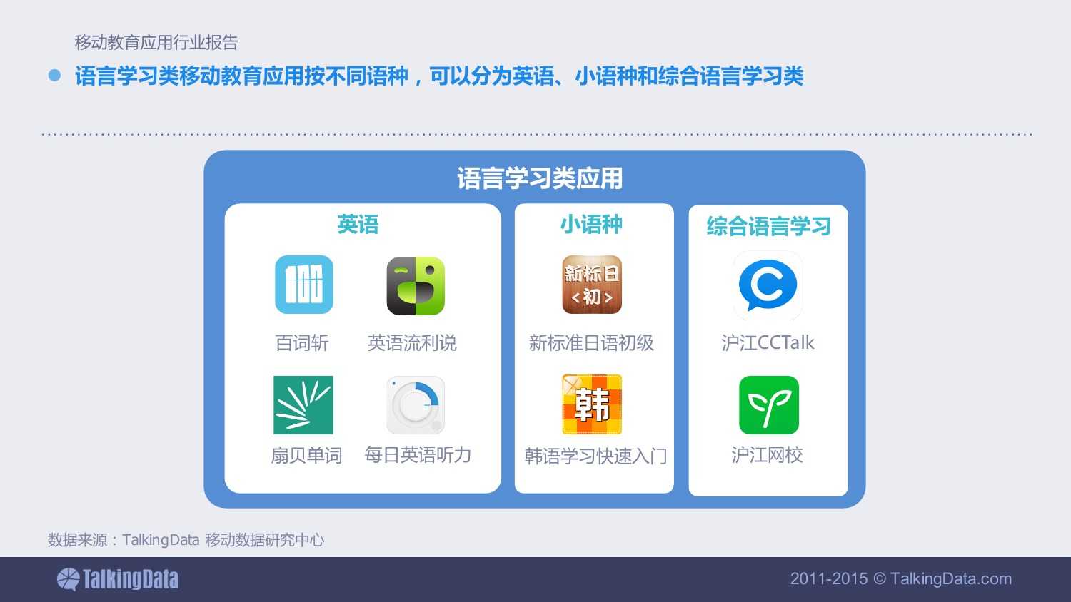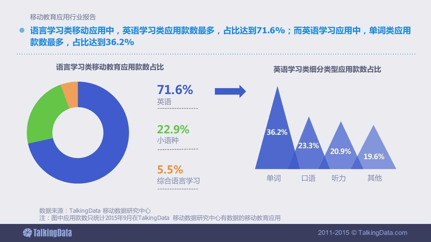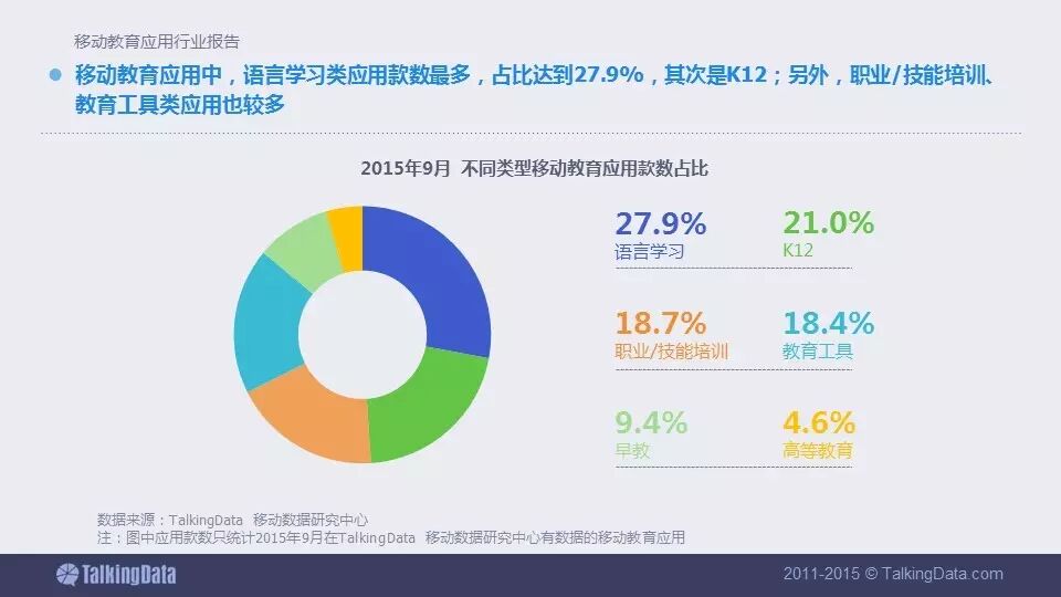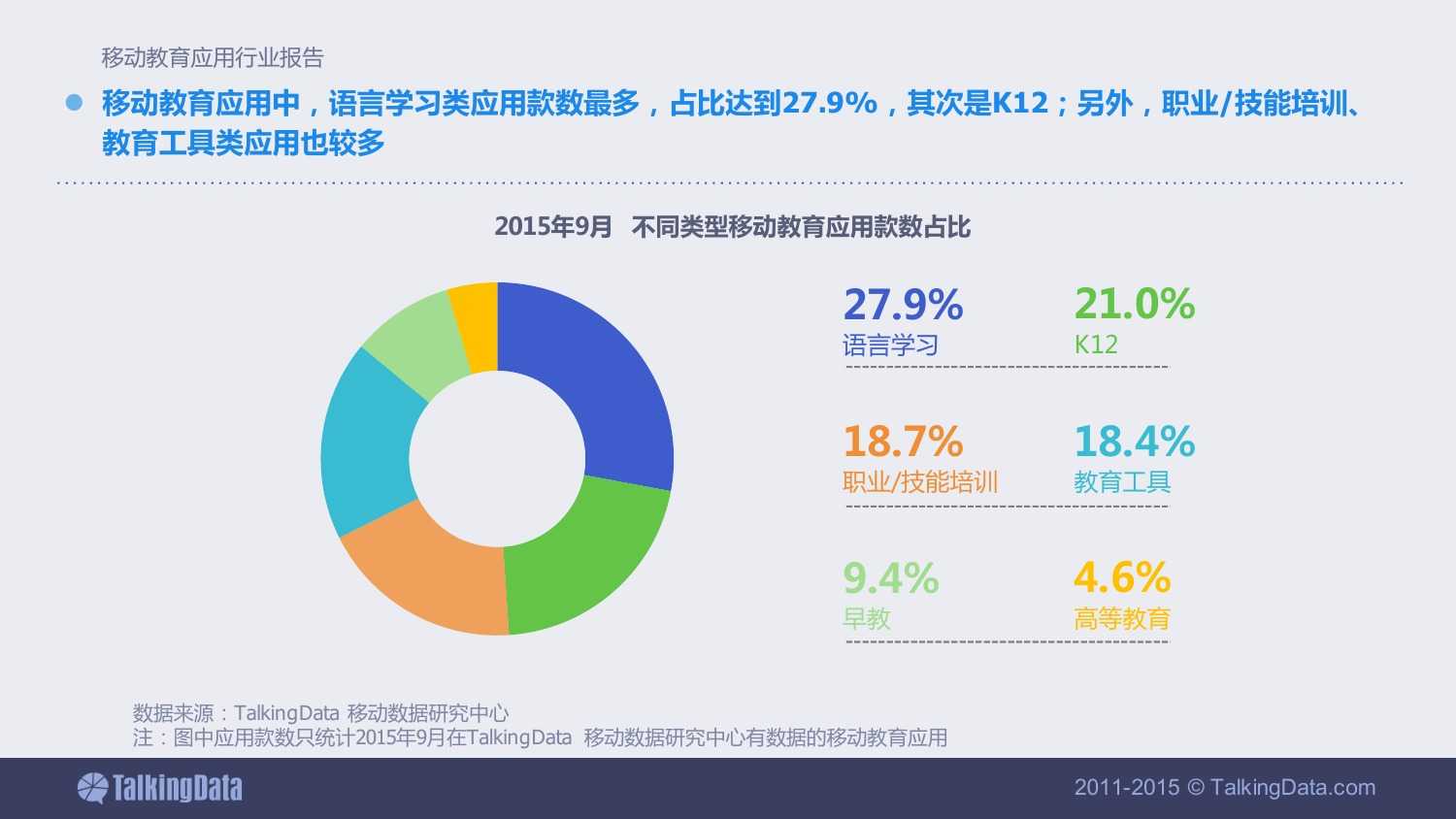 移动教育应用中,语言学习类应用款数最多,占比达到27.9%,其次是K12;另外,职业/技能培训、教育工具类应用也较多。