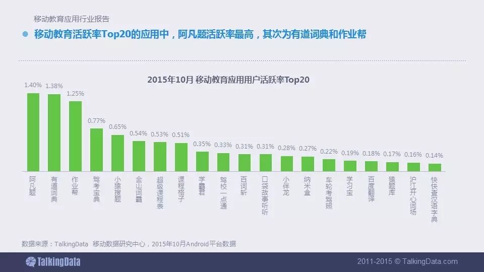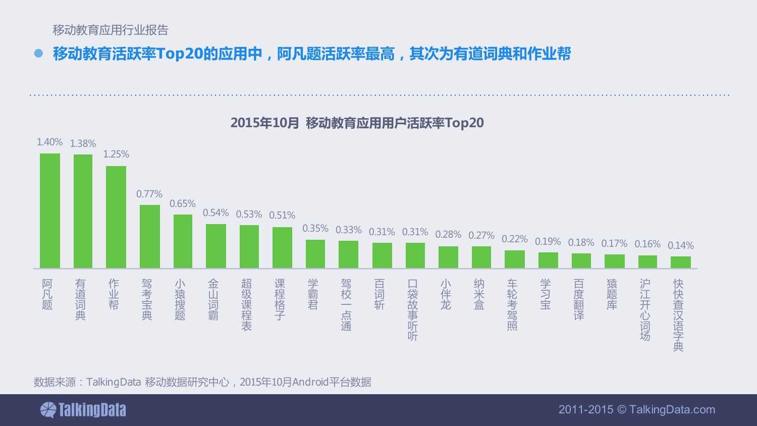 移动教育活跃率Top20的应用中,阿凡题活跃率最高,其次为有道词典和作业帮。